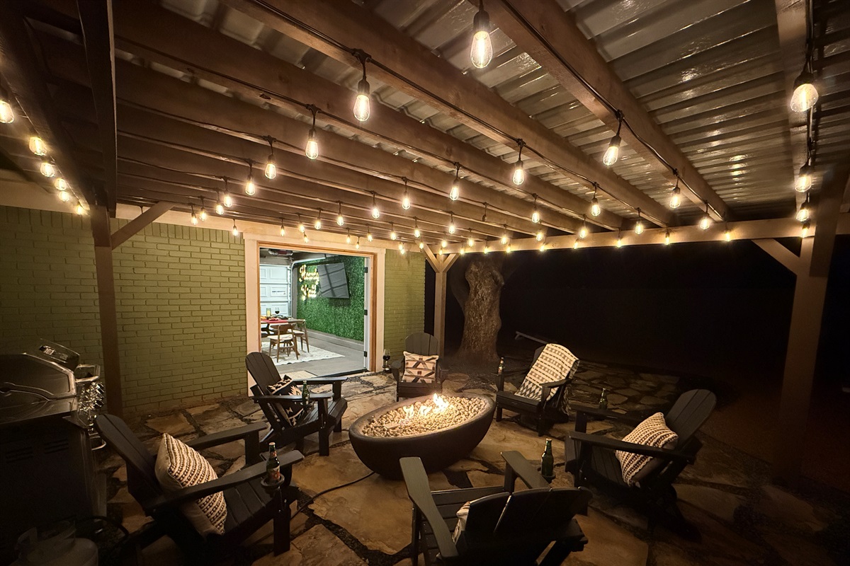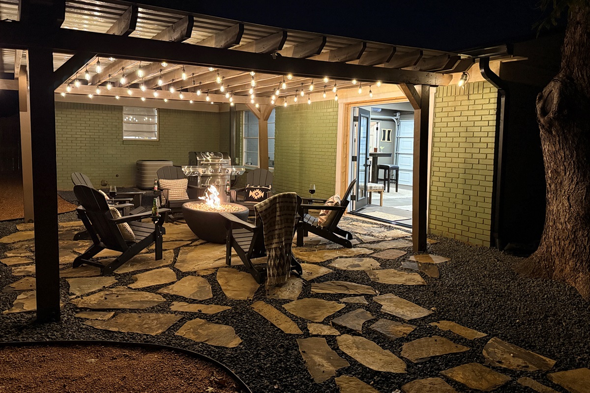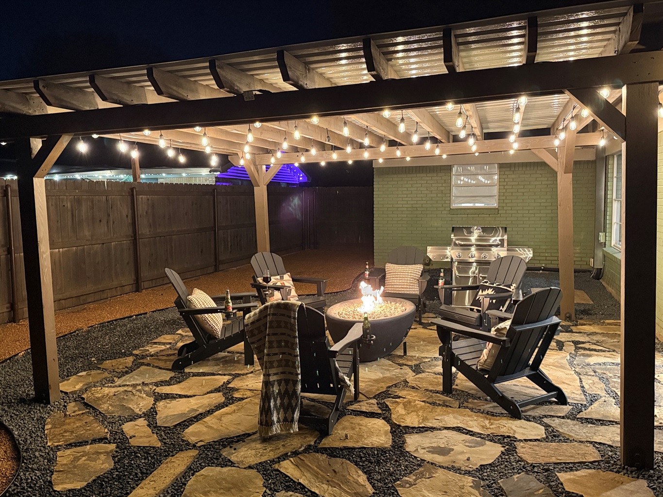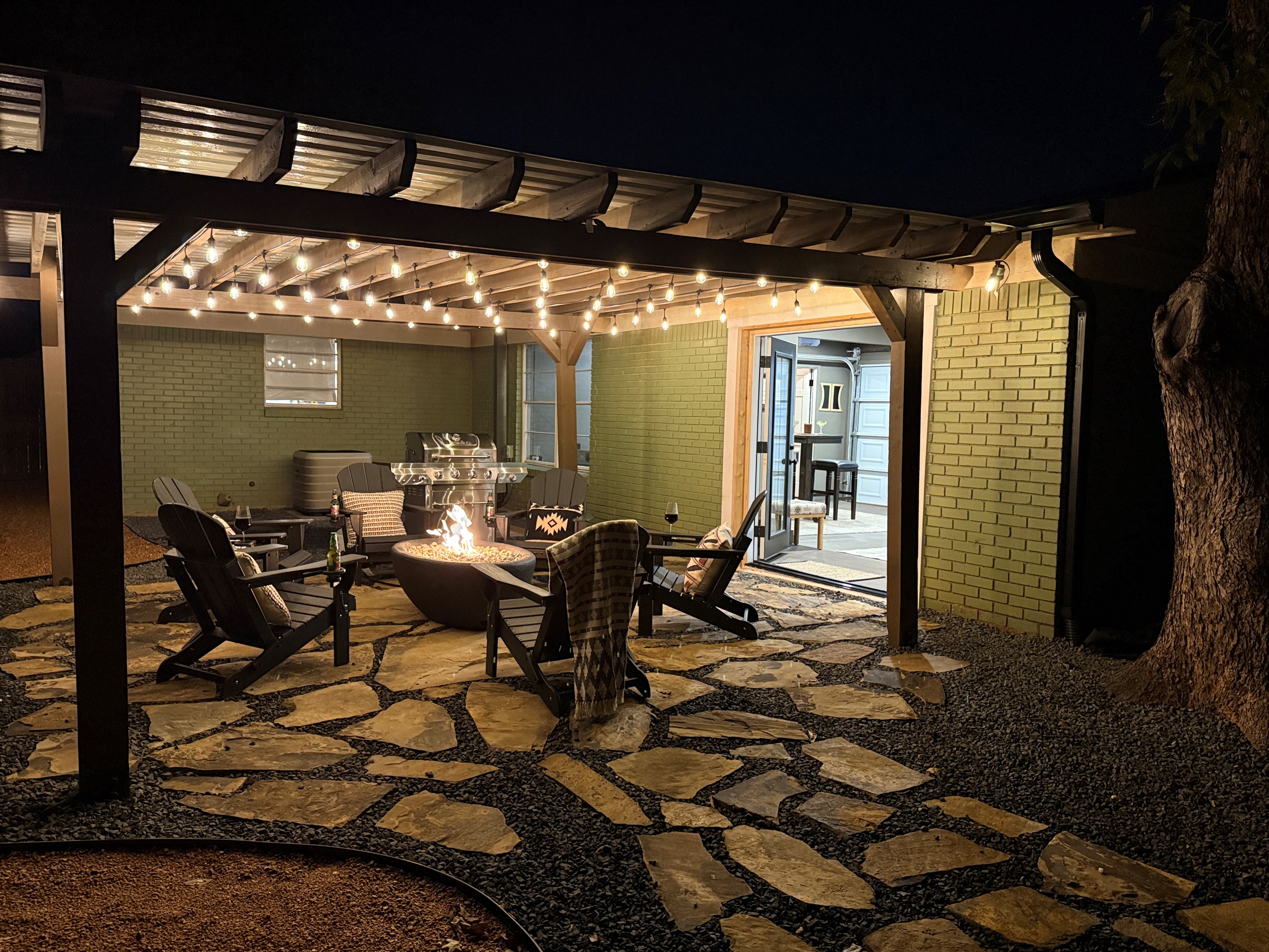 🔥 Fire Pit Oasis – Lighted pergola, 8 Adirondack chairs & twinkling Texas nights