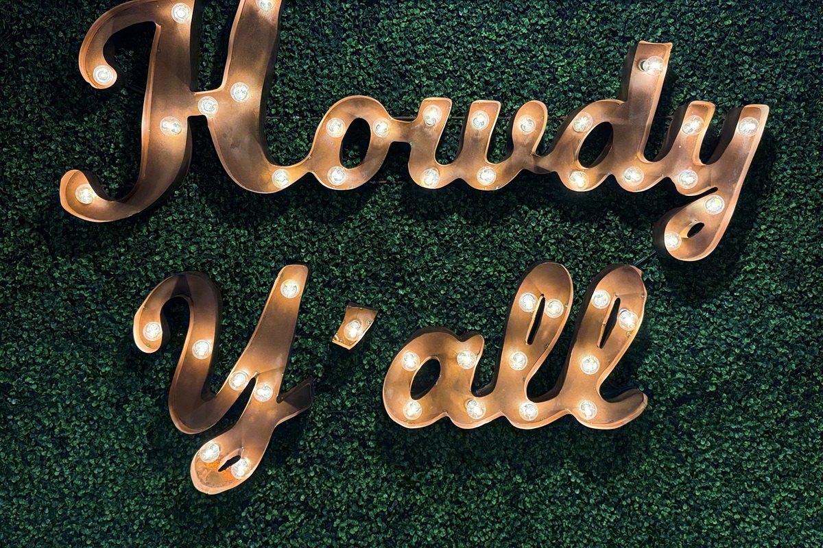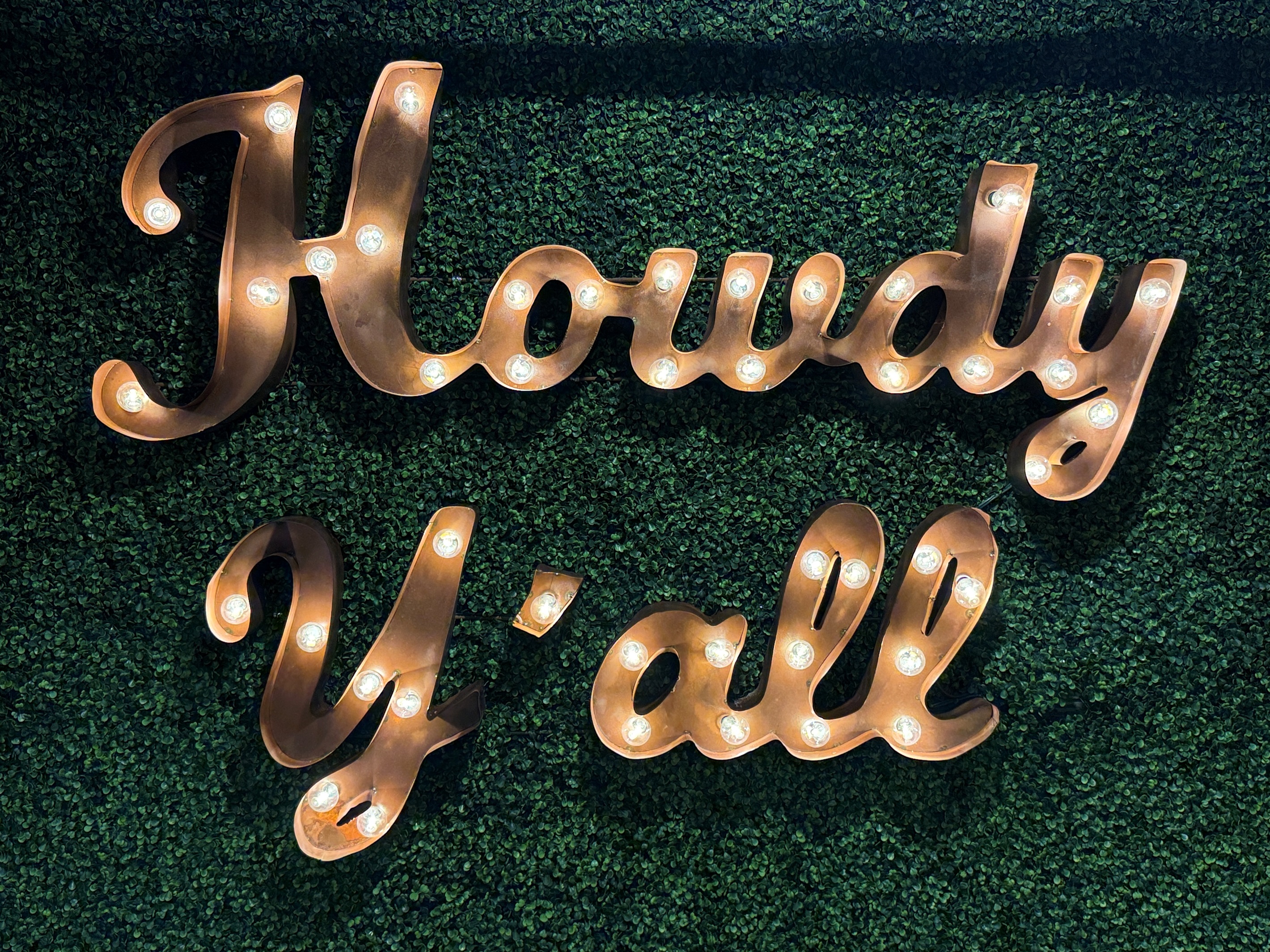 🌵 Modern Western Design – Horse, longhorn & buffalo art + the glowing “Howdy Y’all” sign for perfect photos
