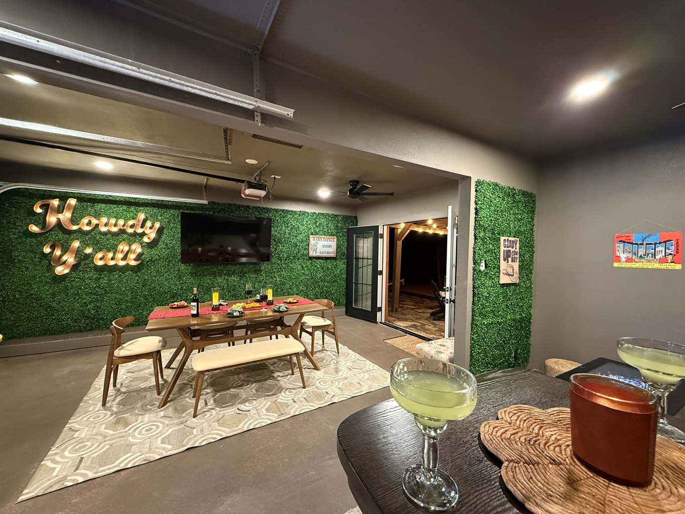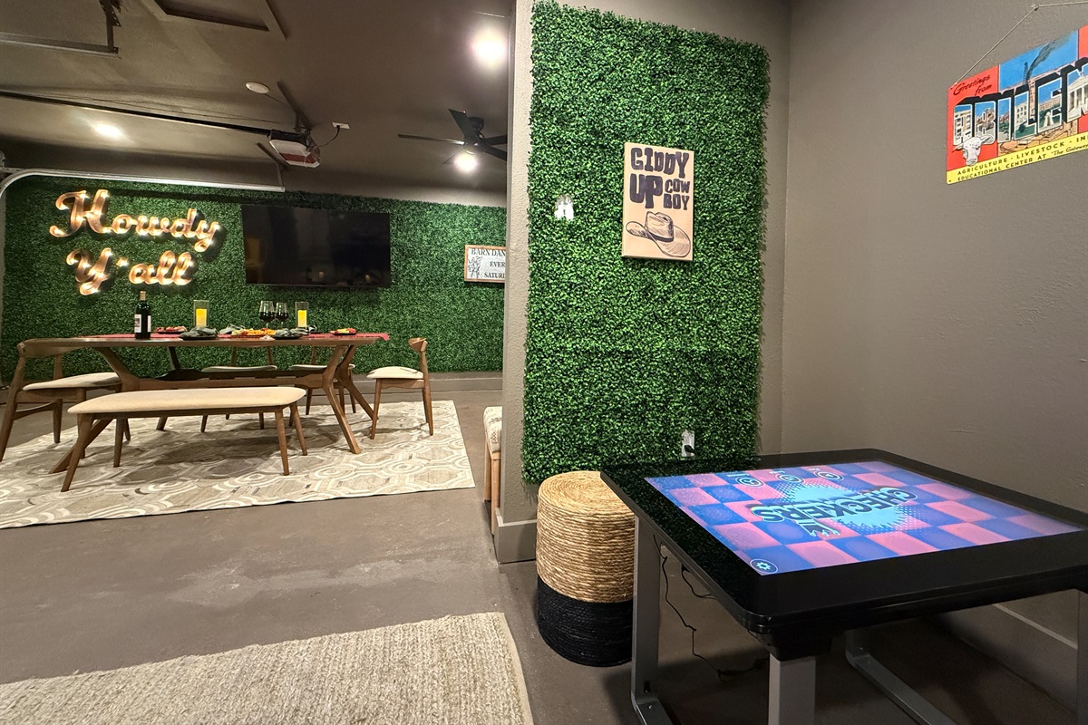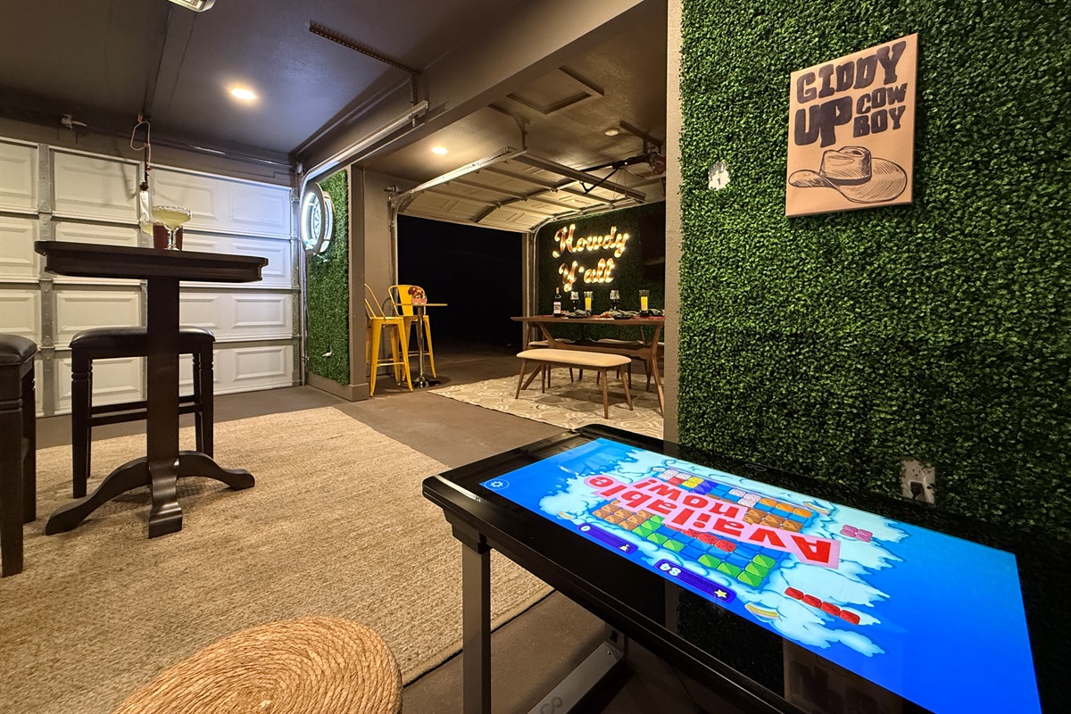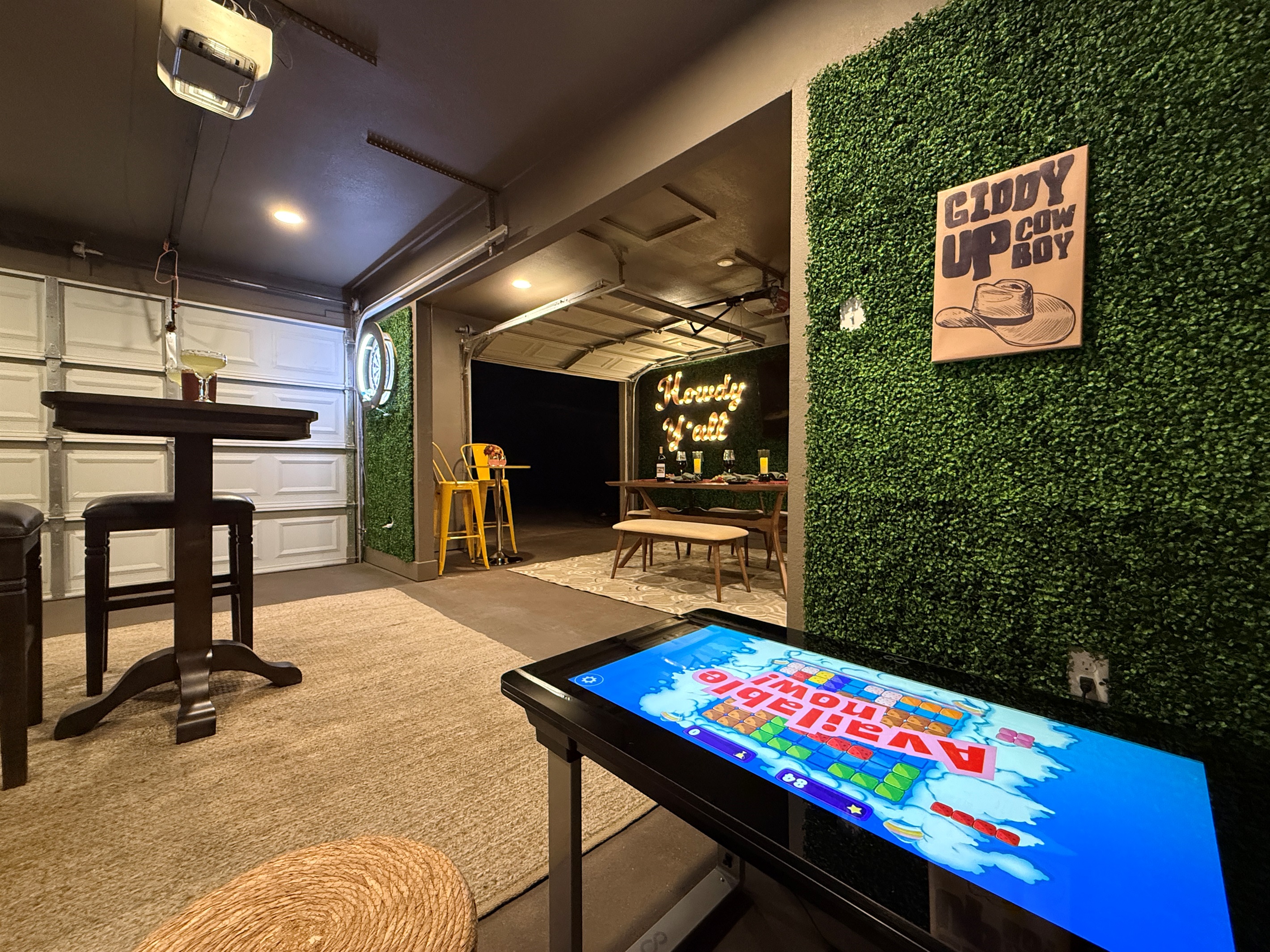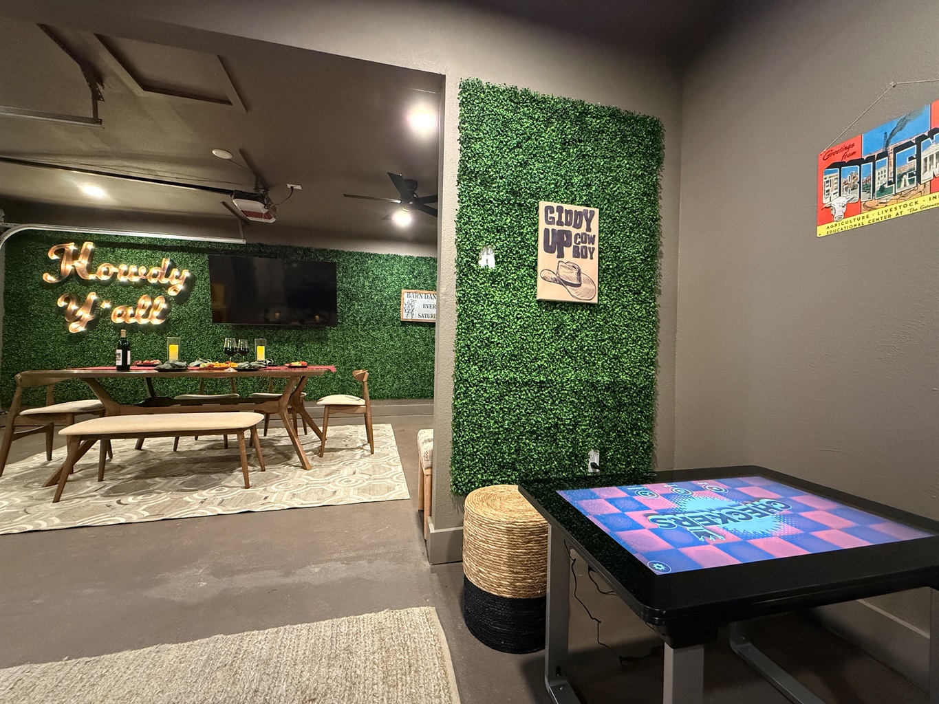 Inside, you’ll find warm wood tones, longhorn and buffalo art, and that signature “Howdy Y’all” glow — a photo-worthy nod to Abilene’s frontier roots. Gather for laughter and games in the epic entertainment room, featuring a full shuffleboard table, Infinity Game Table, and a massive smart TV for movie nights or sports weekends.