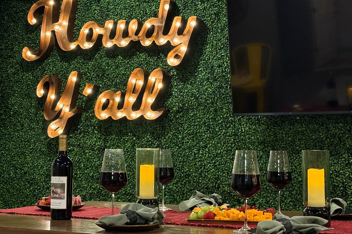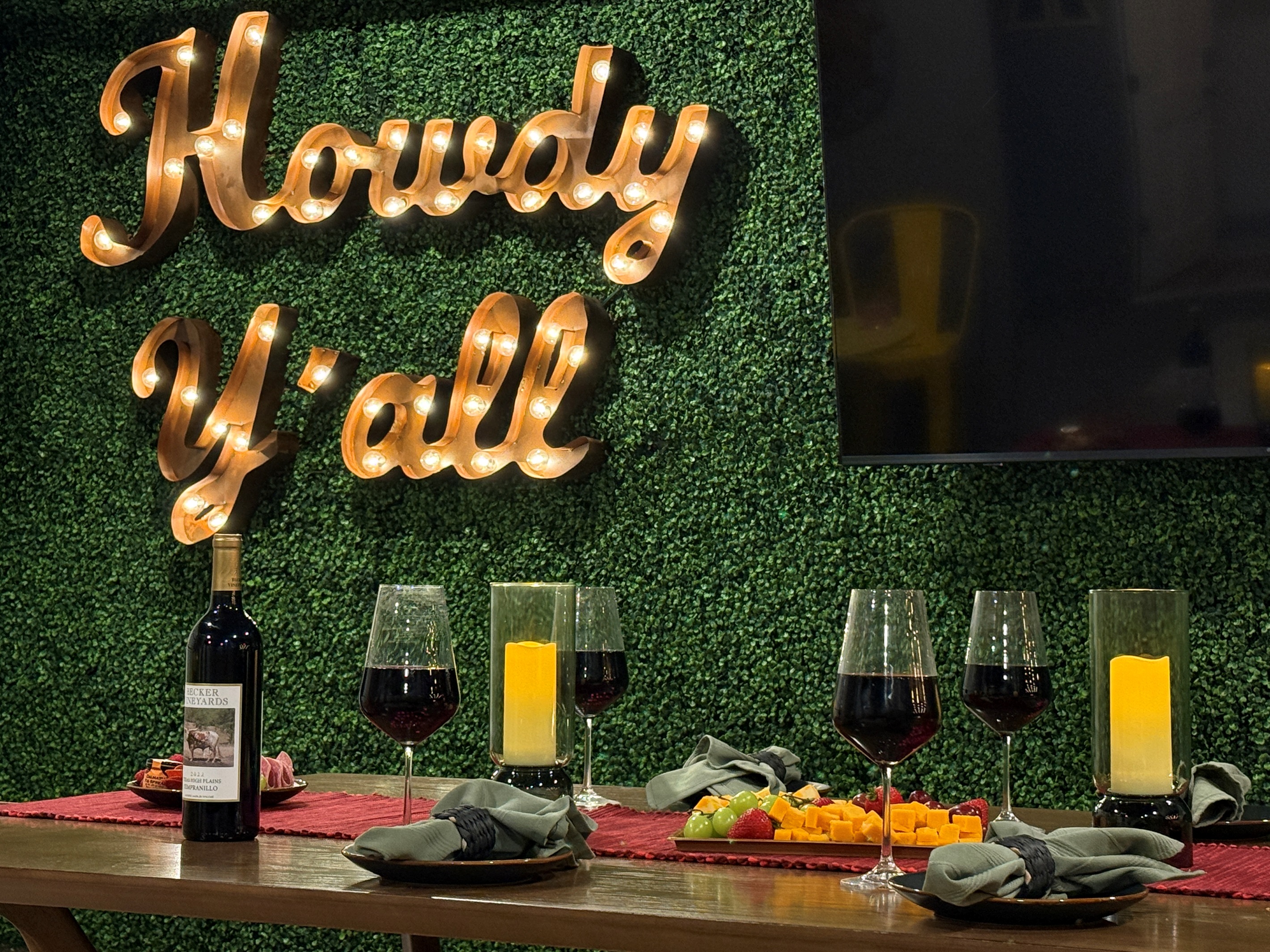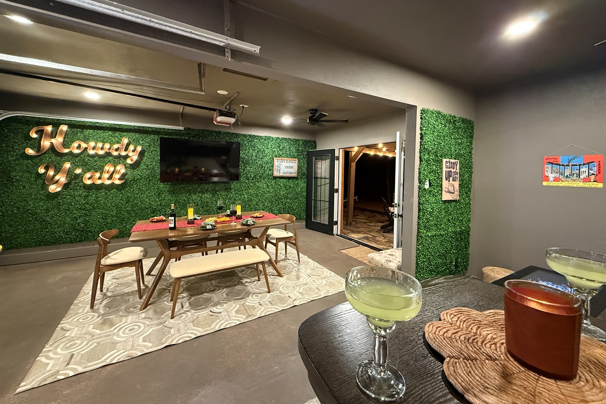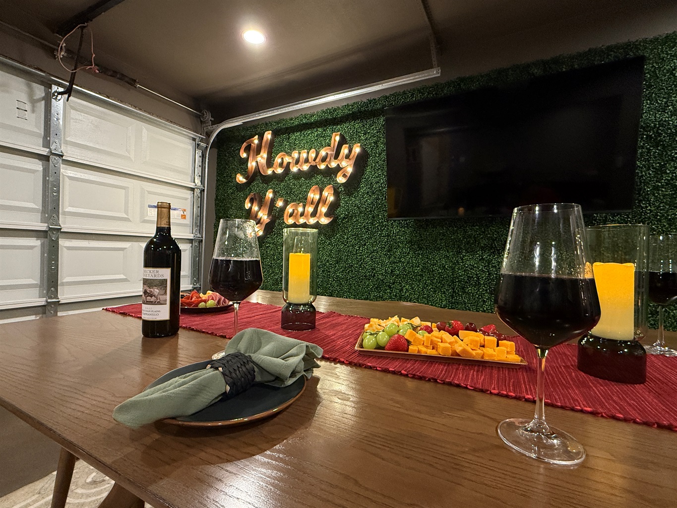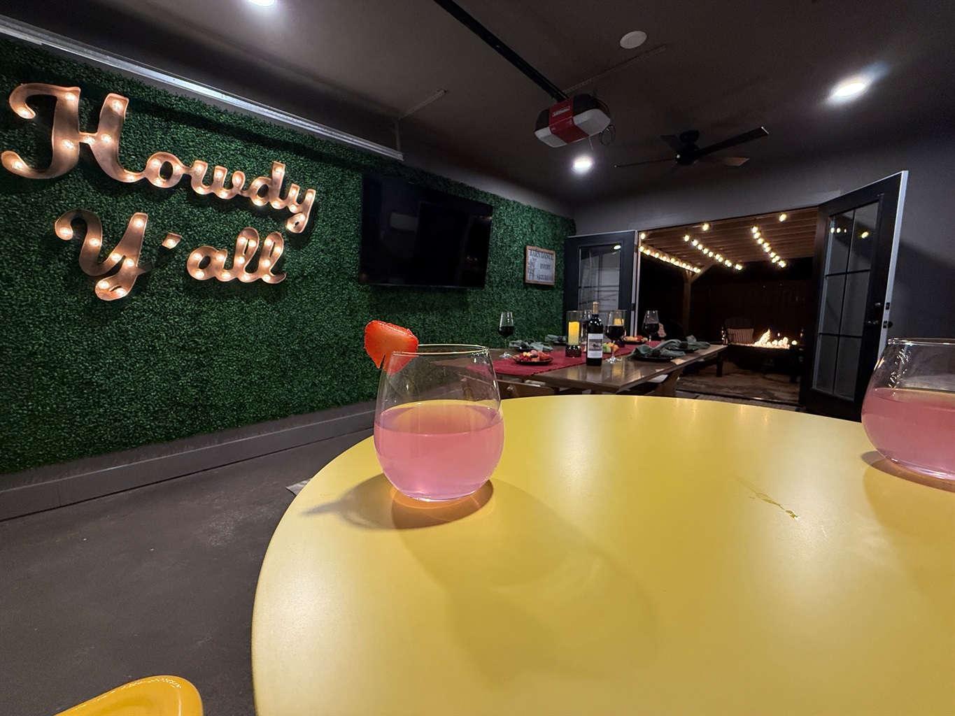 Inside, you’ll find warm wood tones, longhorn and buffalo art, and that signature “Howdy Y’all” glow — a photo-worthy nod to Abilene’s frontier roots. Gather for laughter and games in the epic entertainment room, featuring a full shuffleboard table, Infinity Game Table, and a massive smart TV for movie nights or sports weekends.