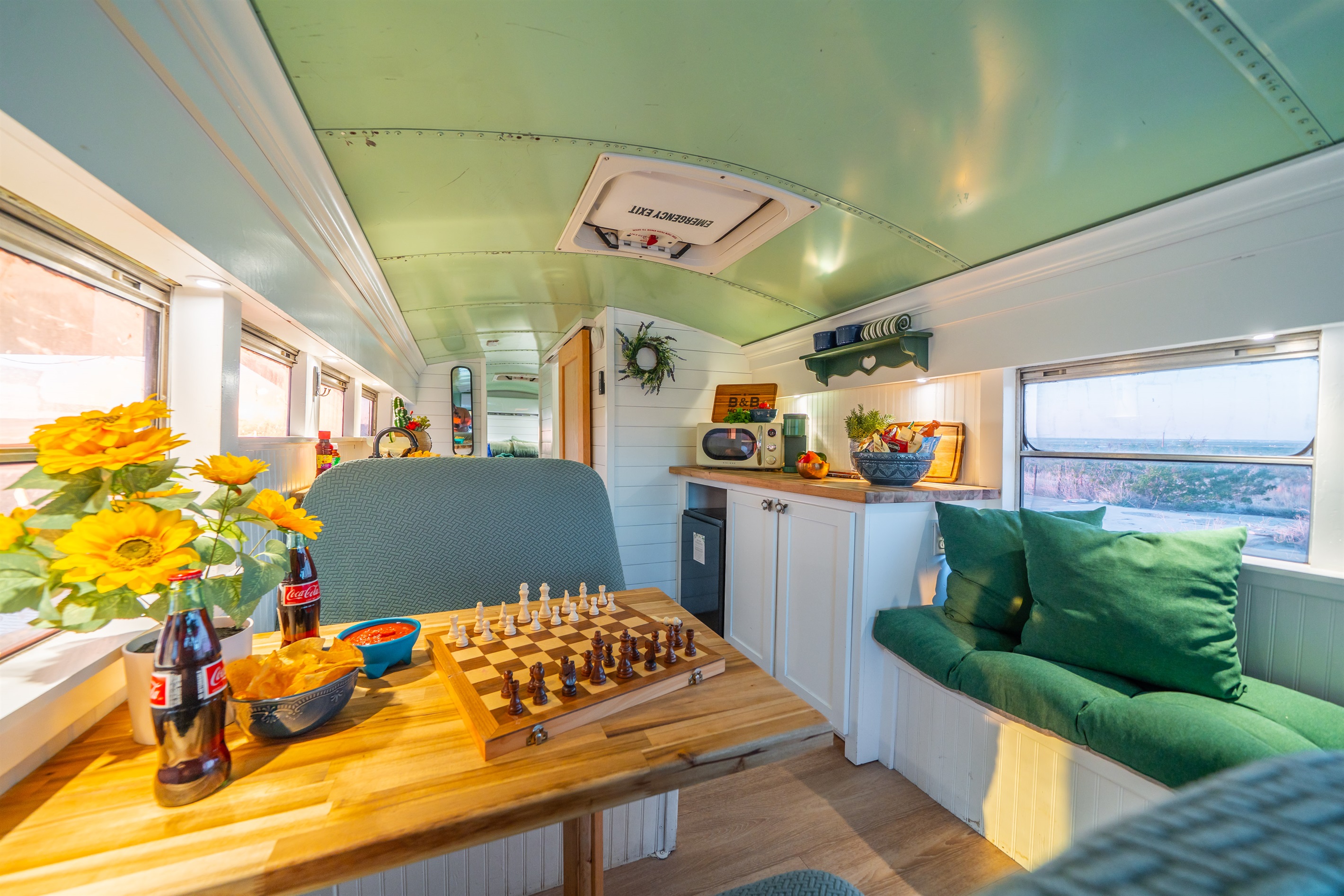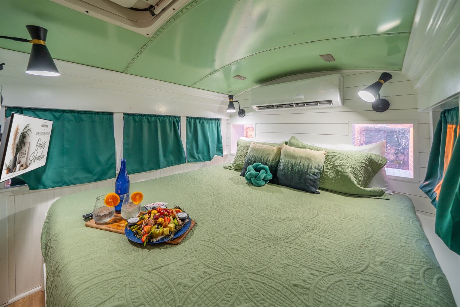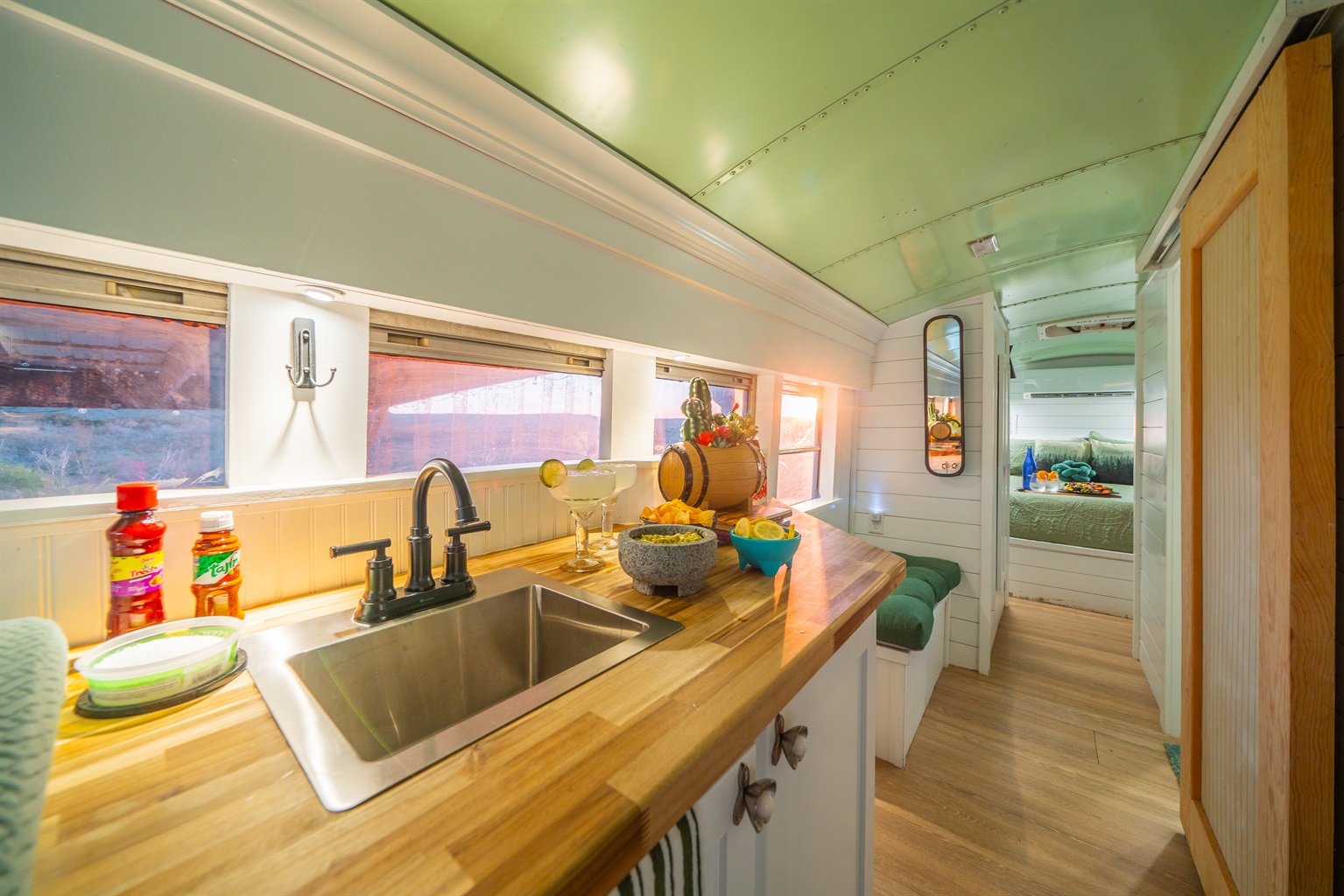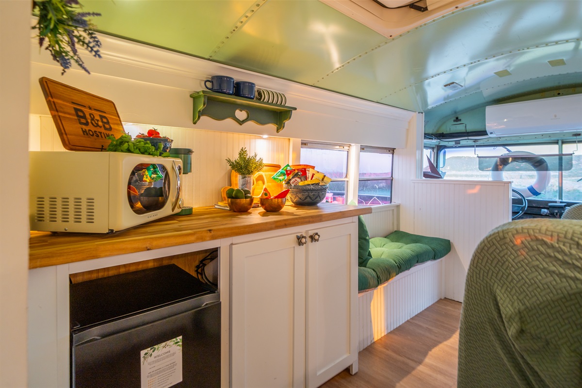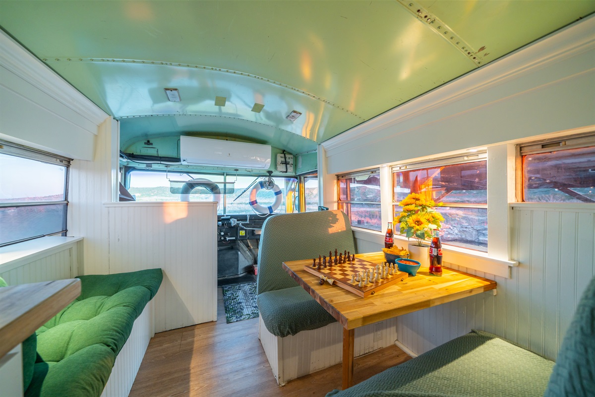 We converted an old school bus into a tiny home that packs a punch. King sized bed, mini kitchen, dining area, and bathroom with shower. Don’t let the small size fool you, it is cozy and comfortable!