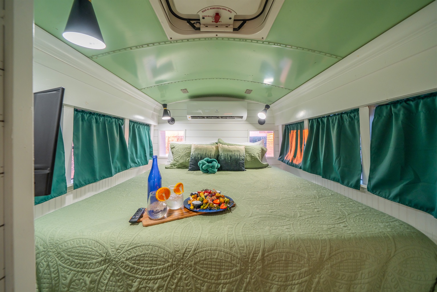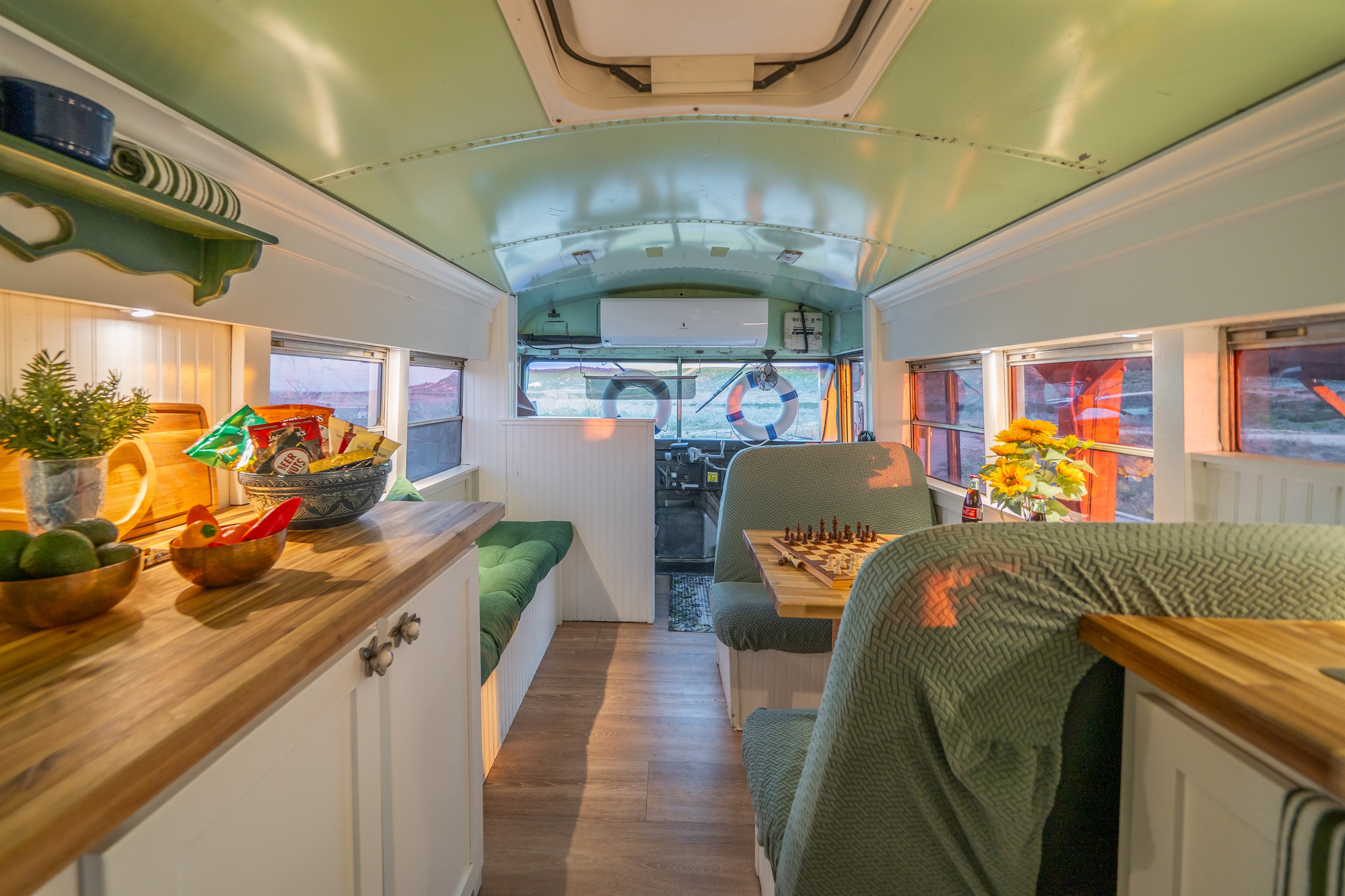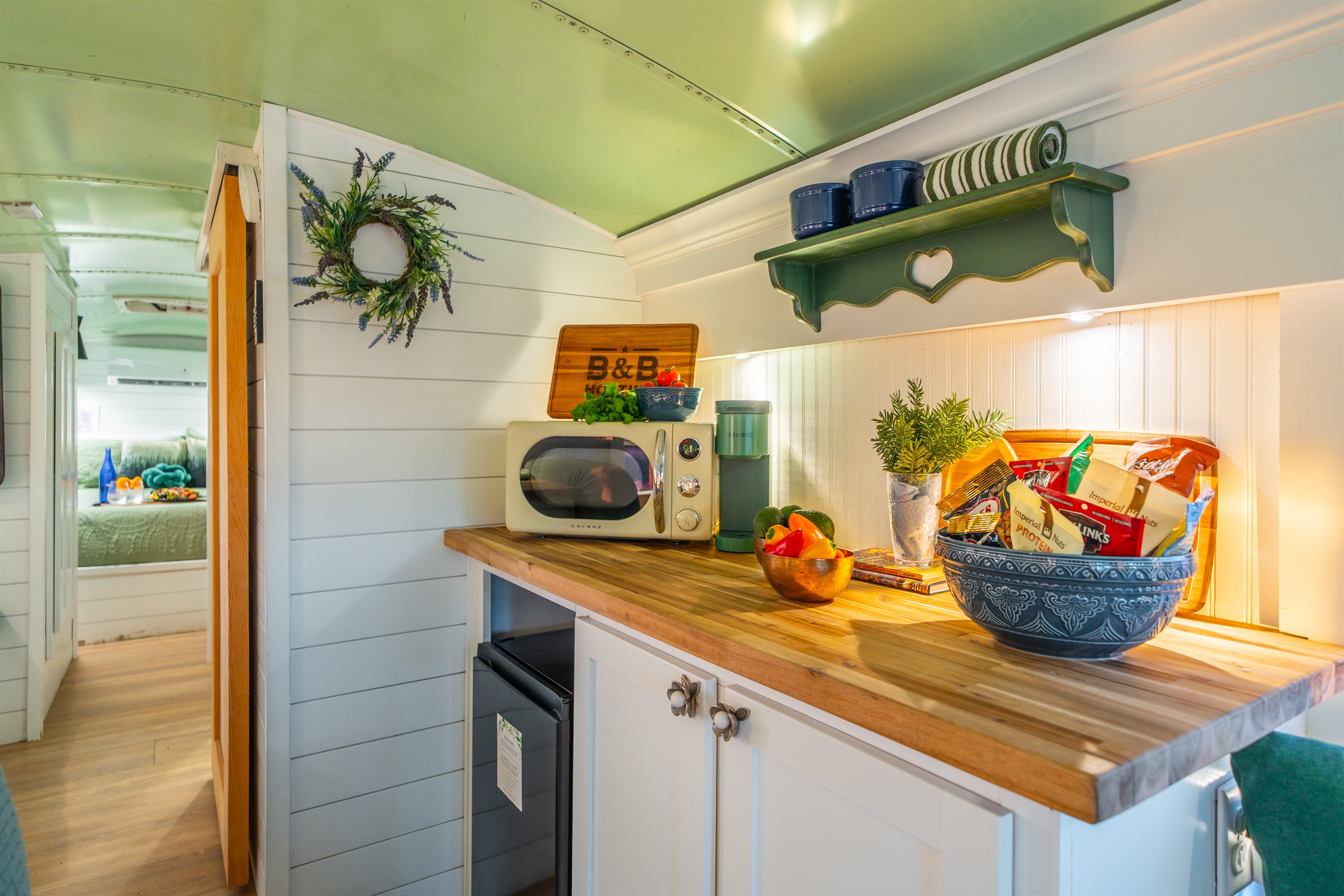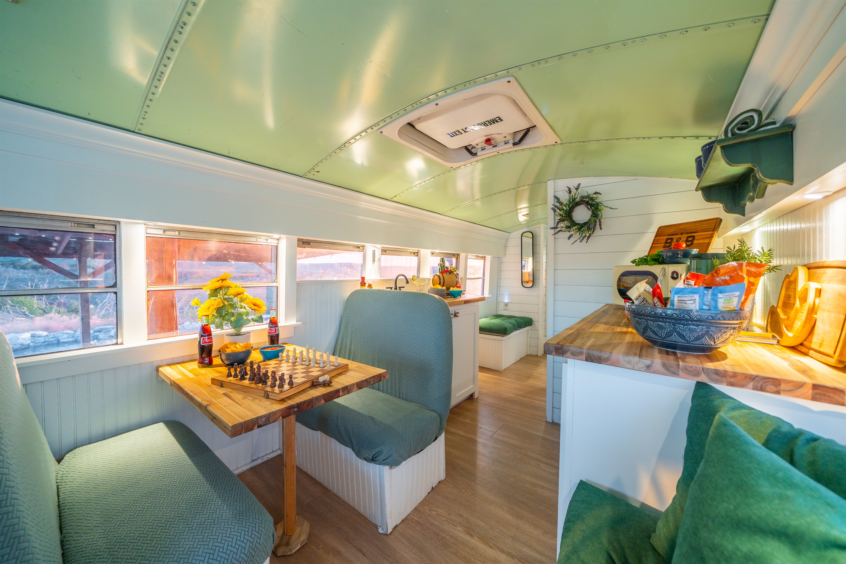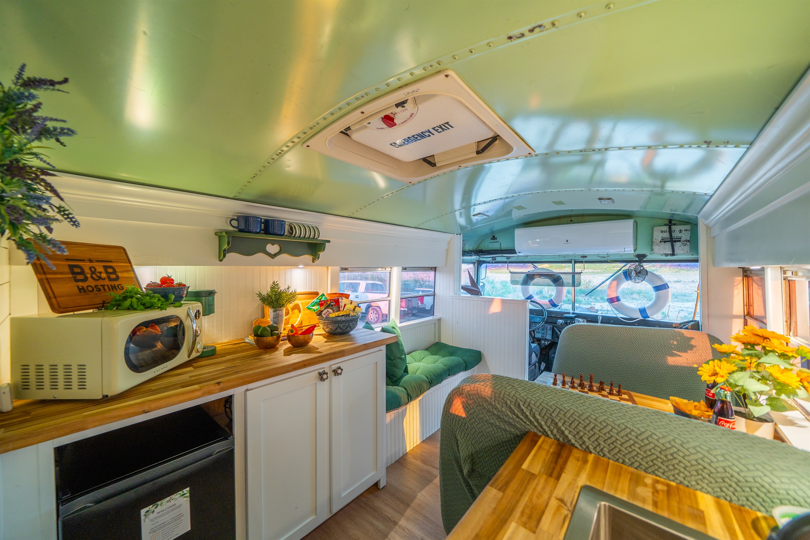 We converted an old school bus into a tiny home that packs a punch. King sized bed, mini kitchen, dining area, and bathroom with shower. Don’t let the small size fool you, it is cozy and comfortable!