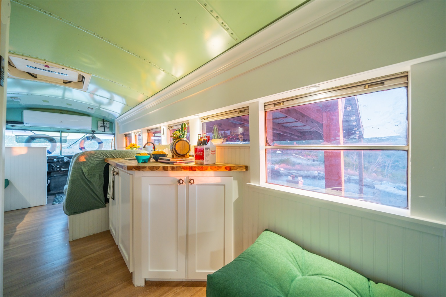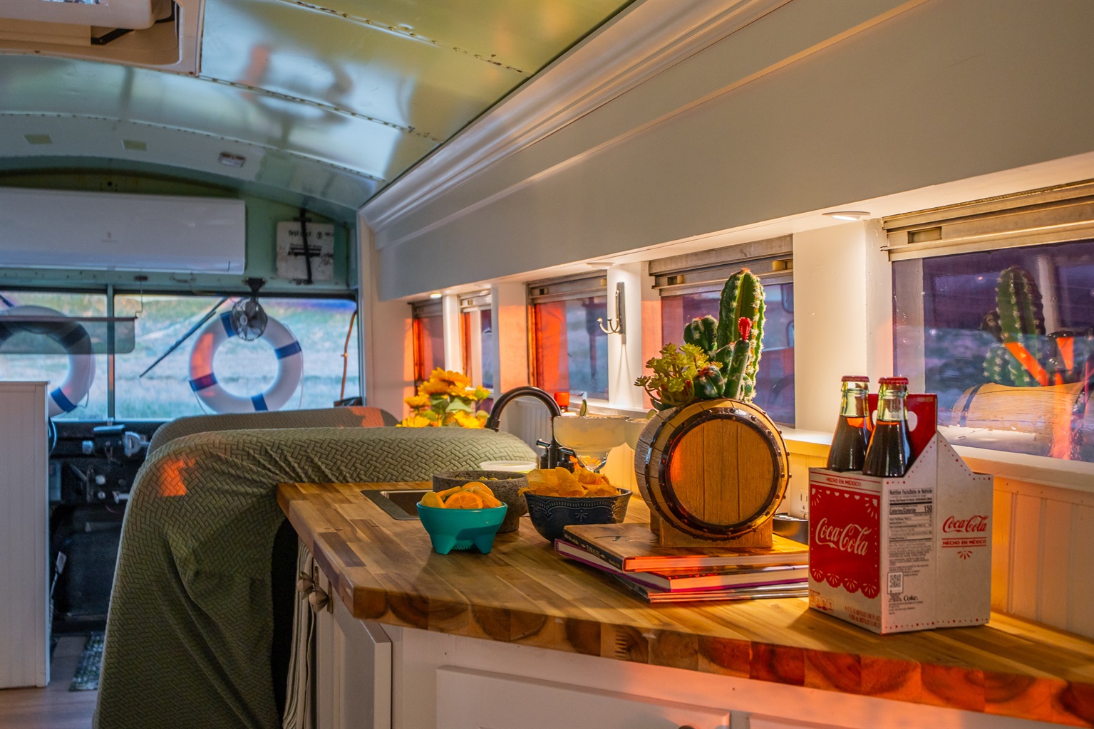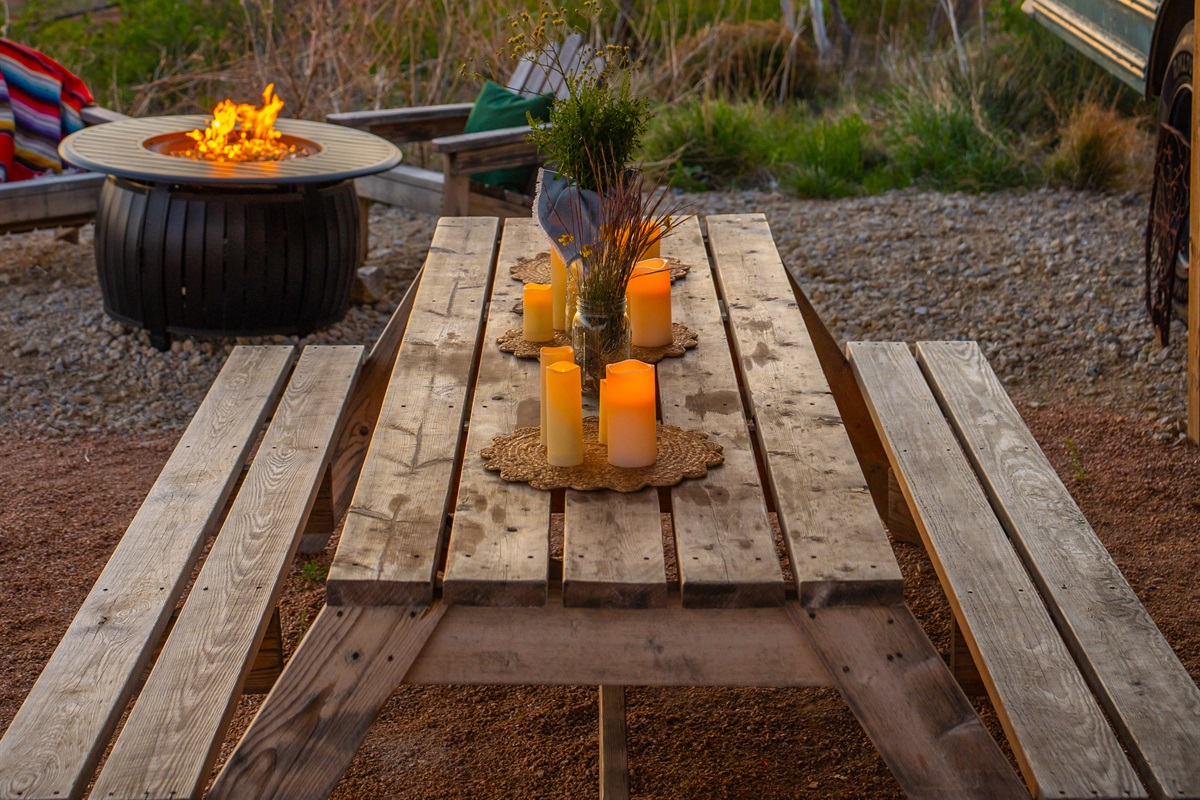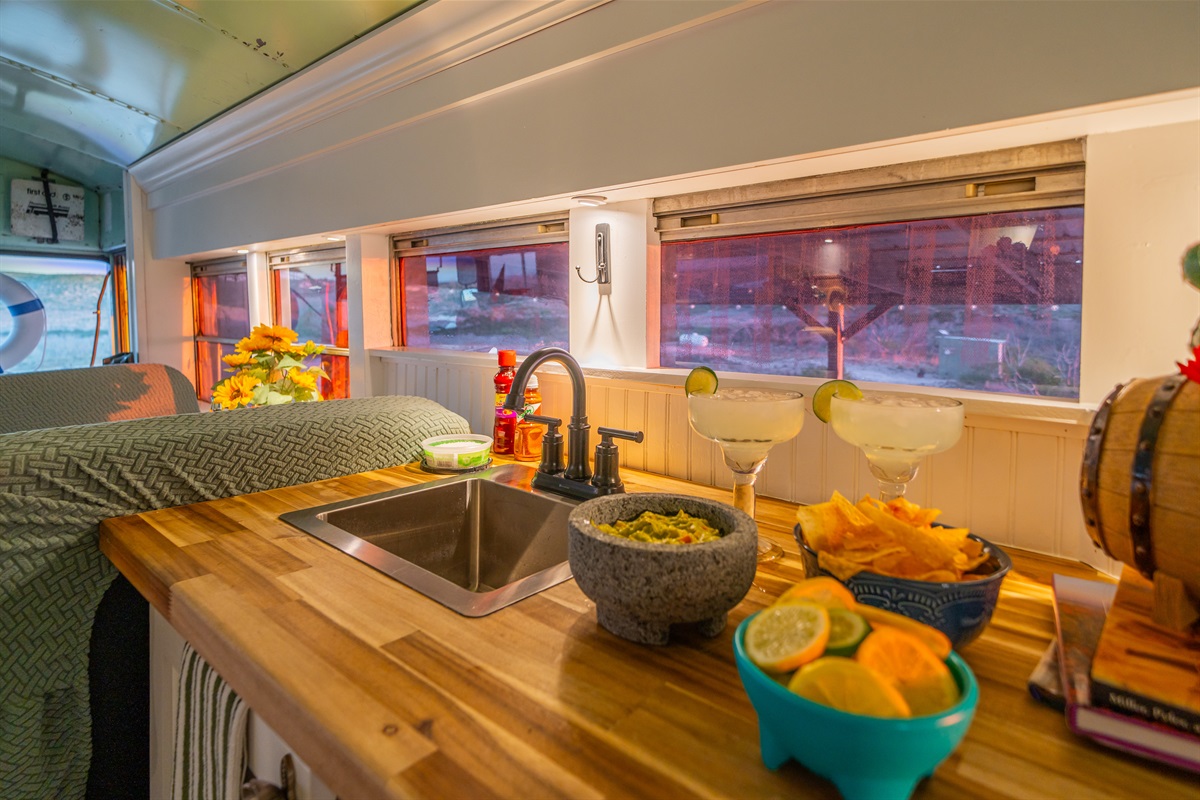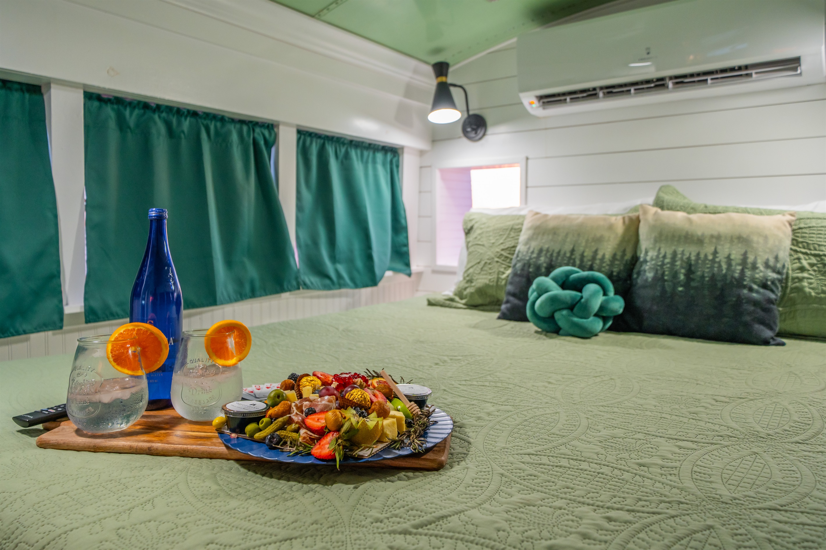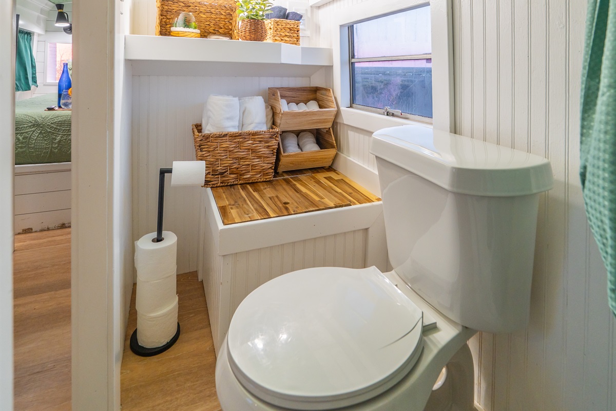 We converted an old school bus into a tiny home that packs a punch. King sized bed, mini kitchen, dining area, and bathroom with shower. Don’t let the small size fool you, it is cozy and comfortable!
