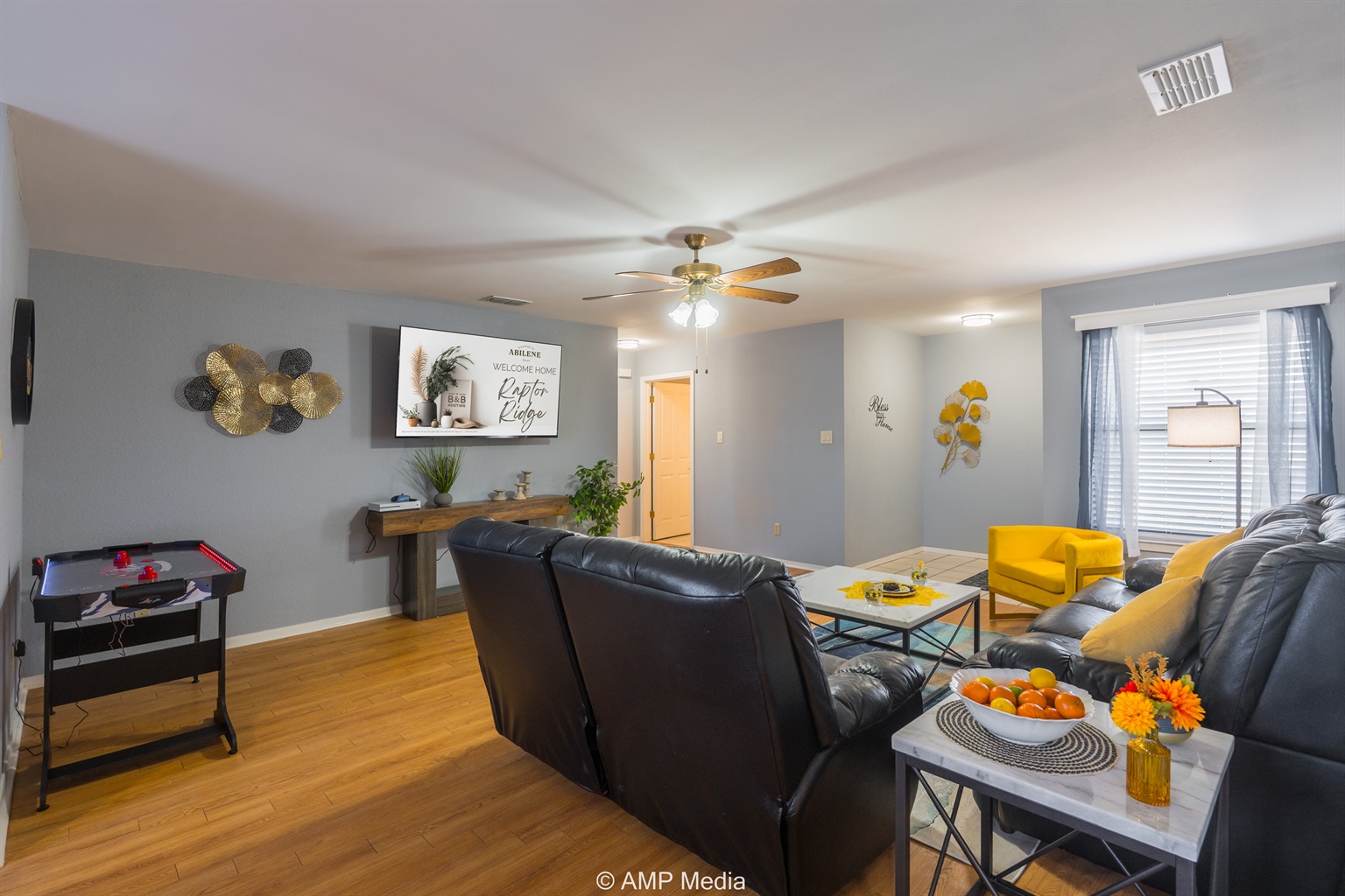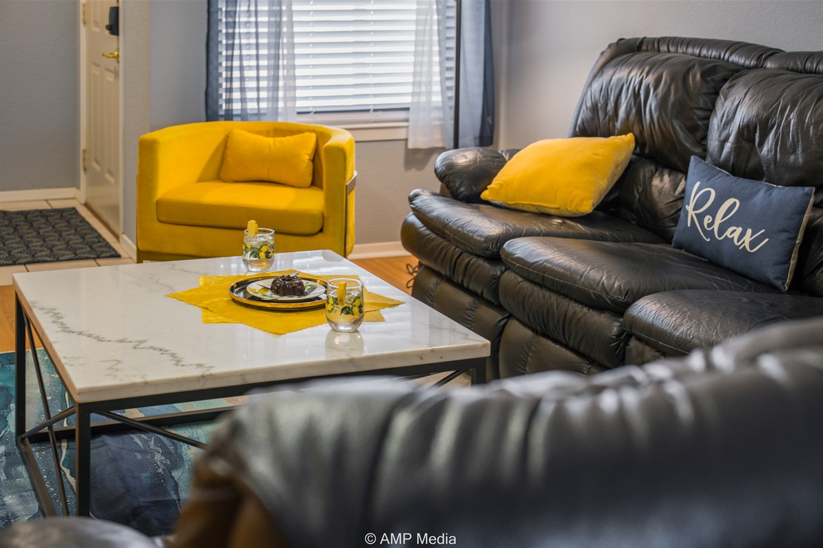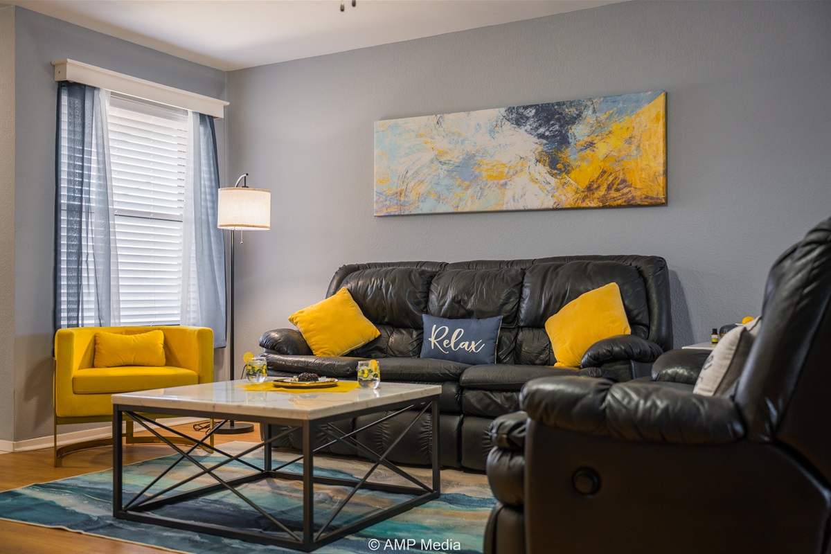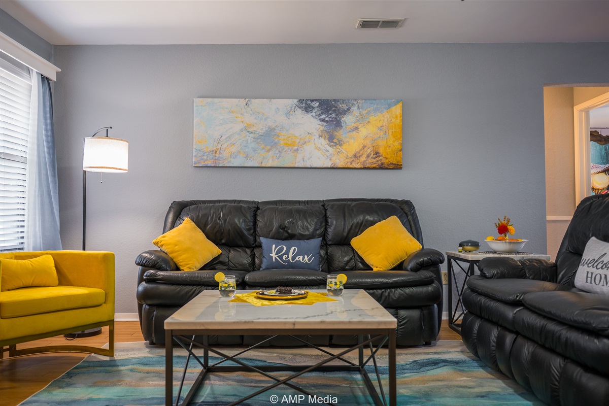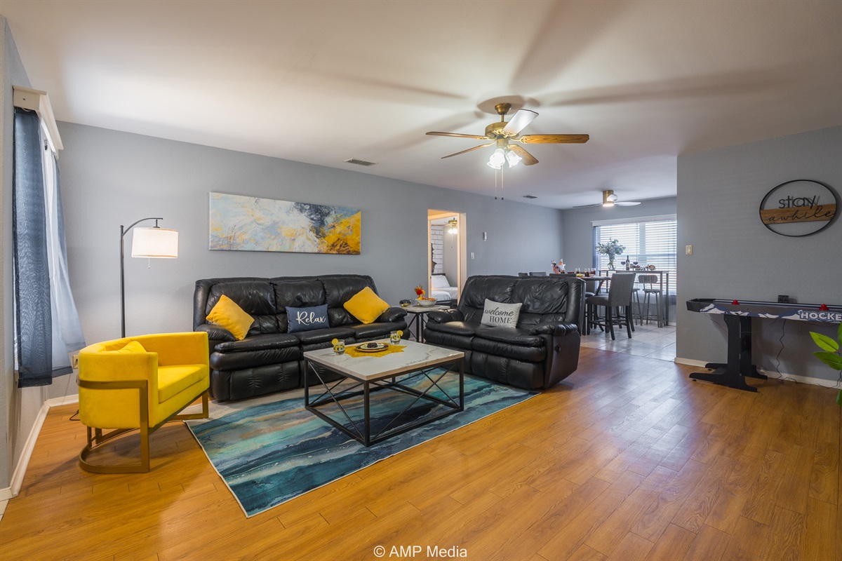 Gather in the spacious living room featuring plush black leather reclining sofas perfect for movie nights after a day of exploration. A vibrant blue abstract area rug anchors the seating area, while pops of sunshine yellow (including a stylish modern accent chair) add energy to the space. The room opens seamlessly to the dining area and kitchen, making it ideal for keeping everyone connected. Entertainment options include a wall-mounted flat-screen TV and a full-size air hockey table with LED lighting for friendly tournaments.