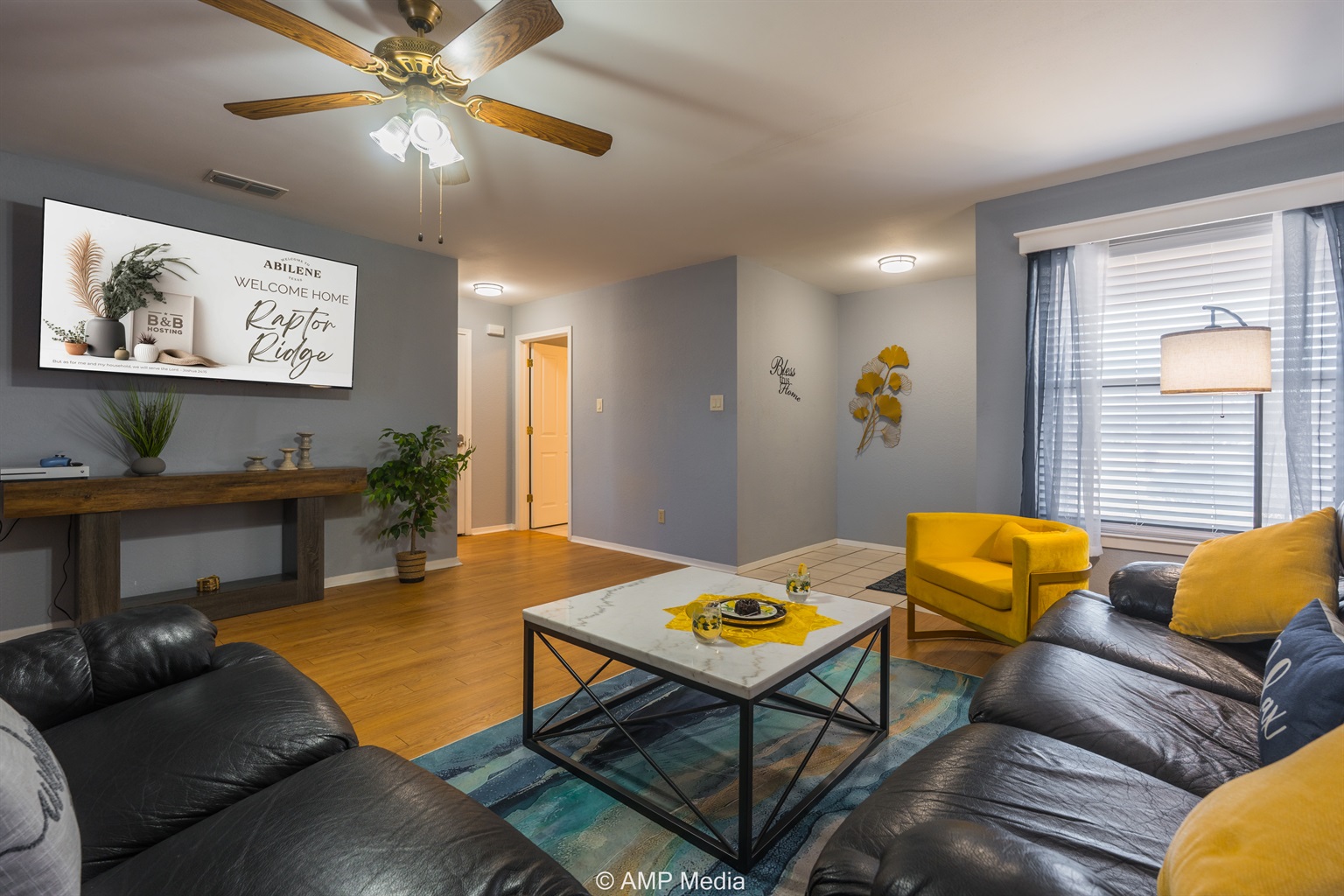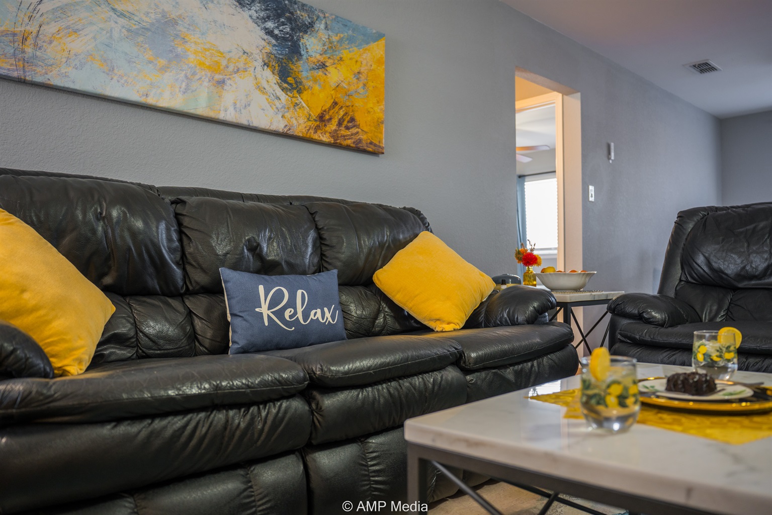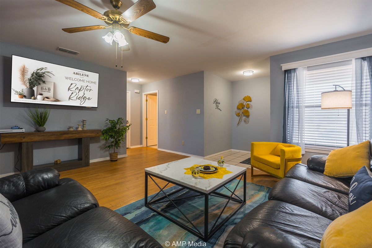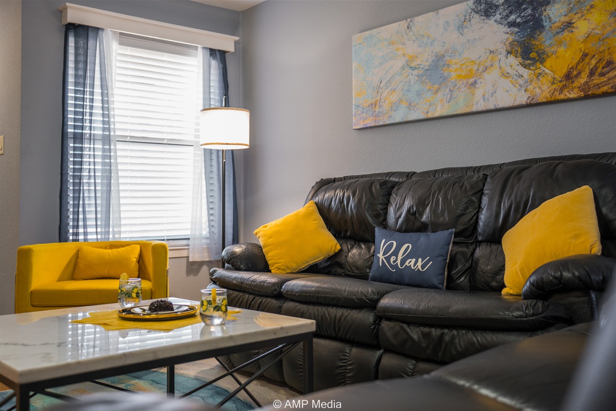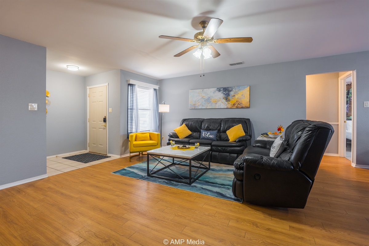 Gather in the spacious living room featuring plush black leather reclining sofas perfect for movie nights after a day of exploration. A vibrant blue abstract area rug anchors the seating area, while pops of sunshine yellow (including a stylish modern accent chair) add energy to the space. The room opens seamlessly to the dining area and kitchen, making it ideal for keeping everyone connected. Entertainment options include a wall-mounted flat-screen TV and a full-size air hockey table with LED lighting for friendly tournaments.