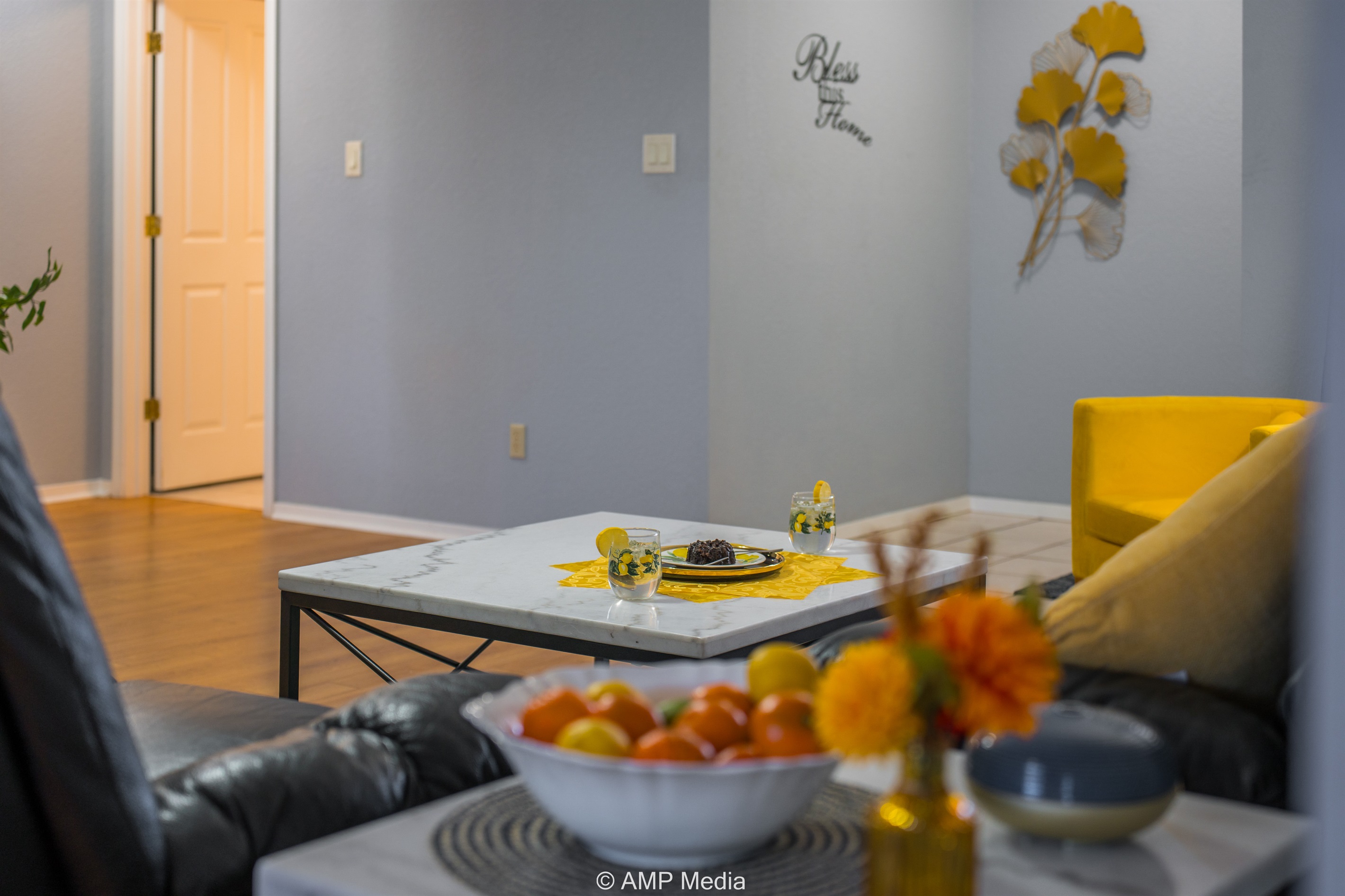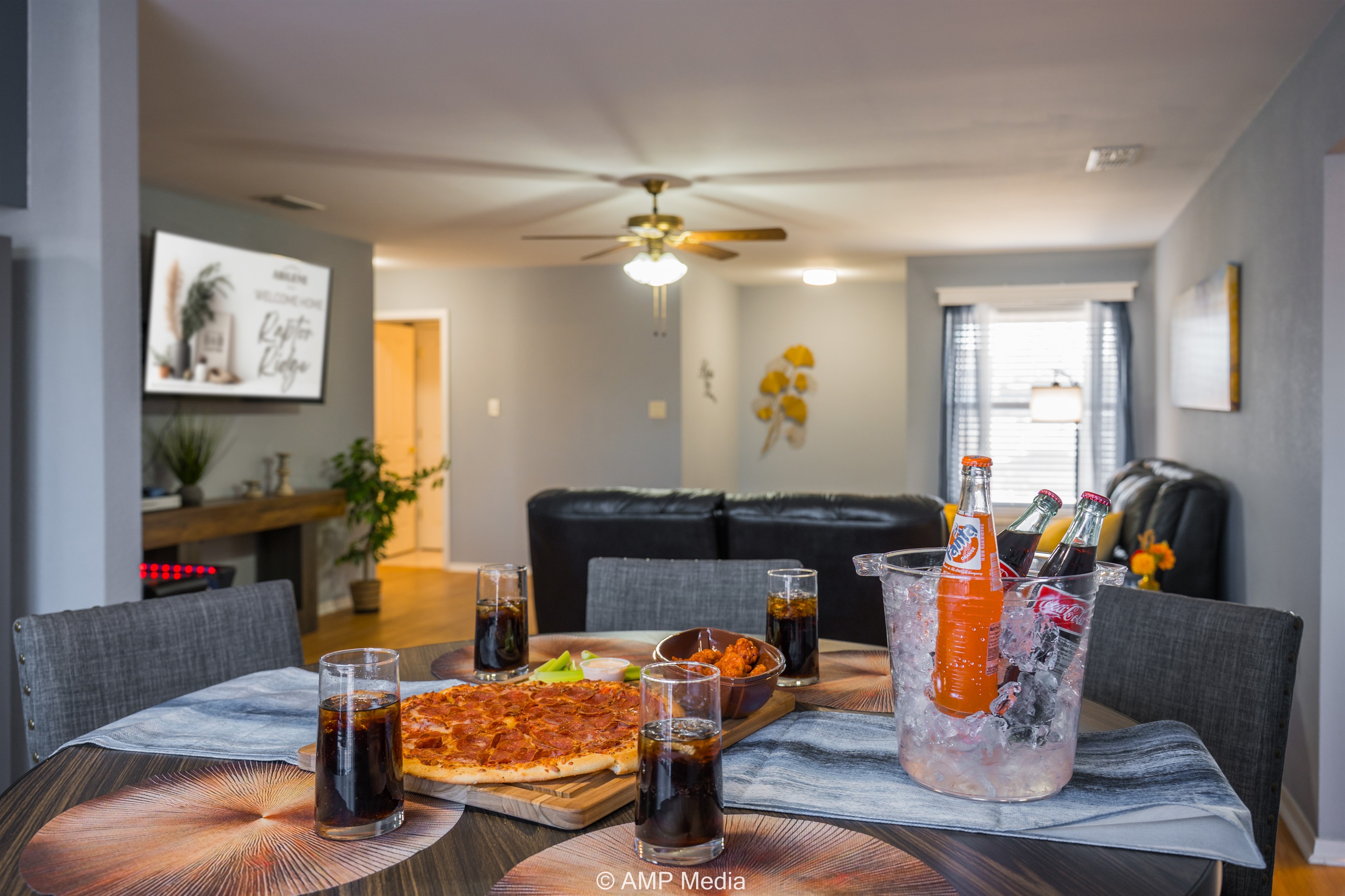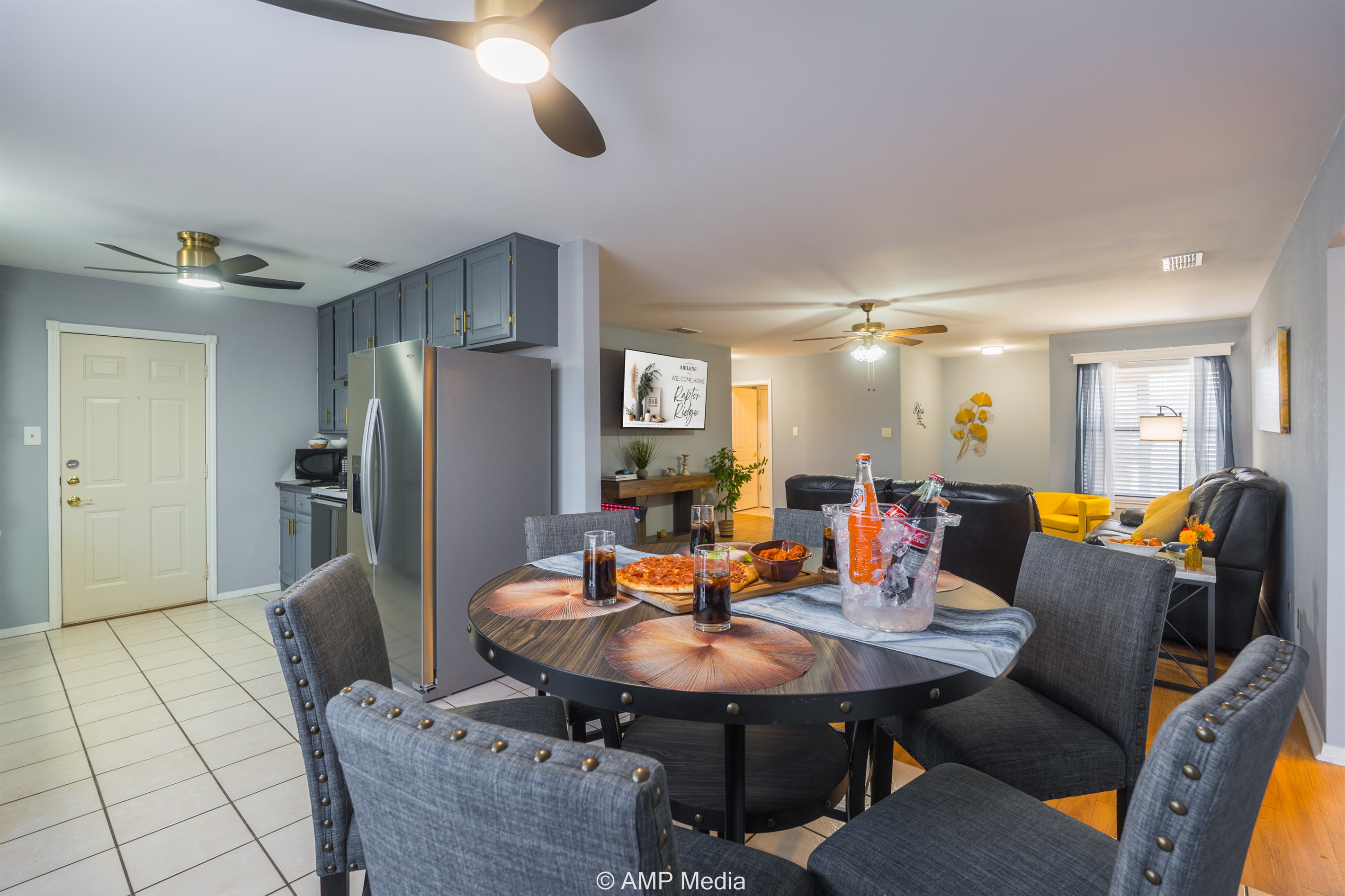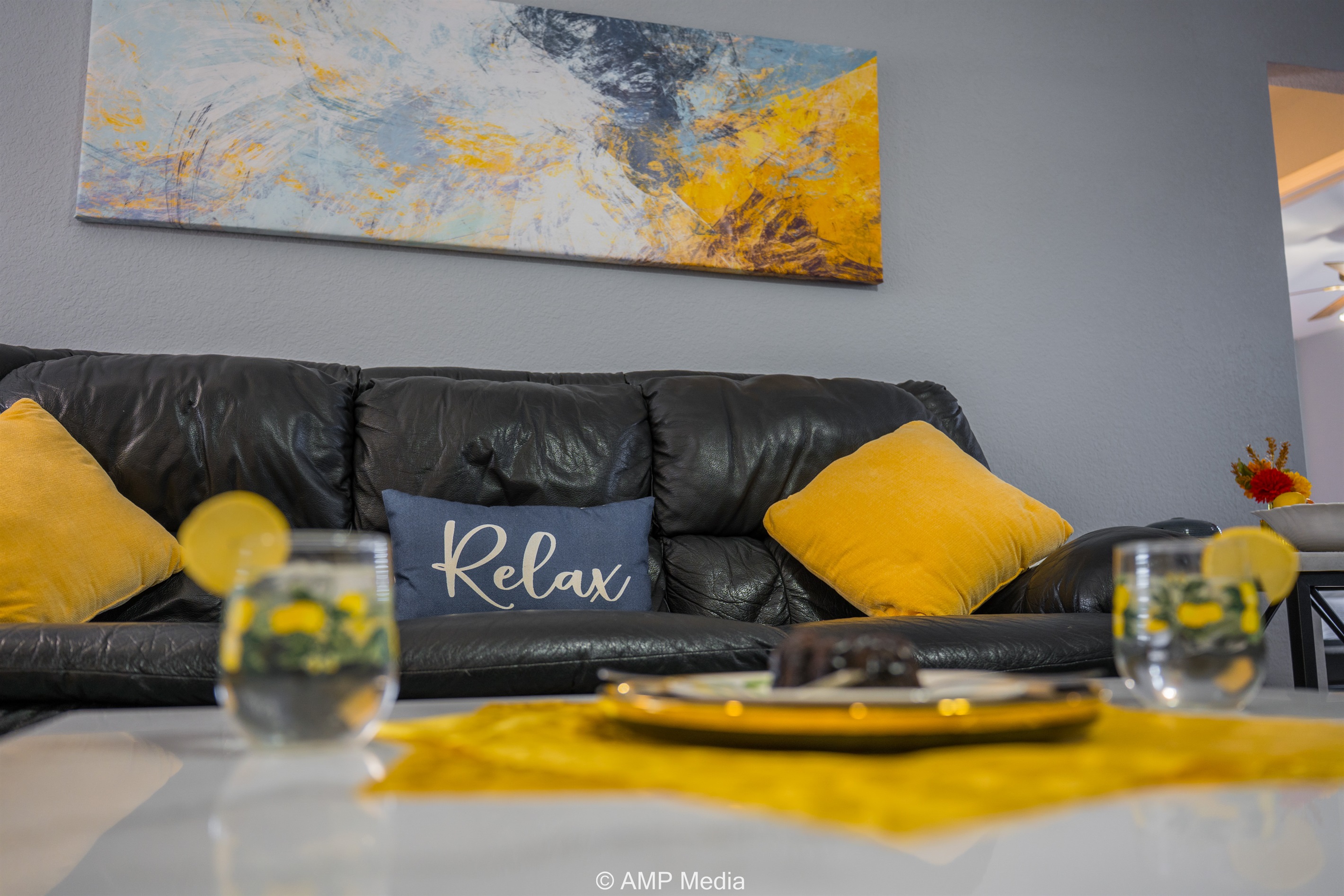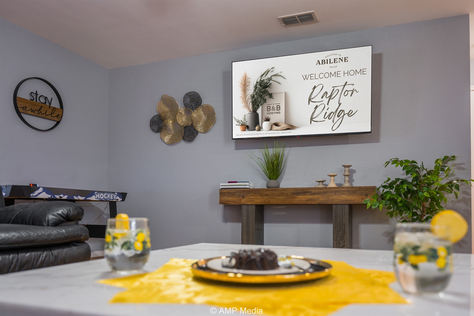 Gather in the spacious living room featuring plush black leather reclining sofas perfect for movie nights after a day of exploration. A vibrant blue abstract area rug anchors the seating area, while pops of sunshine yellow (including a stylish modern accent chair) add energy to the space. The room opens seamlessly to the dining area and kitchen, making it ideal for keeping everyone connected. Entertainment options include a wall-mounted flat-screen TV and a full-size air hockey table with LED lighting for friendly tournaments.