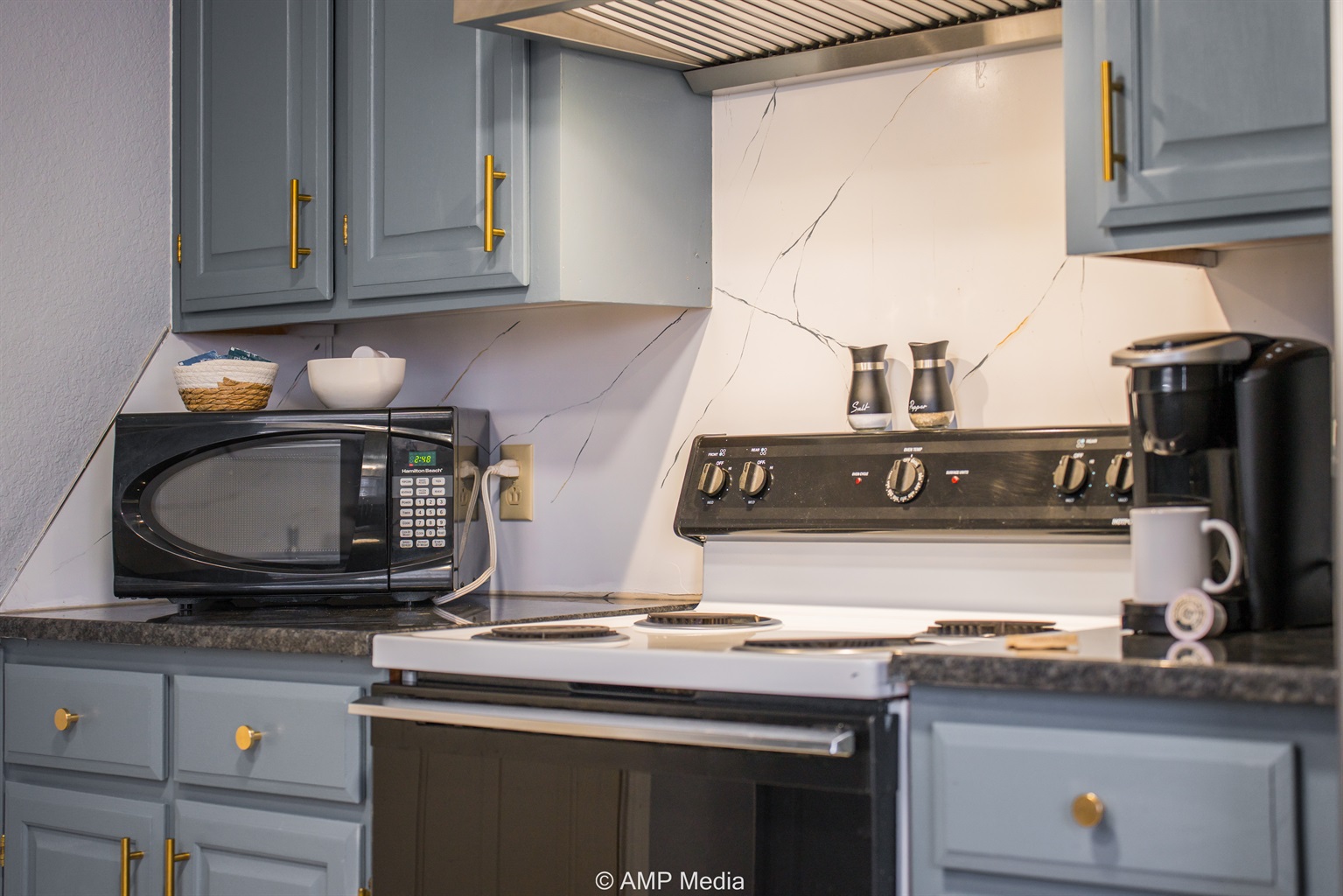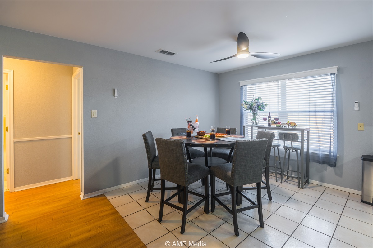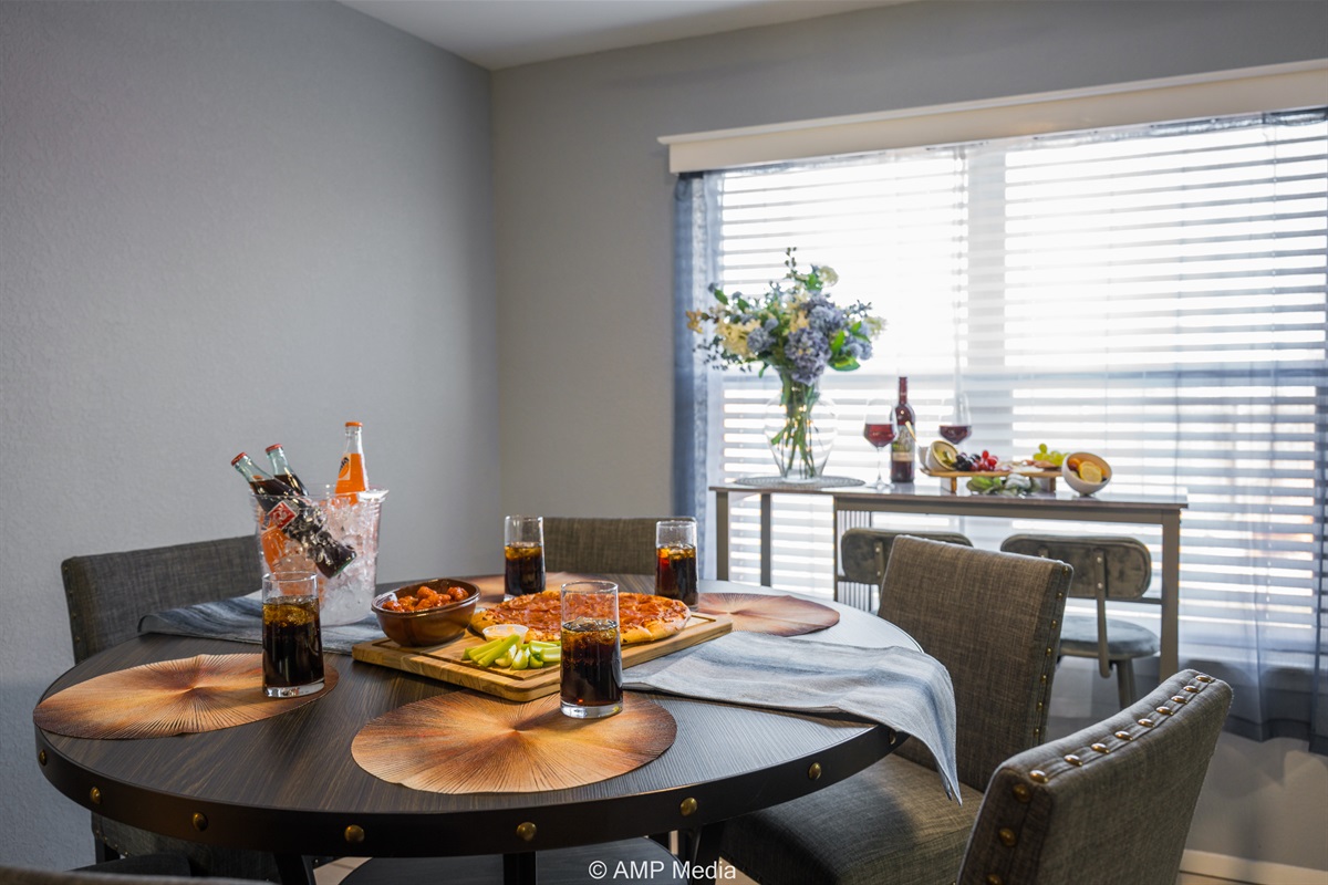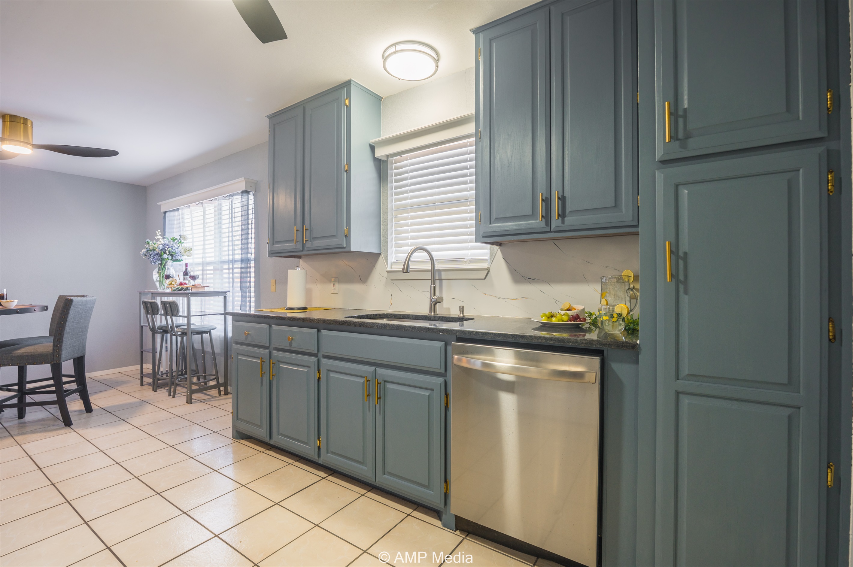 The galley-style kitchen comes fully equipped with modern appliances including a stainless steel refrigerator, microwave, and range. Soft blue-gray cabinetry with gold hardware adds a touch of elegance, while granite-look countertops provide ample prep space. The adjacent dining area features a round pub-height table with comfortable upholstered chairs, perfect for family meals and game nights.