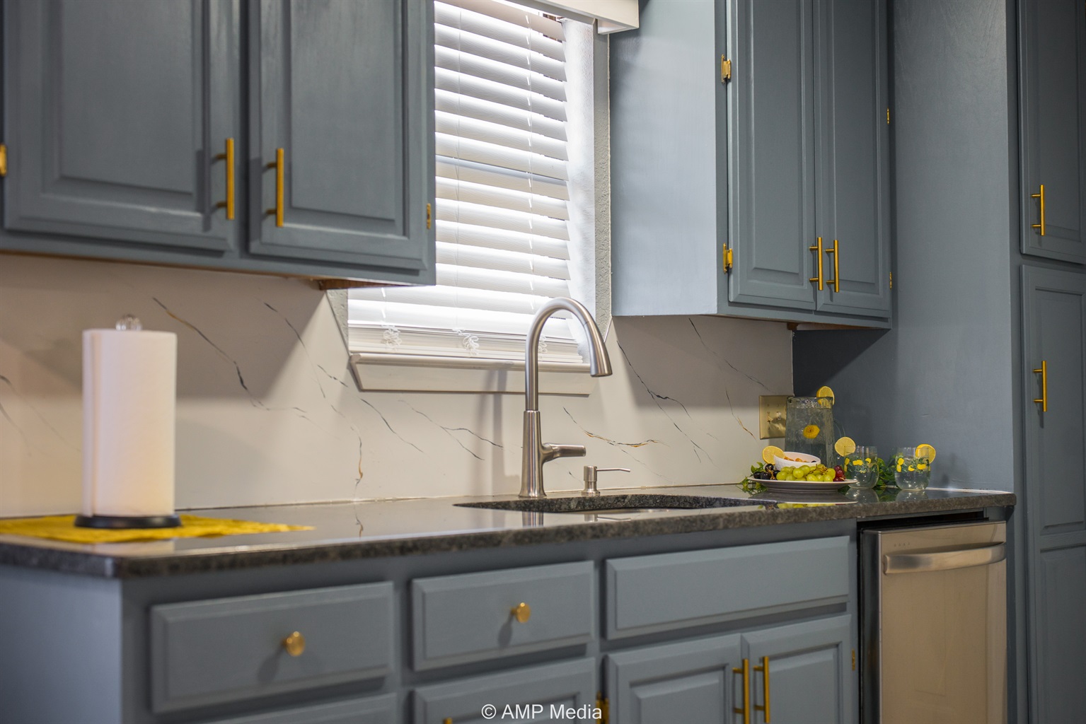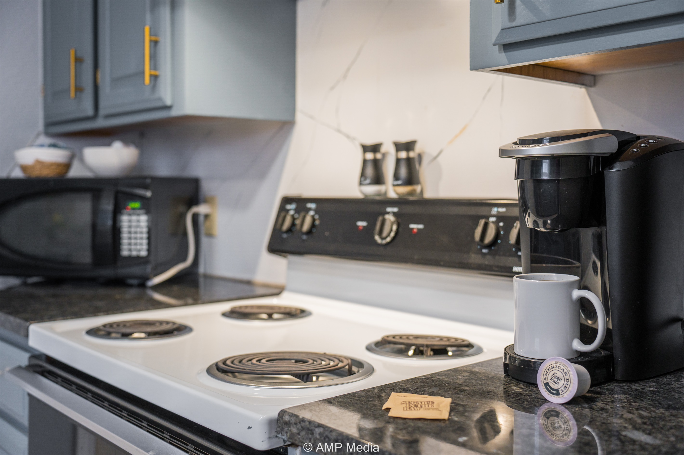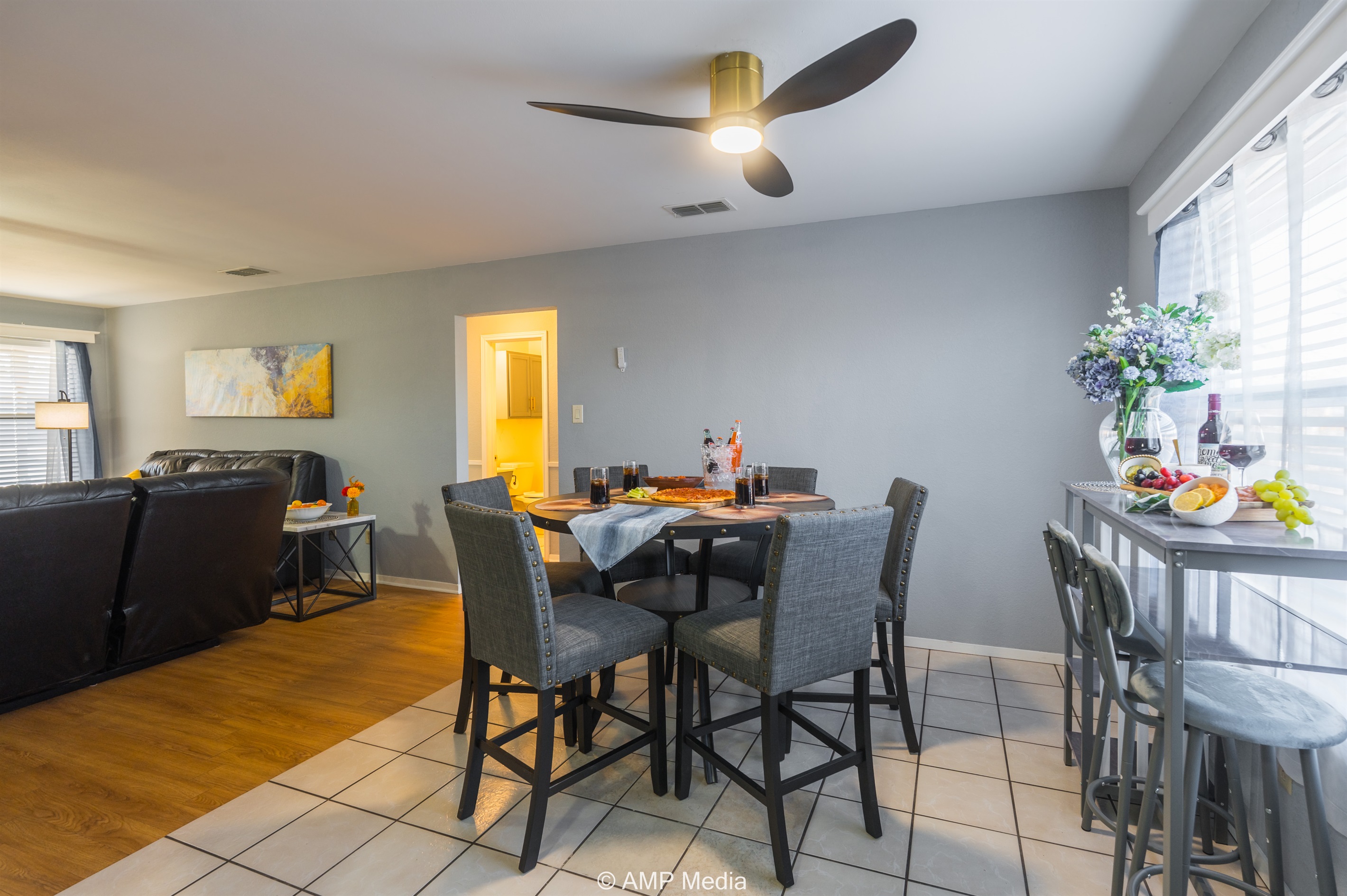 The galley-style kitchen comes fully equipped with modern appliances including a stainless steel refrigerator, microwave, and range. Soft blue-gray cabinetry with gold hardware adds a touch of elegance, while granite-look countertops provide ample prep space. The adjacent dining area features a round pub-height table with comfortable upholstered chairs, perfect for family meals and game nights.