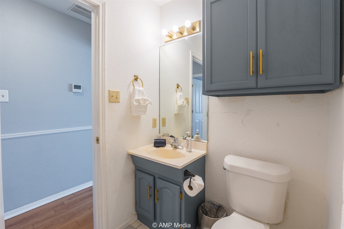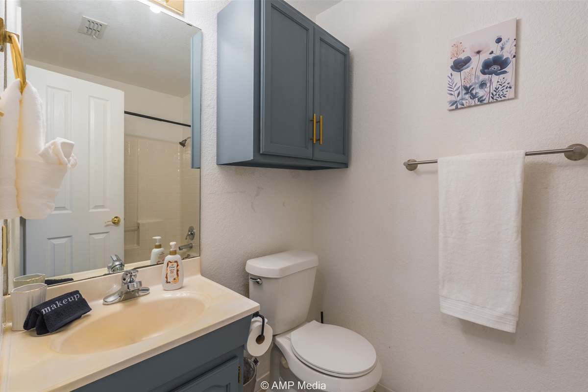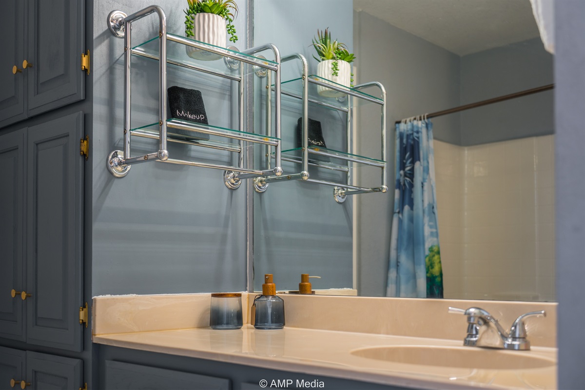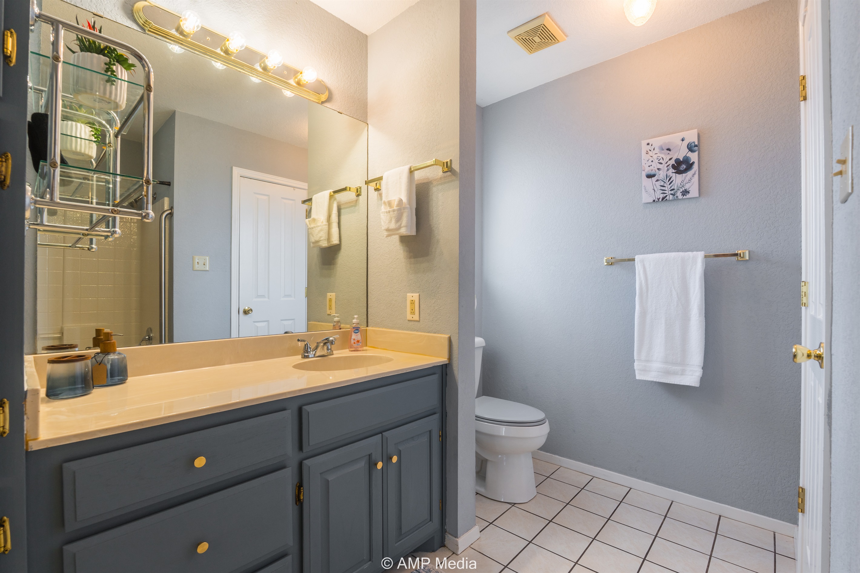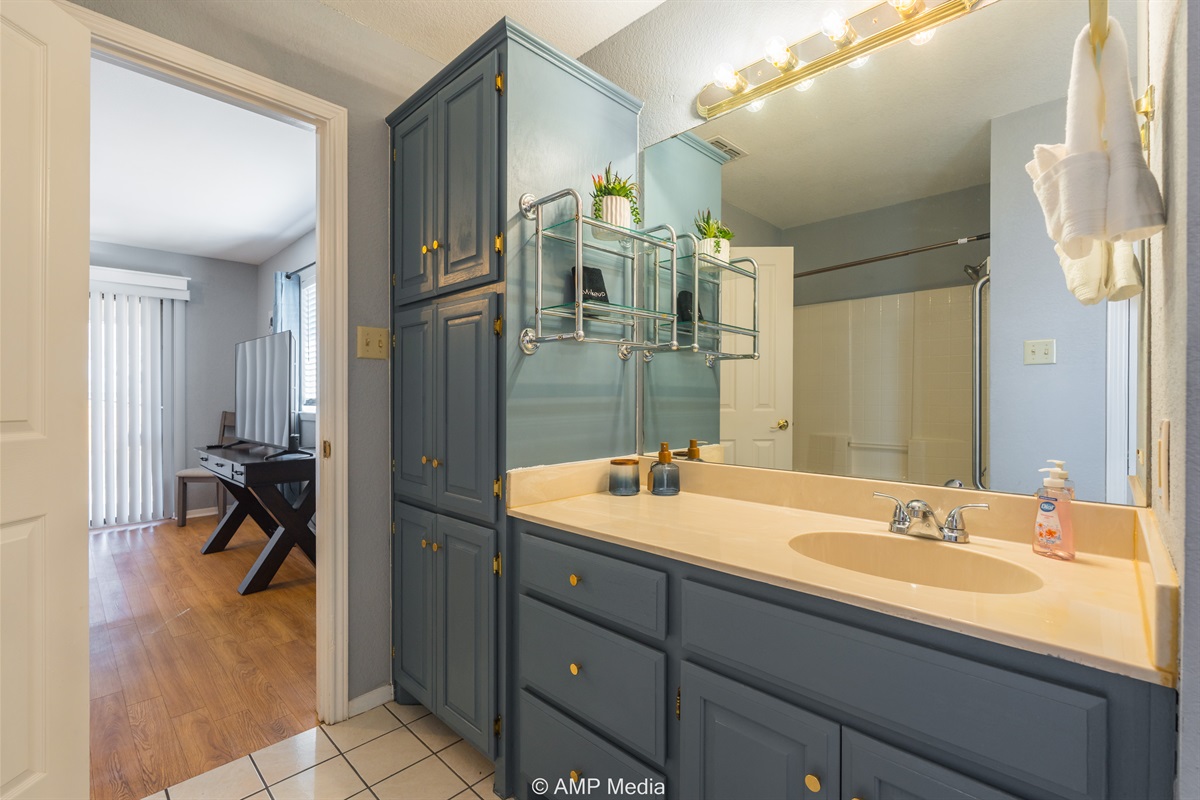 The home includes multiple well-appointed bathrooms with modern fixtures, blue-gray cabinetry with gold hardware, and tile flooring. The shared bathroom features towel storage and a tub/shower combination.
