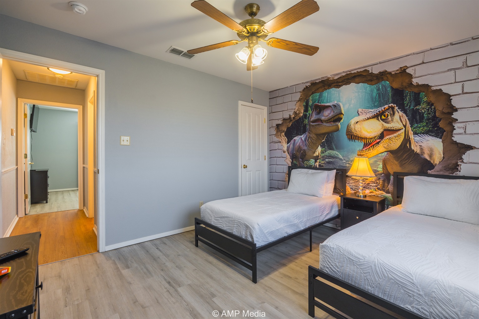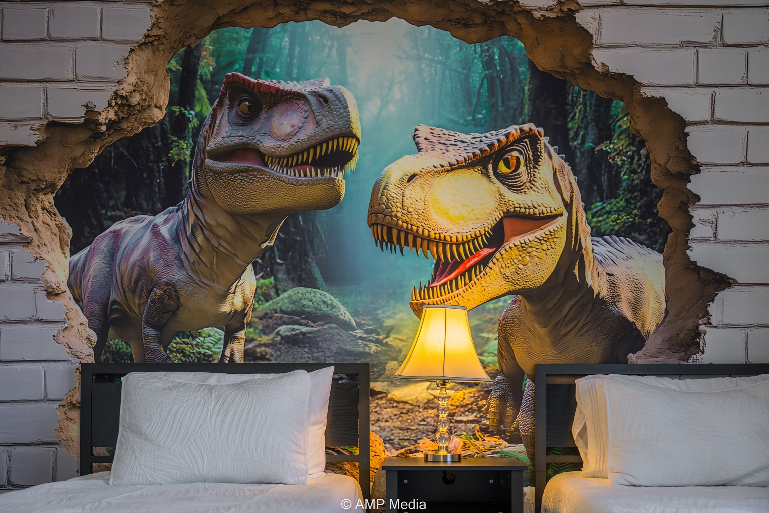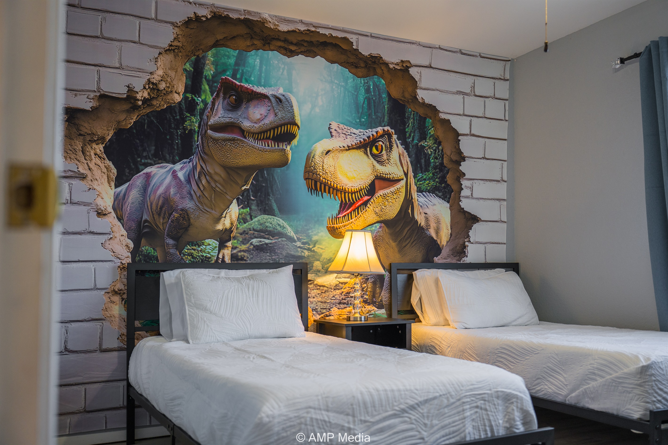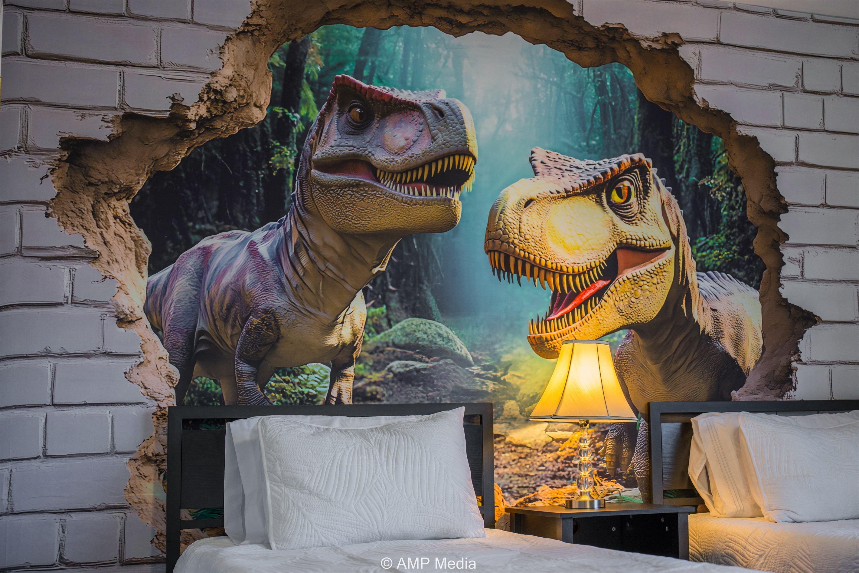 The adventure continues in this exciting themed bedroom featuring twin beds and a show-stopping 3D dinosaur mural that appears to burst through a brick wall. This T-Rex paradise includes its own wall-mounted TV and is designed to spark imagination and create lasting memories for young explorers.