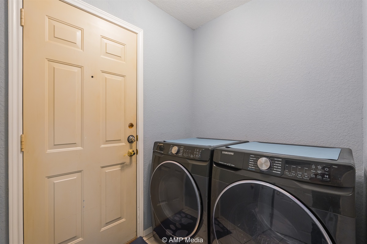 Full-size Samsung washer and dryer located in a dedicated laundry closet make extended stays effortless.