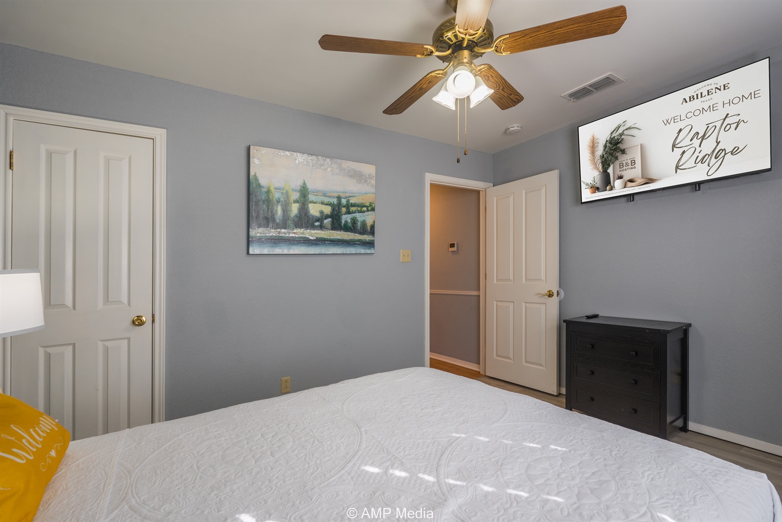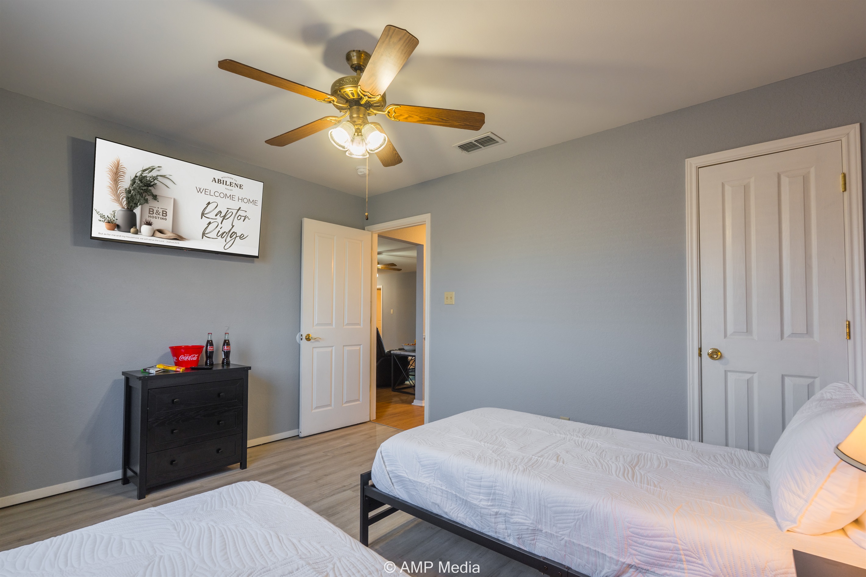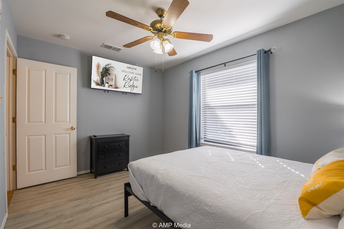 A serene space with neutral coastal artwork, ceiling fan, TV, and comfortable sleeping arrangements. This versatile room works perfectly for additional guests or as a quiet retreat.
