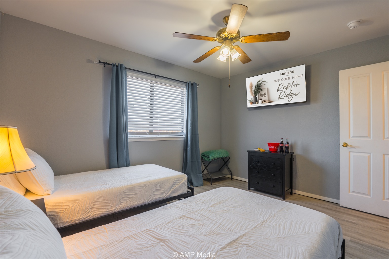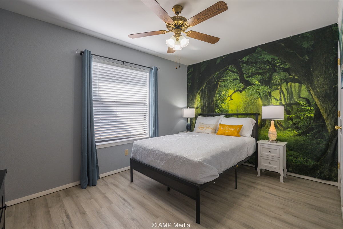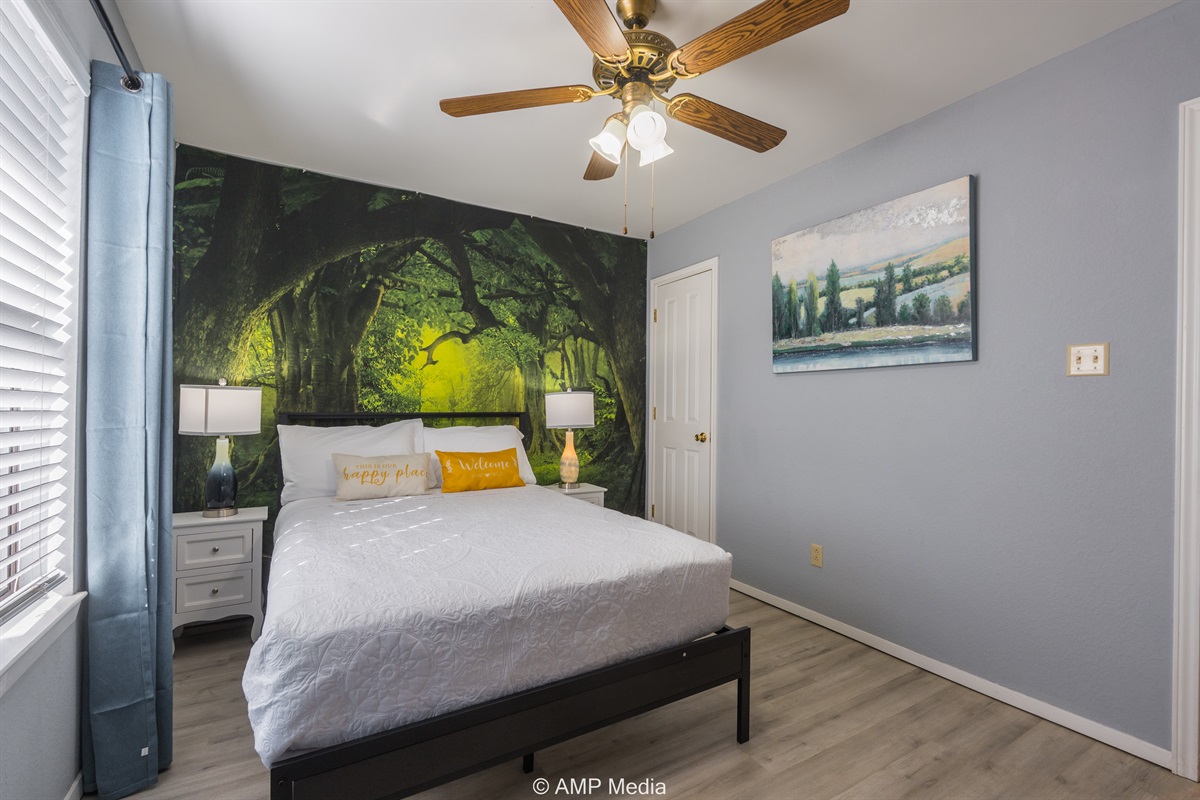 A serene space with neutral coastal artwork, ceiling fan, TV, and comfortable sleeping arrangements. This versatile room works perfectly for additional guests or as a quiet retreat.