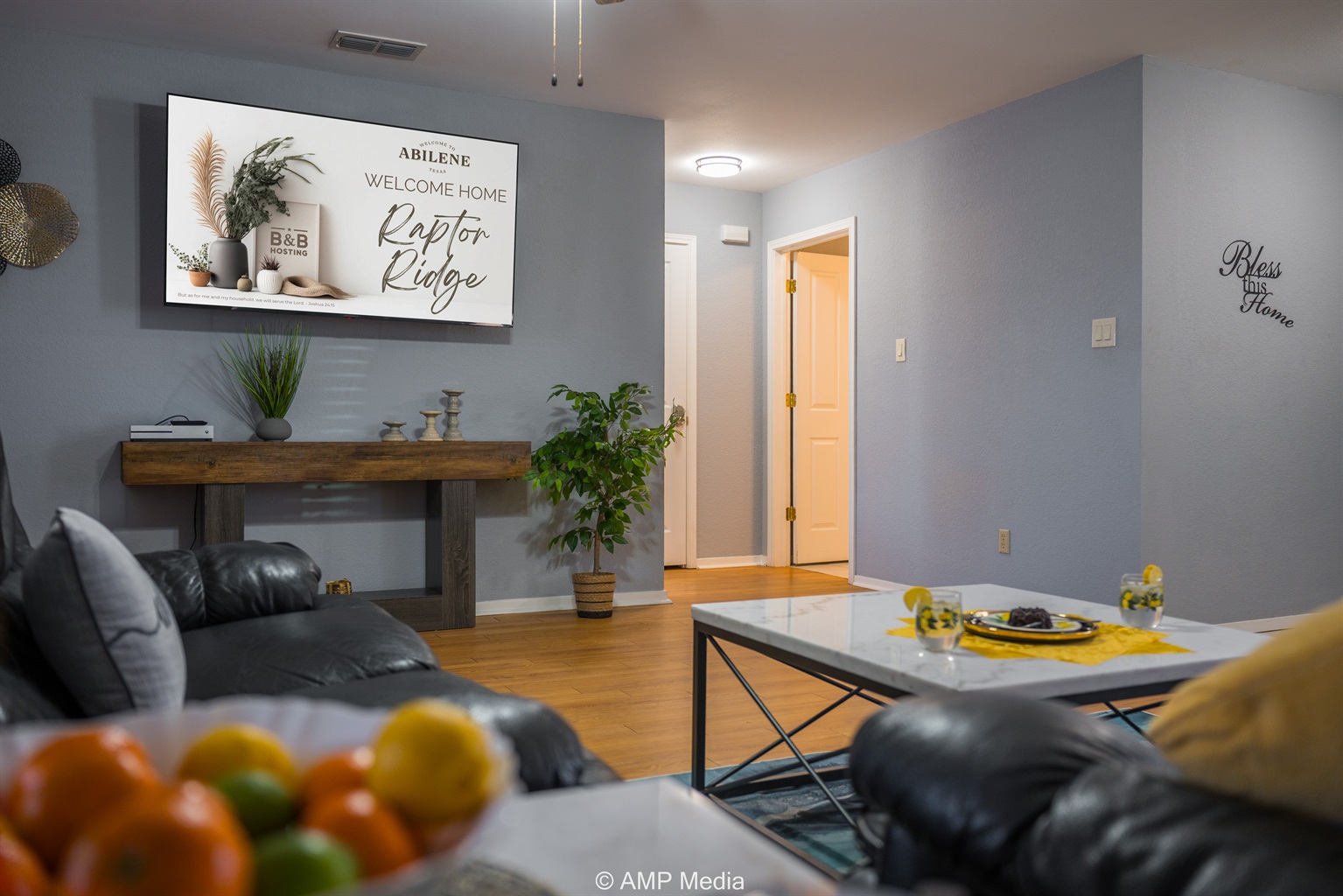 This thoughtfully designed home features an open-concept living area where expedition meets relaxation. Warm wood-look flooring flows throughout the main spaces, complemented by soothing blue-gray walls that create a calm, welcoming atmosphere.