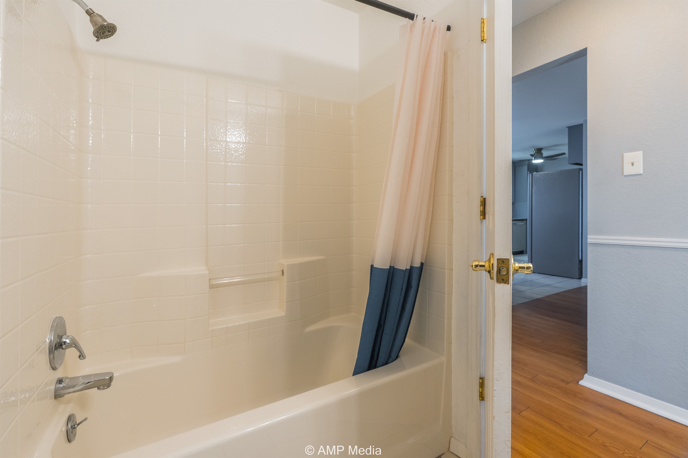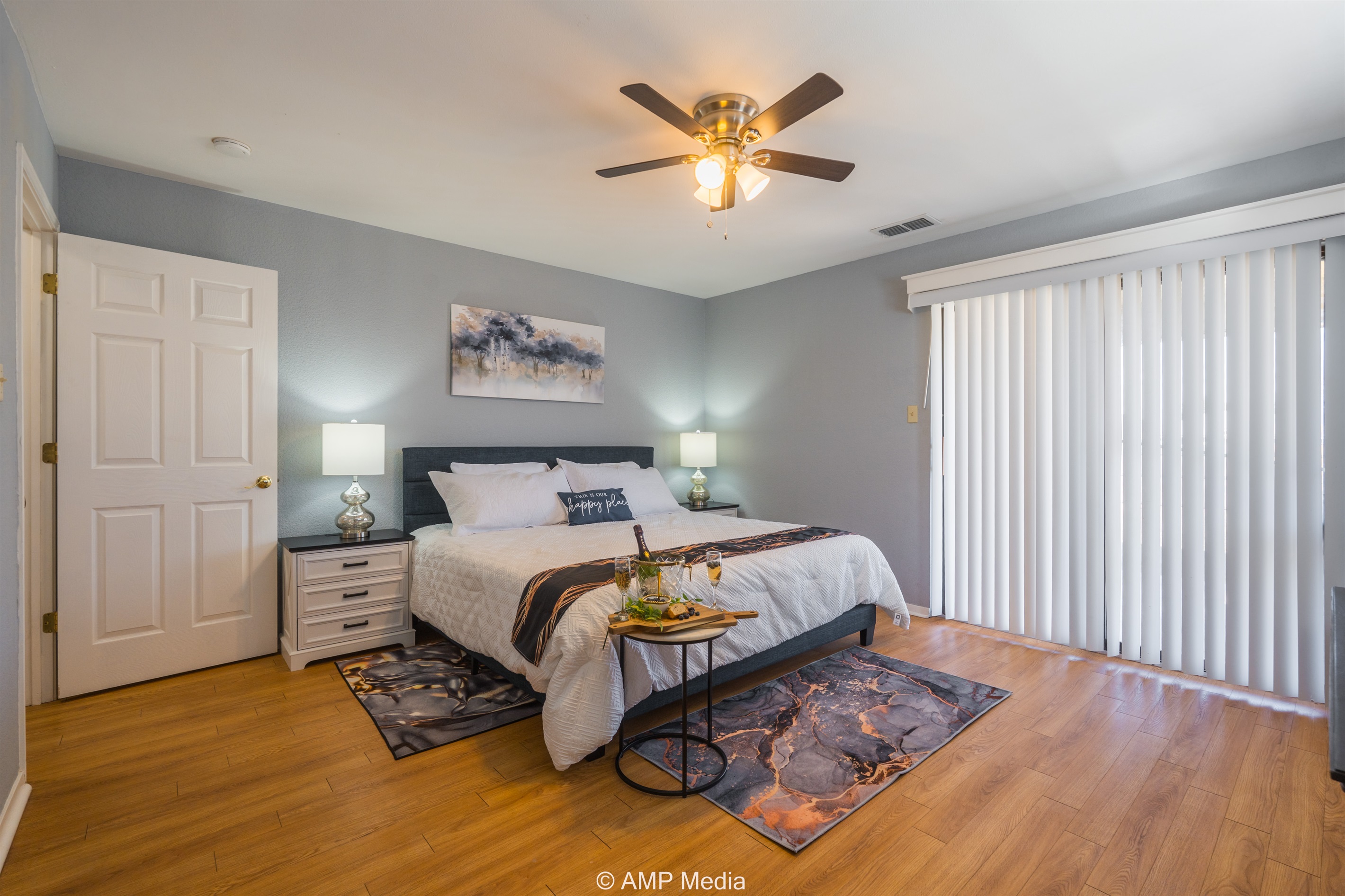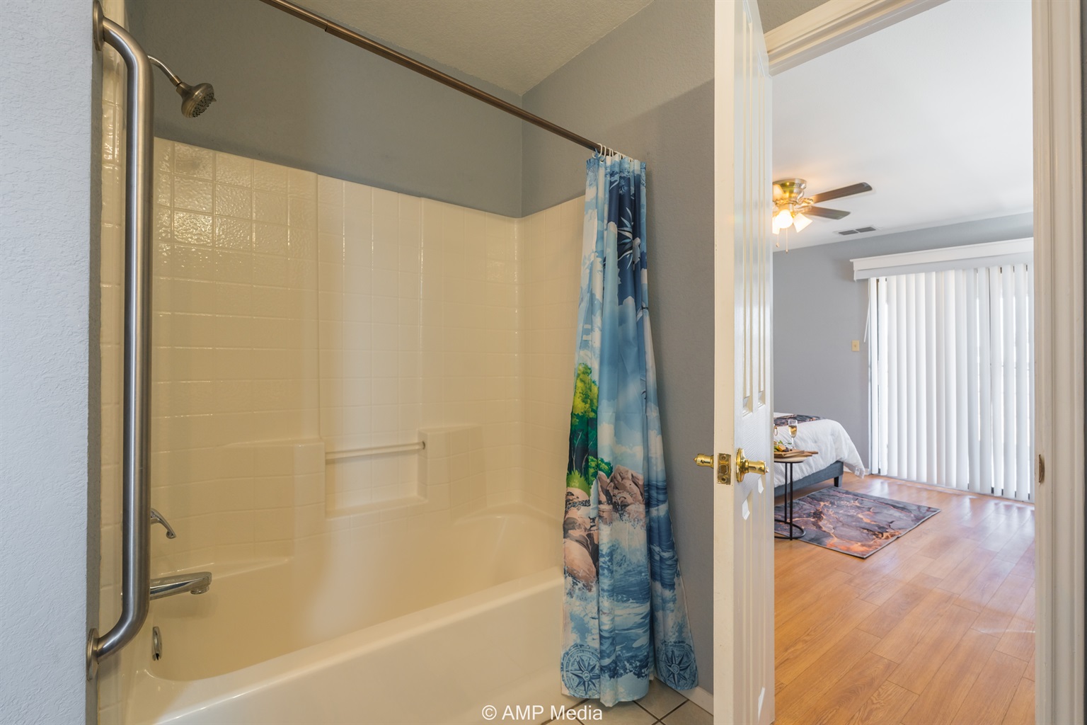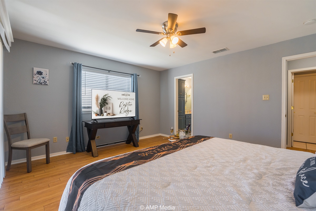 Your private retreat features a spacious layout with wood-look flooring, a comfortable queen bed, wall-mounted TV, and a wooden accent dresser. Large windows with blinds ensure restful sleep, while the attached master bath offers convenience and privacy. The ensuite bathroom includes blue-gray cabinetry, tile flooring, and a tub/shower combination with a delightful lighthouse-themed shower curtain.