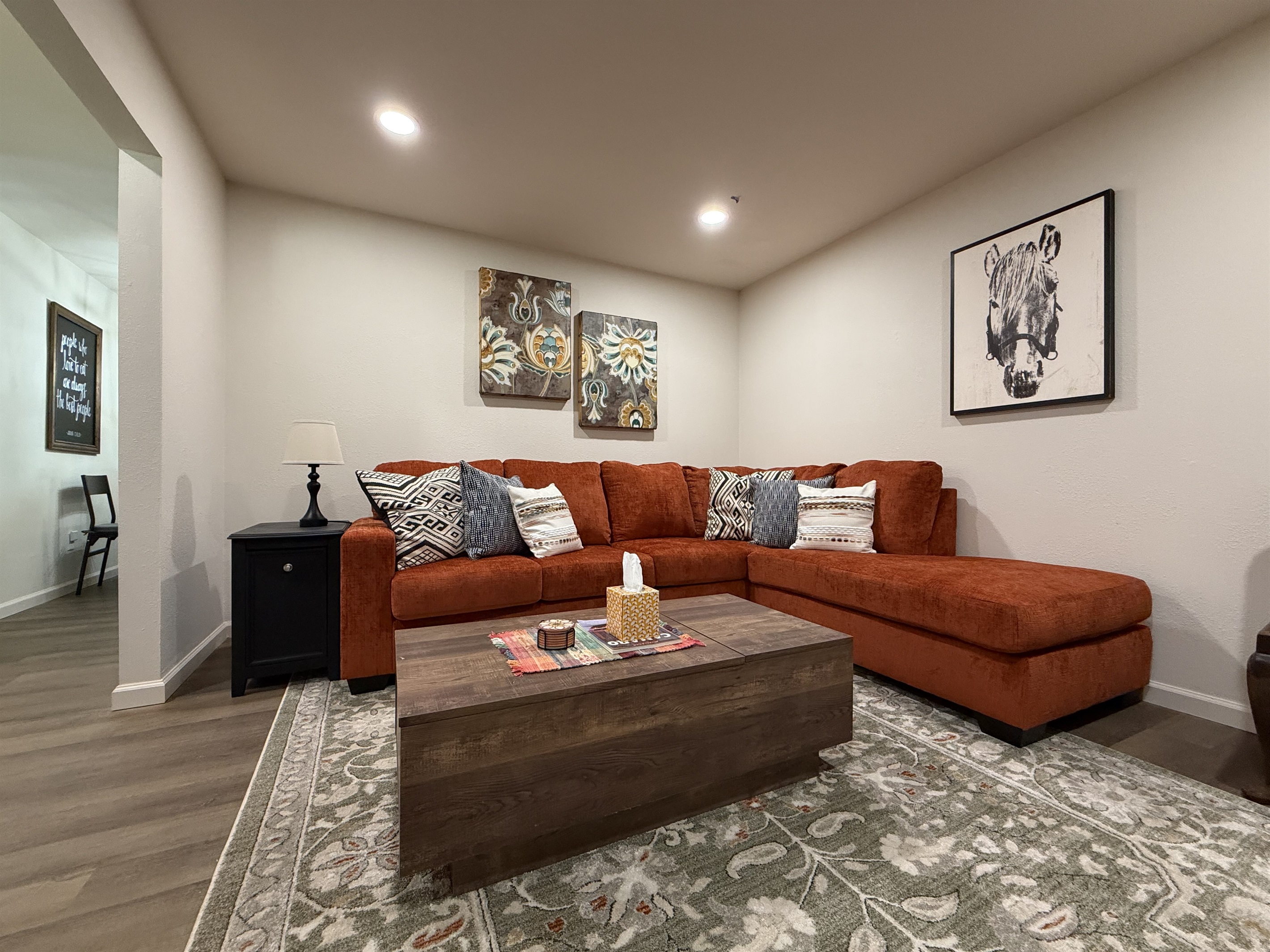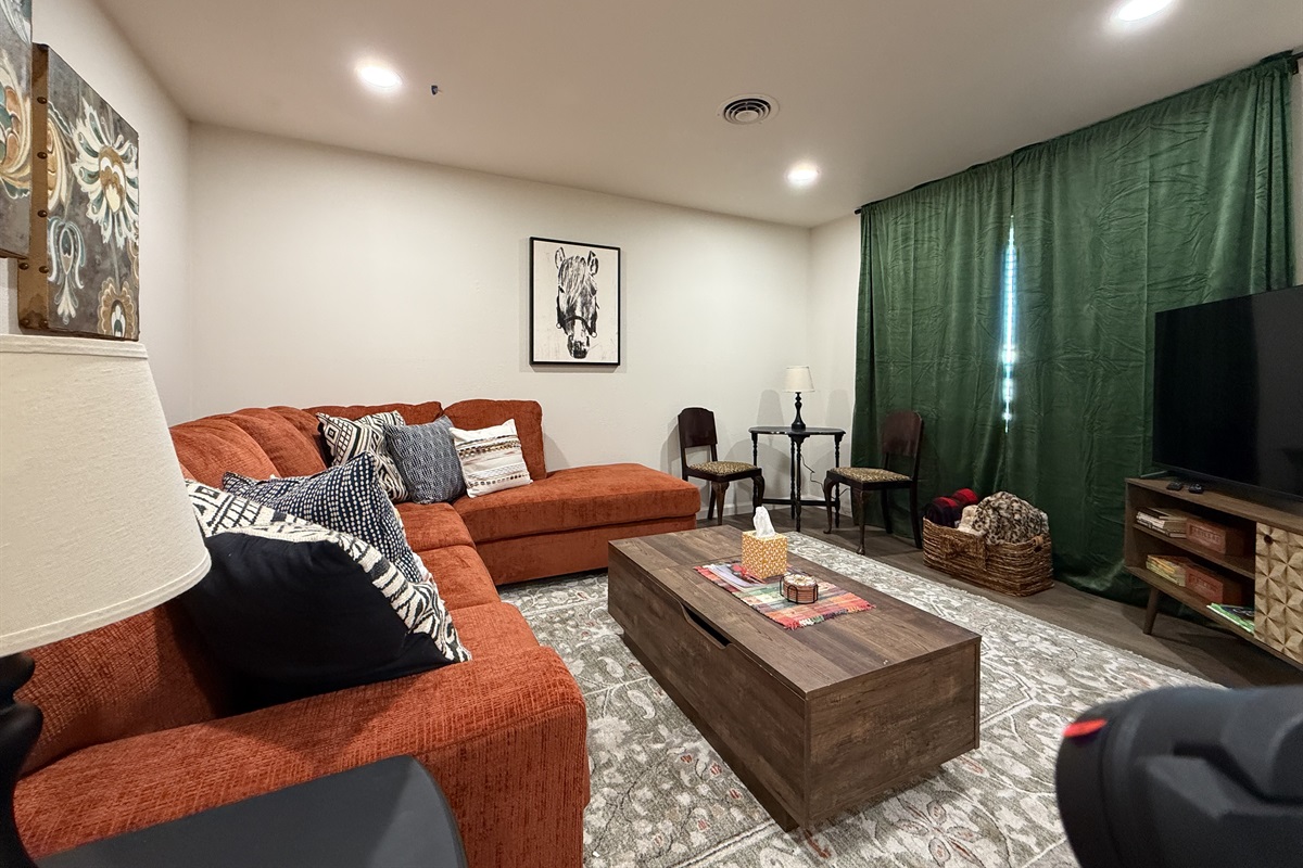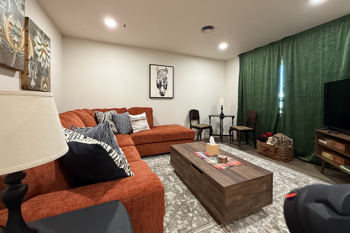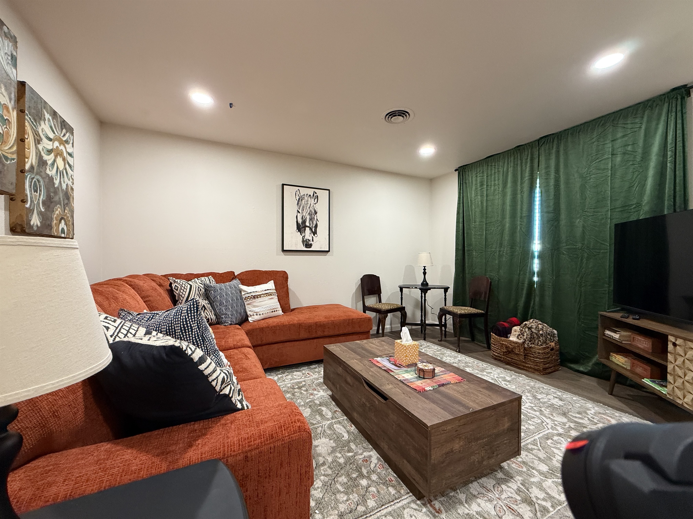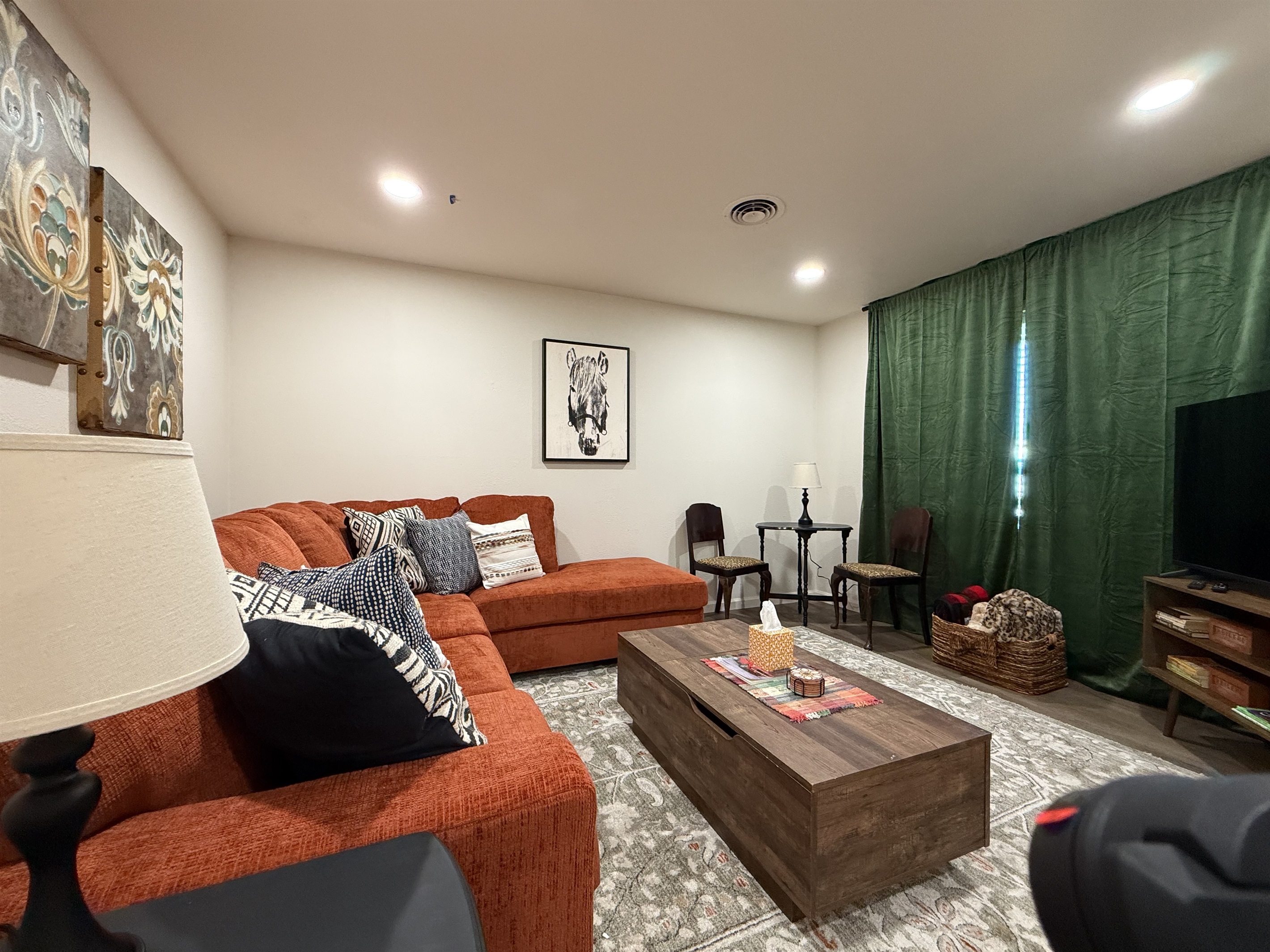 Unwind in the cozy secondary living area, complete with a plush rust-colored sectional sofa, large flat-screen TV, and entertainment console. Green curtains add a pop of color and ambiance, while the patterned area rug ties the space together. This is the perfect spot for movie nights, gaming sessions, or simply relaxing after a day exploring Abilene.