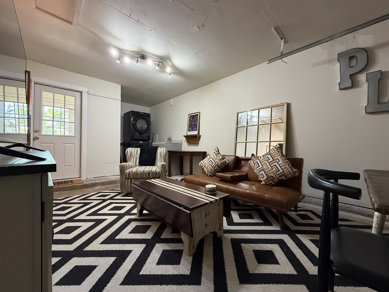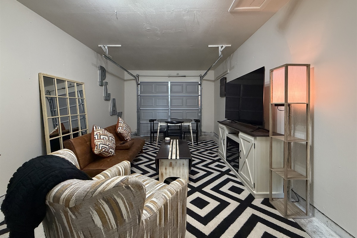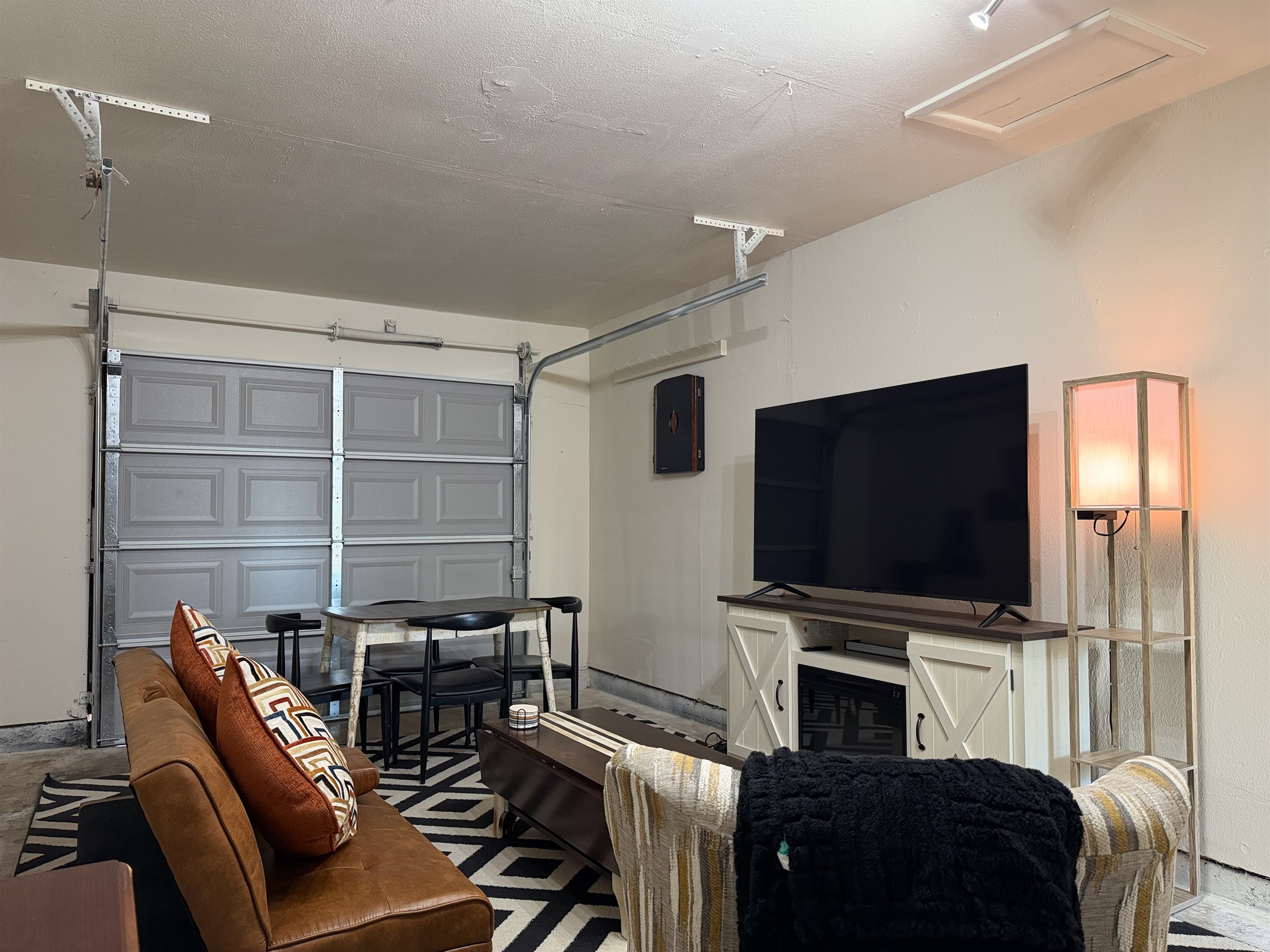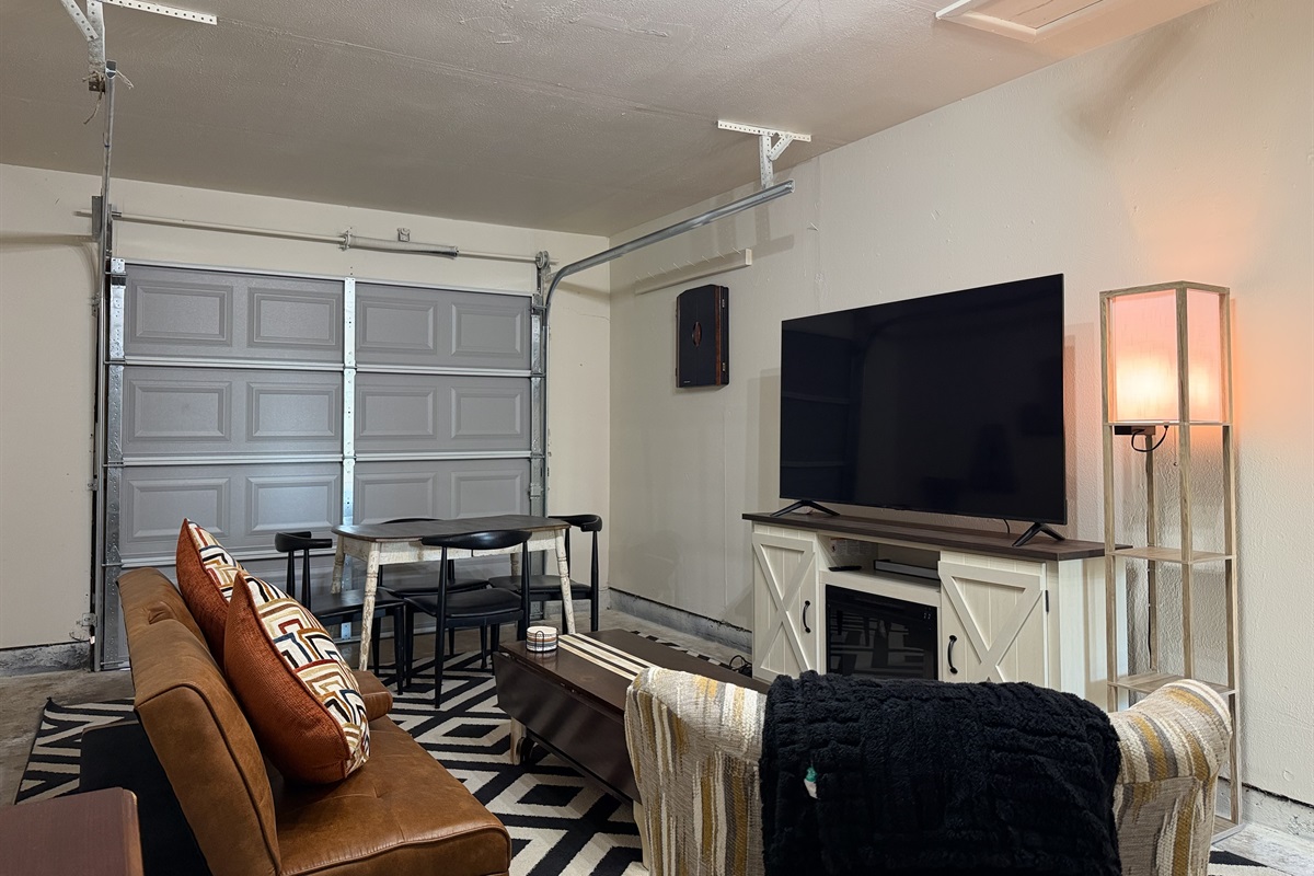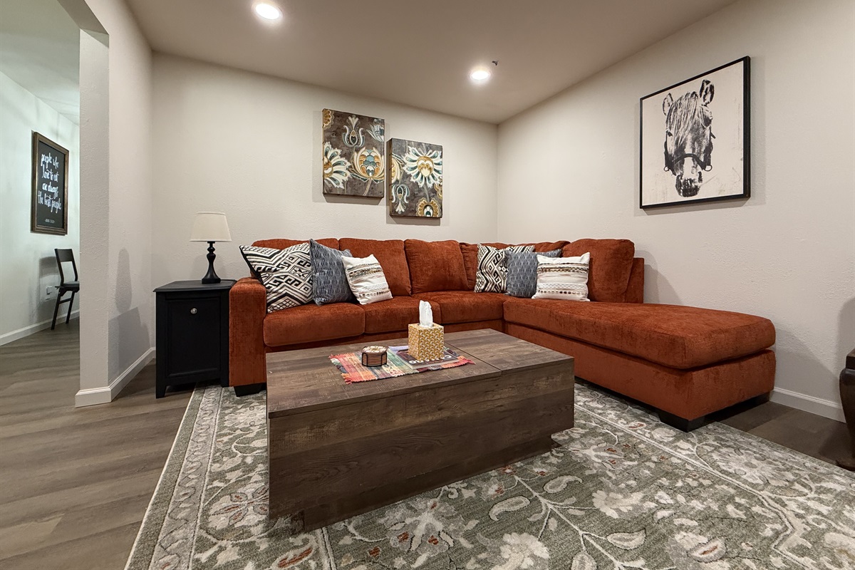 Unwind in the cozy secondary living area, complete with a plush rust-colored sectional sofa, large flat-screen TV, and entertainment console. Green curtains add a pop of color and ambiance, while the patterned area rug ties the space together. This is the perfect spot for movie nights, gaming sessions, or simply relaxing after a day exploring Abilene.