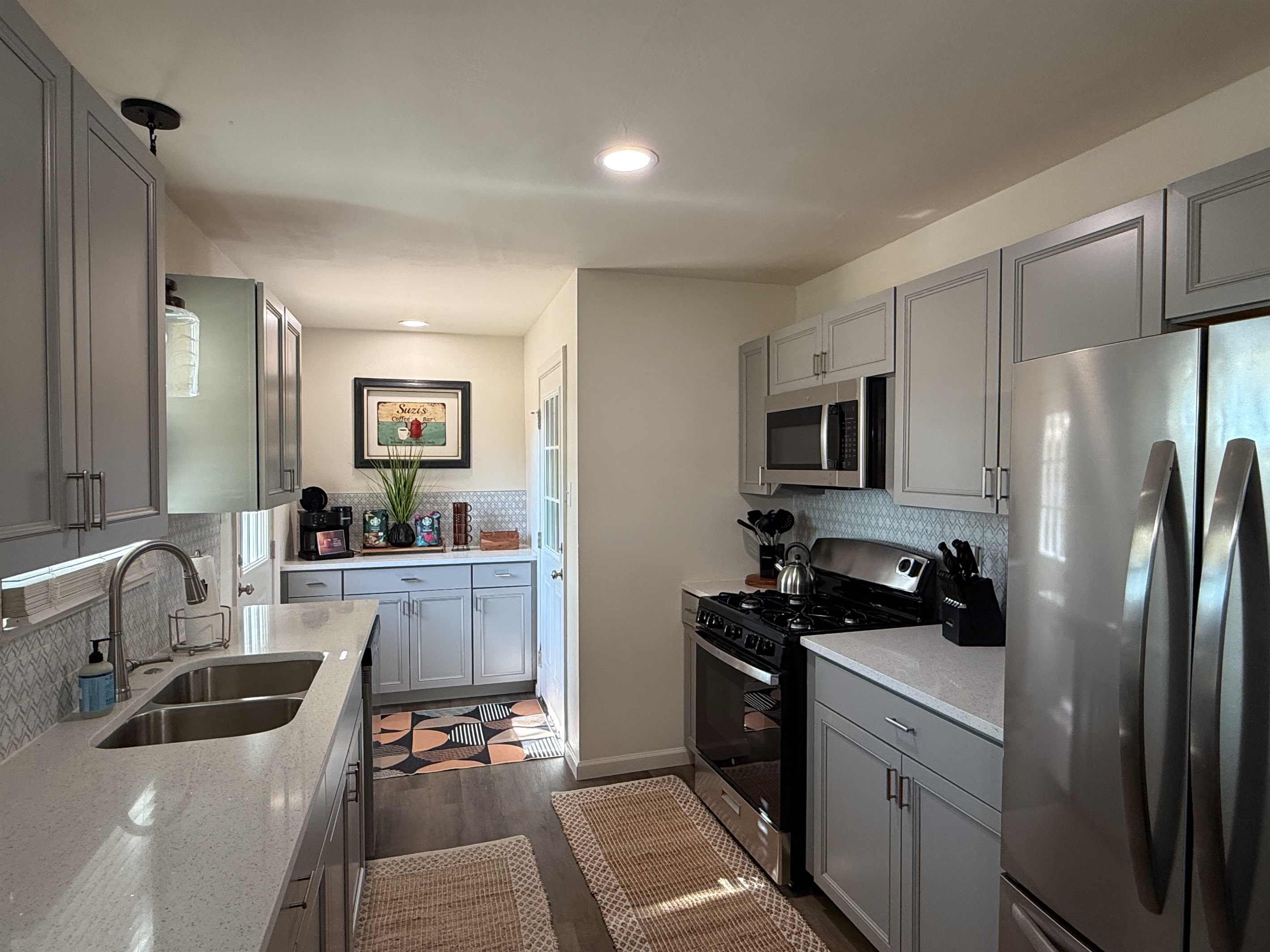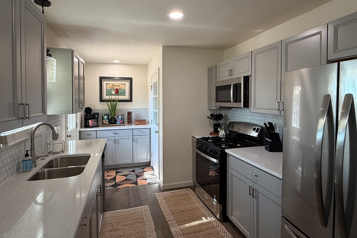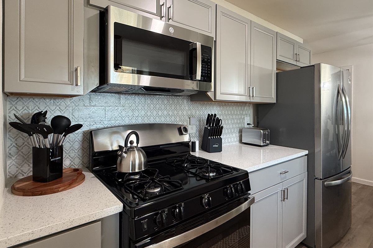Stainless steel appliances including refrigerator, gas stove, and microwave