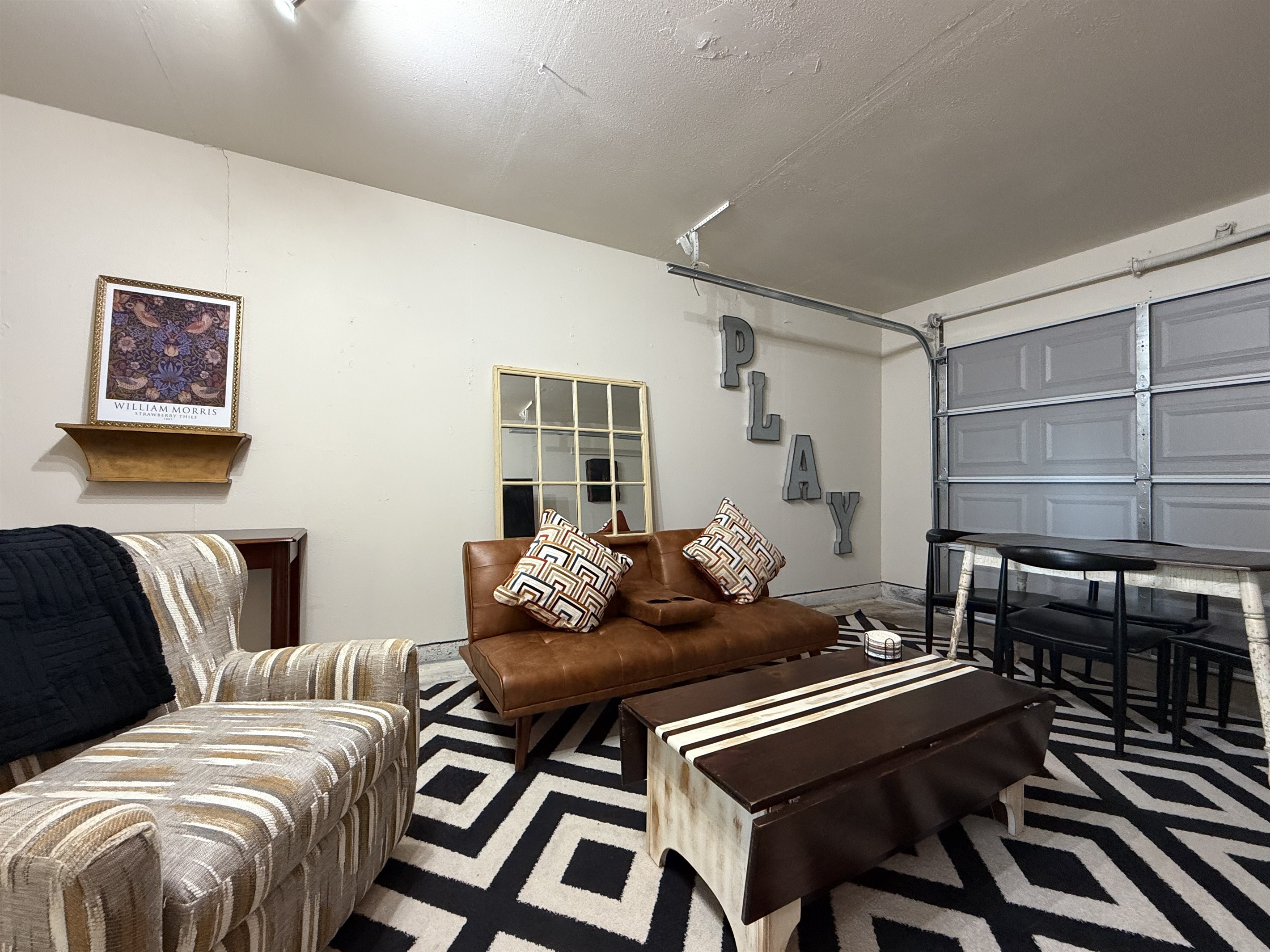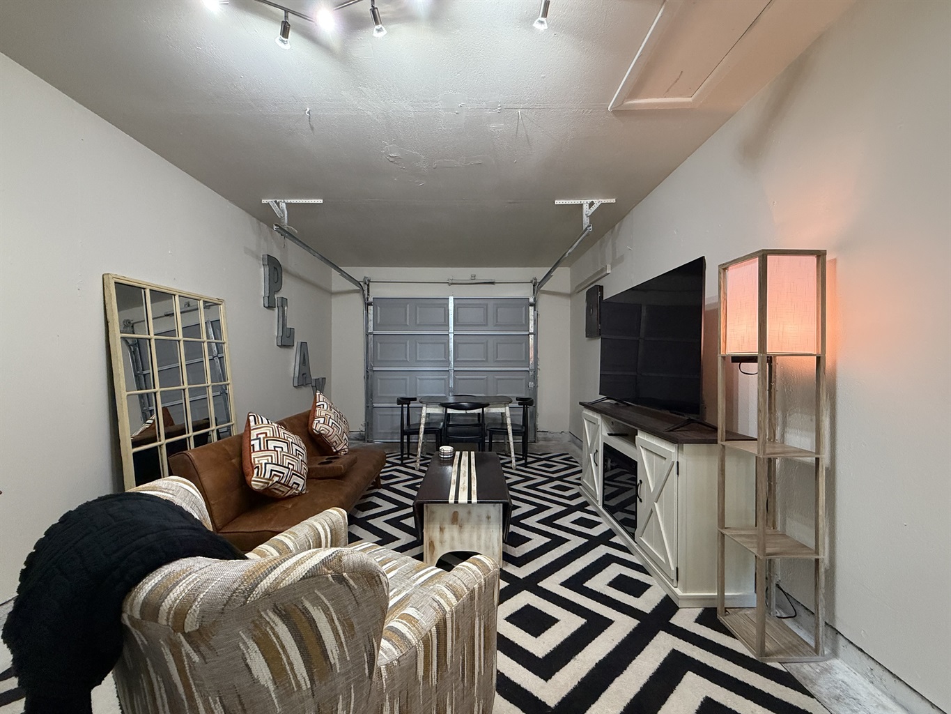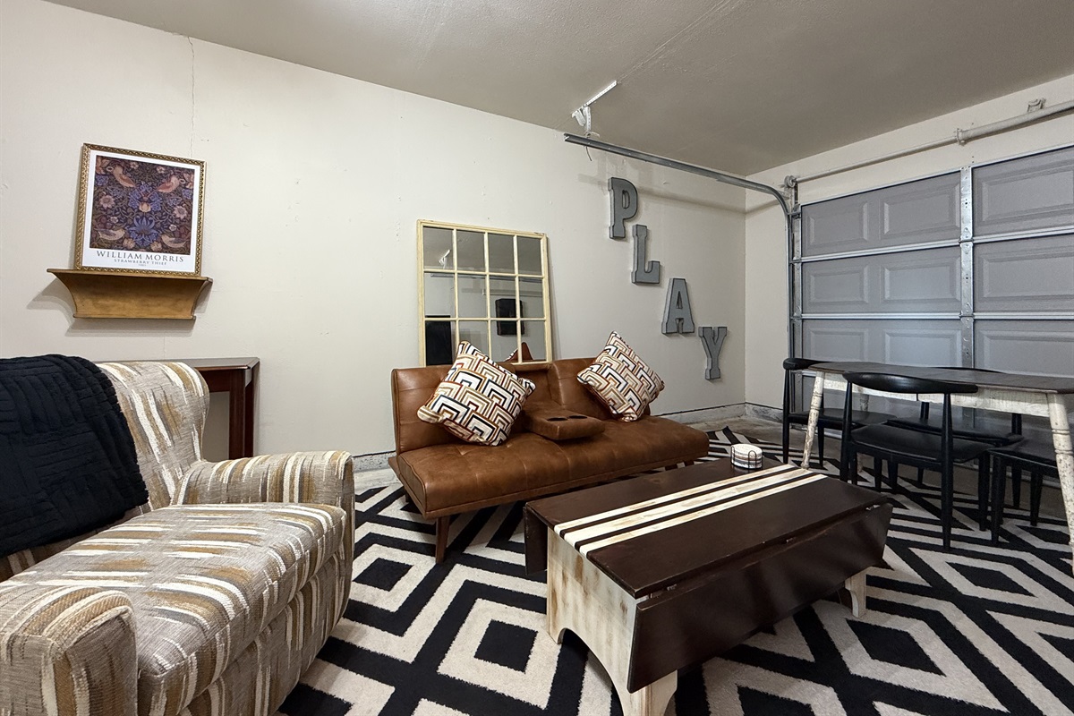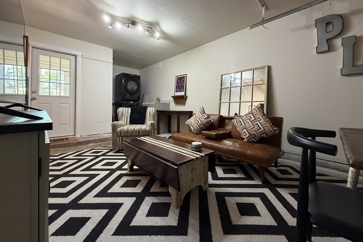 Step into a striking living room that makes an unforgettable first impression! The space features a bold black-and-white geometric area rug that anchors the room, complemented by a rich cognac leather sofa adorned with patterned throw pillows. Rustic touches like the vintage-inspired coffee table and charming décor create a warm, inviting atmosphere. Large windows flood the space with natural light, while the open floor plan connects seamlessly to the rest of the home.