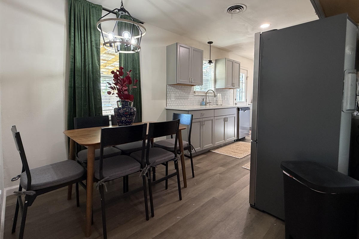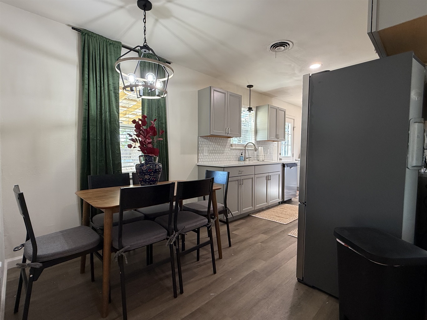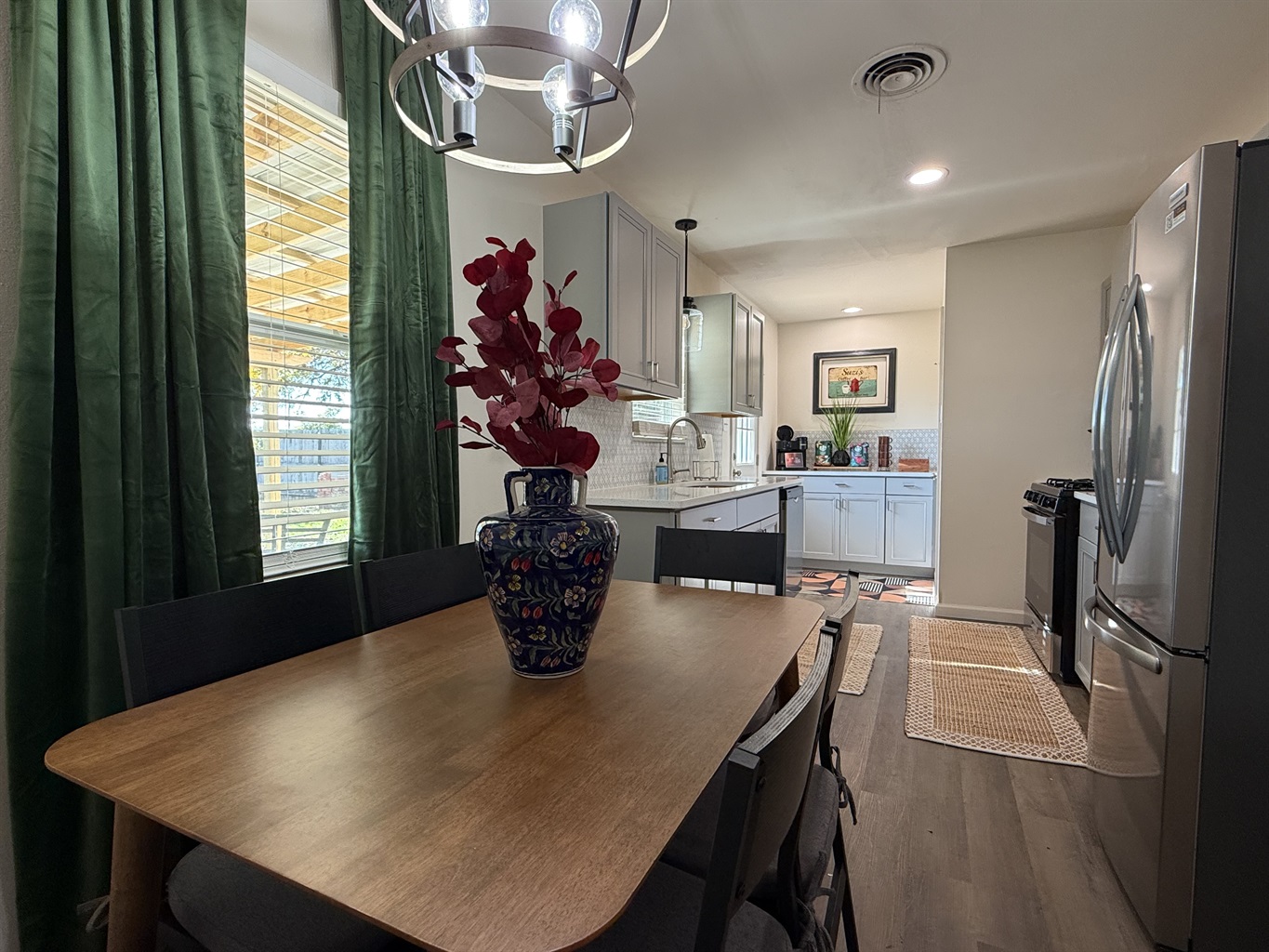 Gather around the modern dining table that comfortably seats your group. The adjacent well-appointed kitchen makes meal preparation a breeze, whether you're brewing morning coffee or preparing a full family dinner.