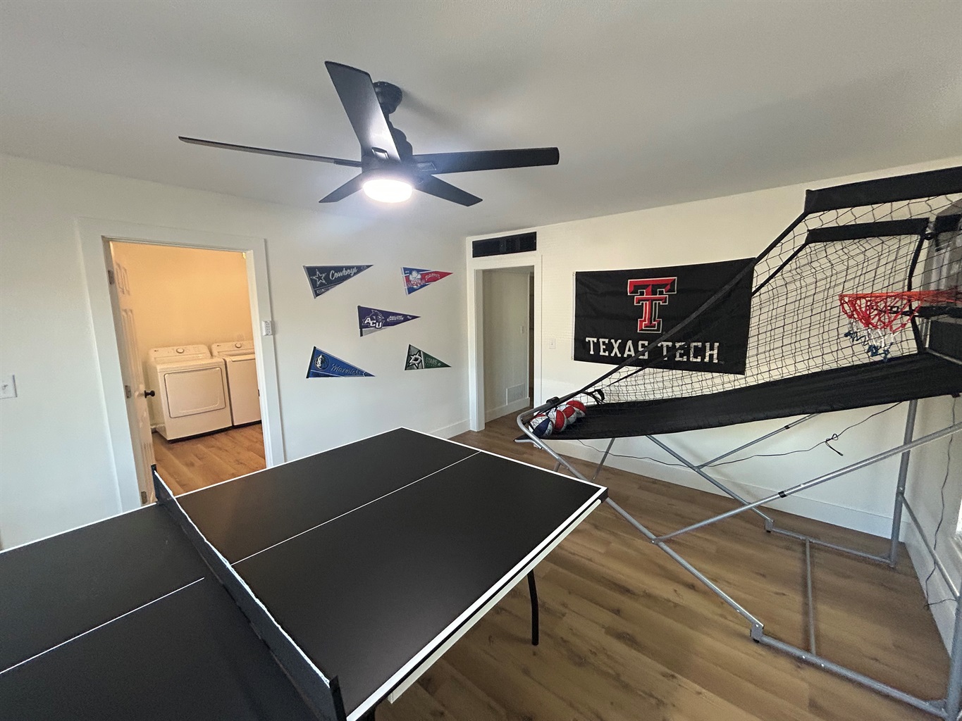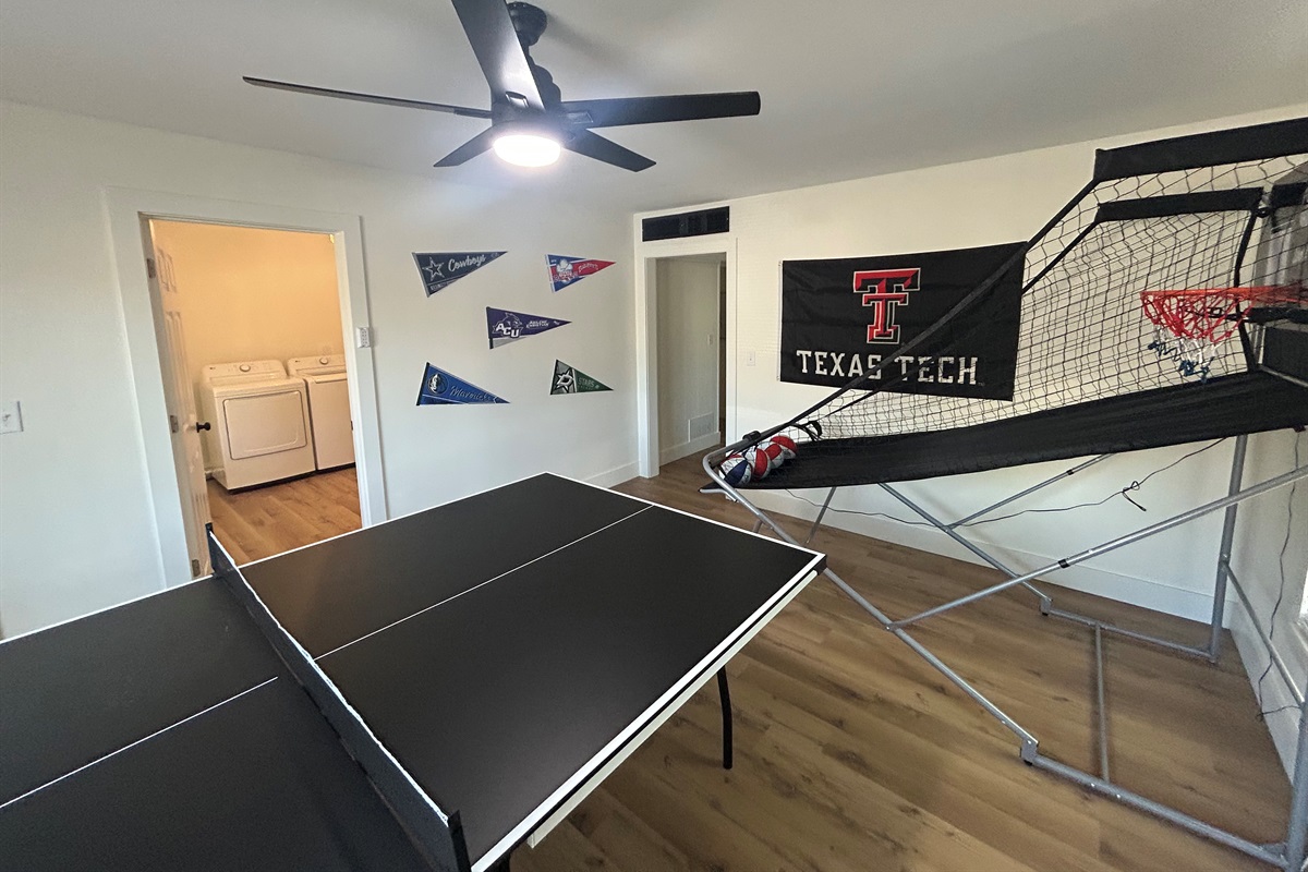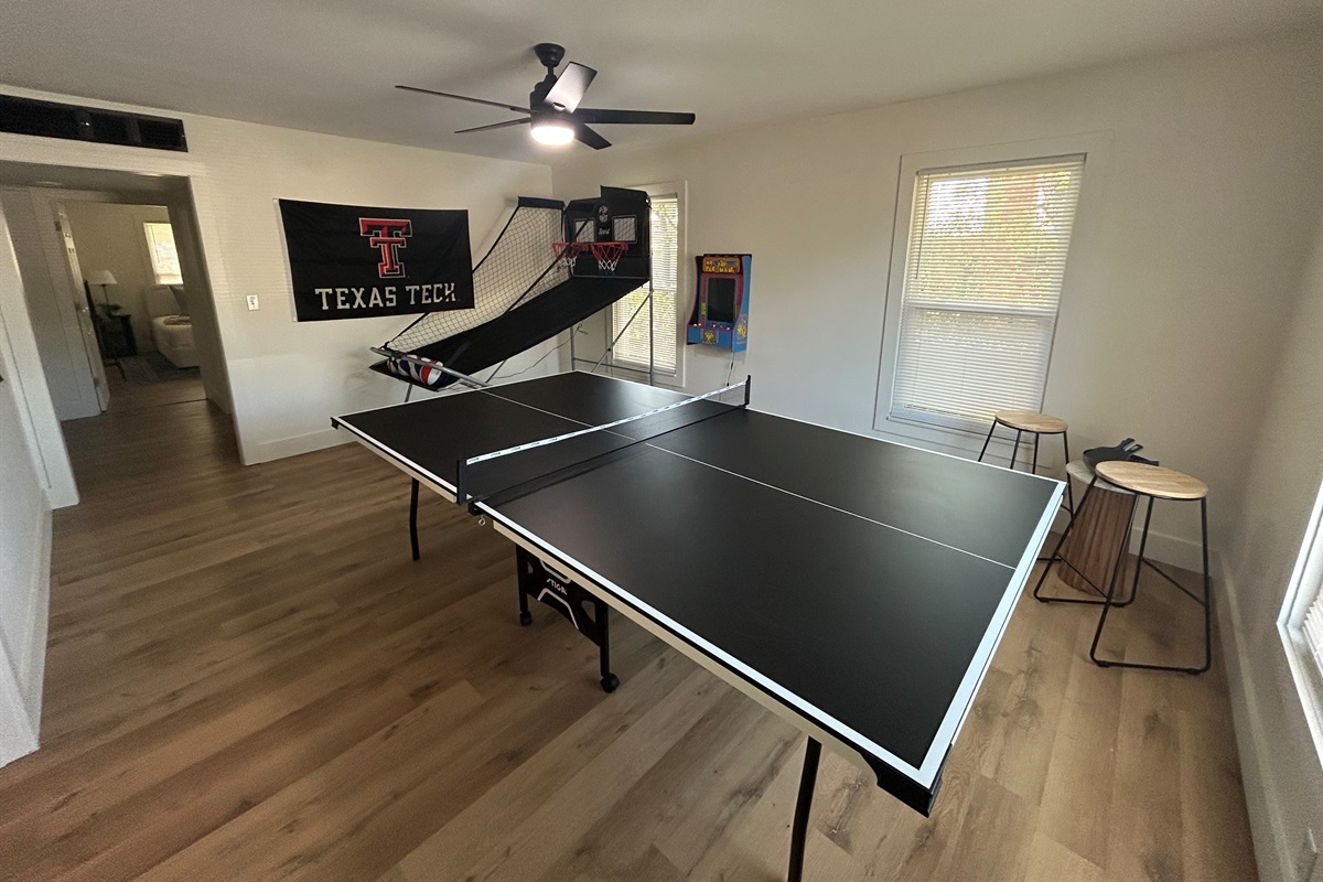 Dedicated Game Room: Entertainment space featuring full-size ping pong table, basketball arcade game, wall-mounted Ms. Pac-Man classic arcade, and Texas Tech pennant collection