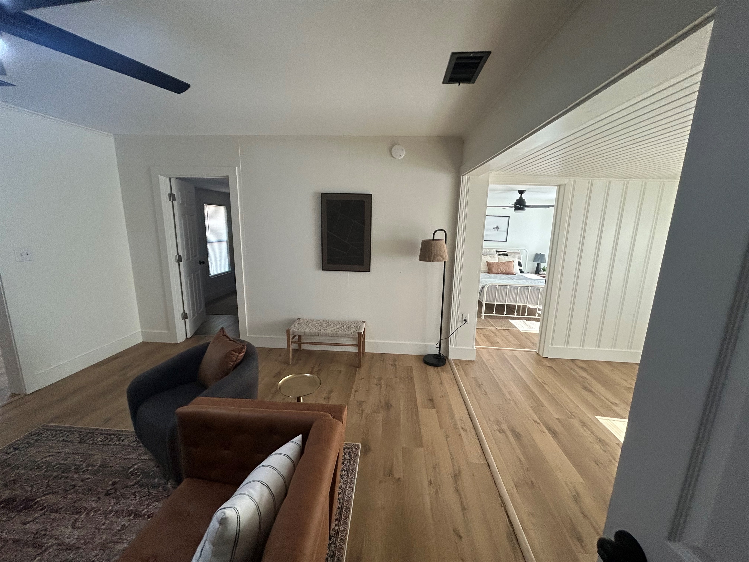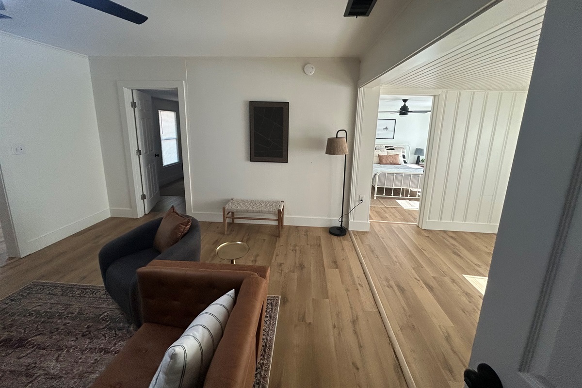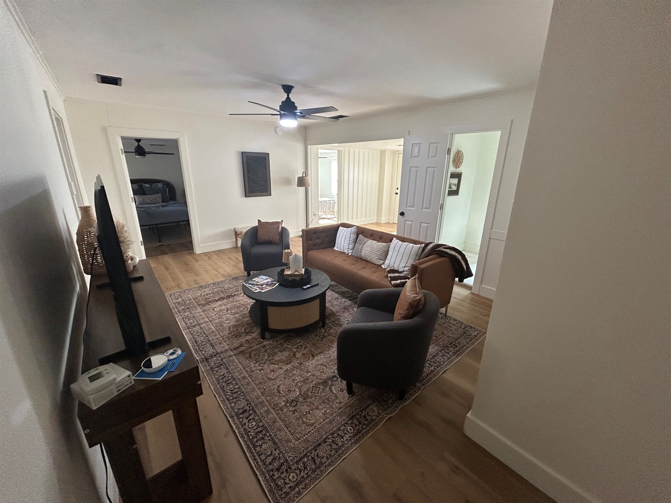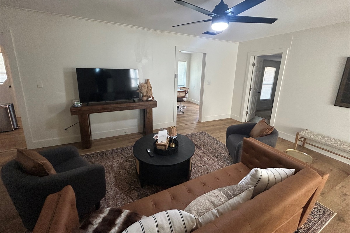 Spacious Living Areas: Open-concept design with comfortable seating, flat-screen TV, and beautiful hardwood-look flooring that flows throughout the entire home