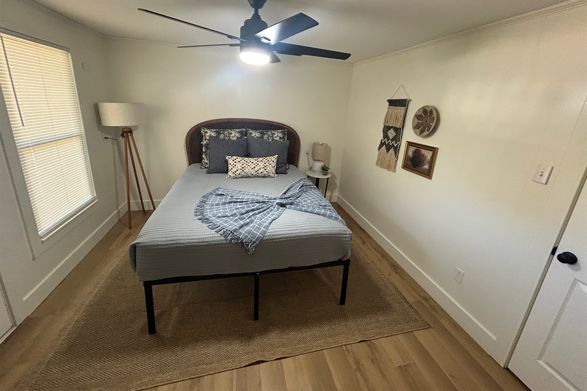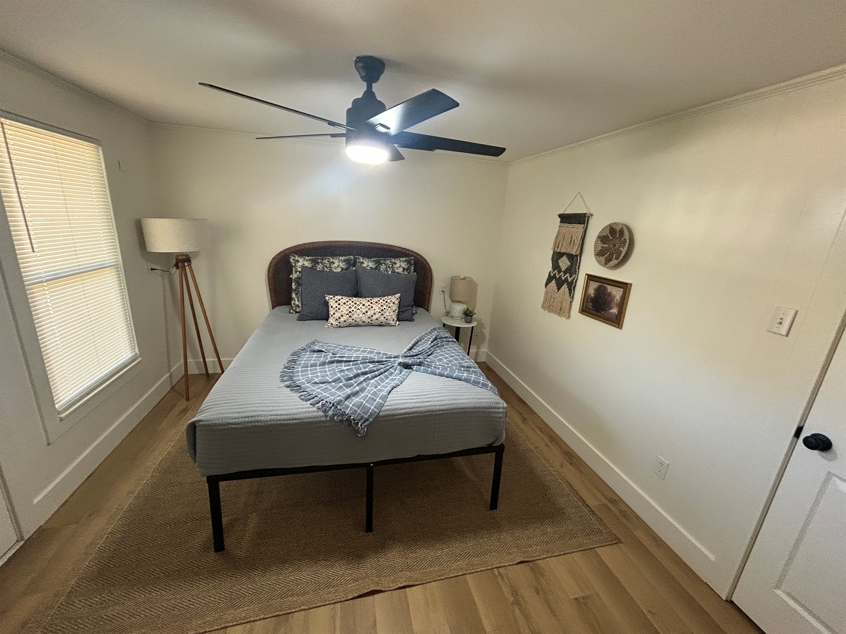 Serene sleeping quarters with quality linens, comfortable beds, and modern ceiling fans