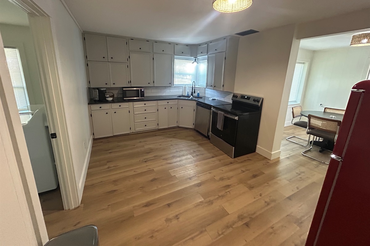 Fully Equipped Kitchen: Crisp white cabinetry with ample storage, black appliances including full-size refrigerator and electric range, and distinctive woven basket pendant lighting