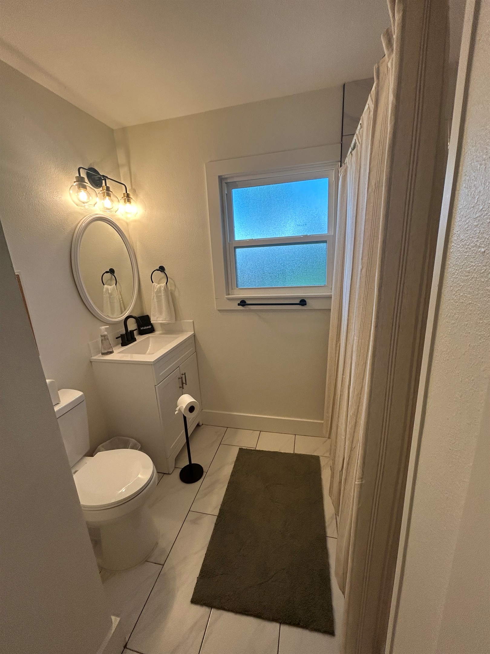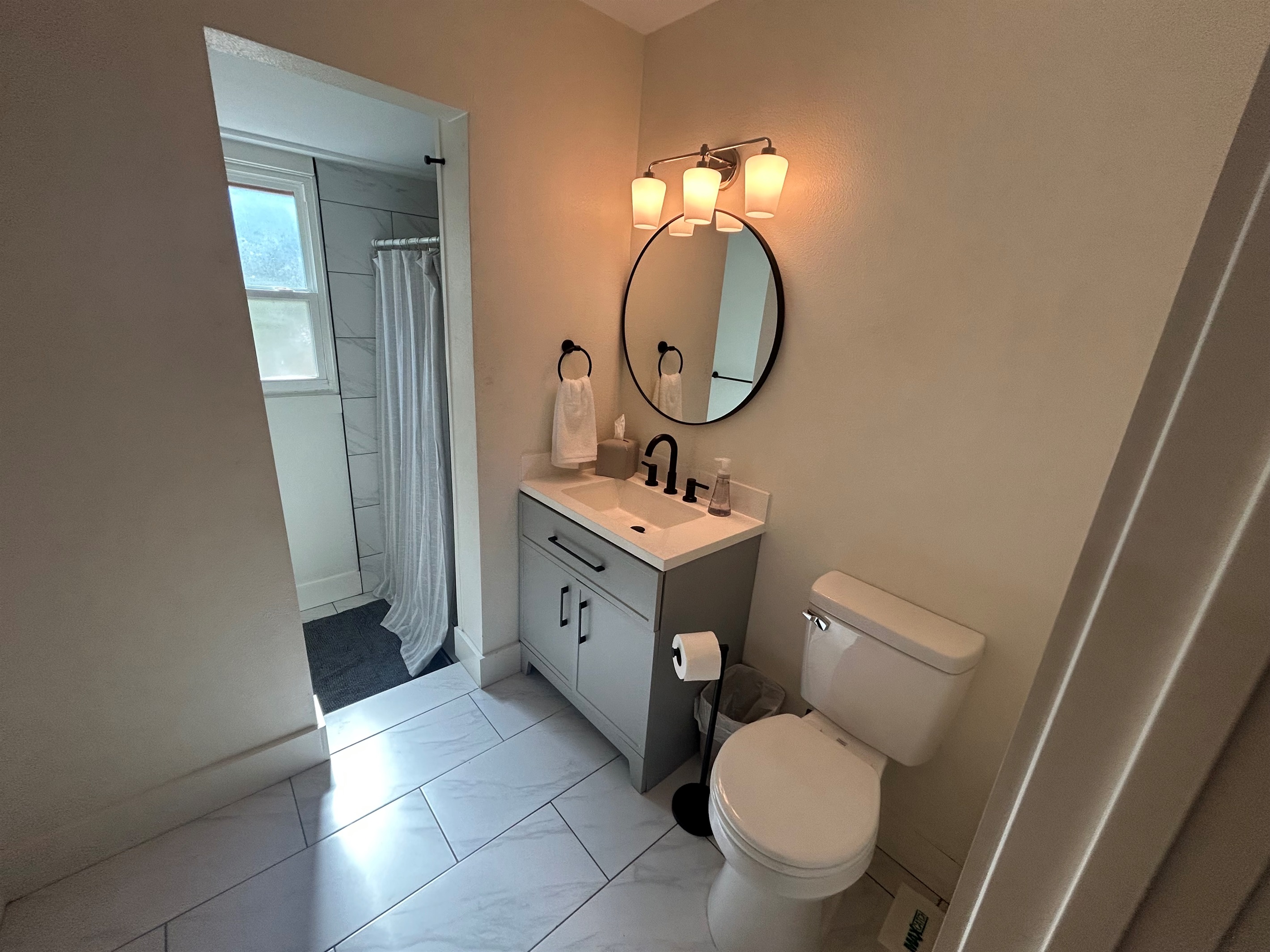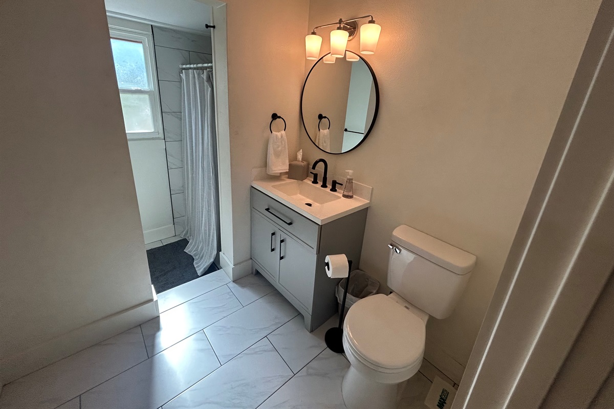 Updated Bathrooms: Modern fixtures, clean white vanities with stylish hardware, contemporary lighting, and fresh finishes throughout