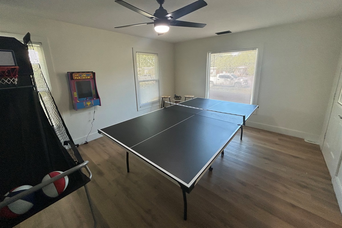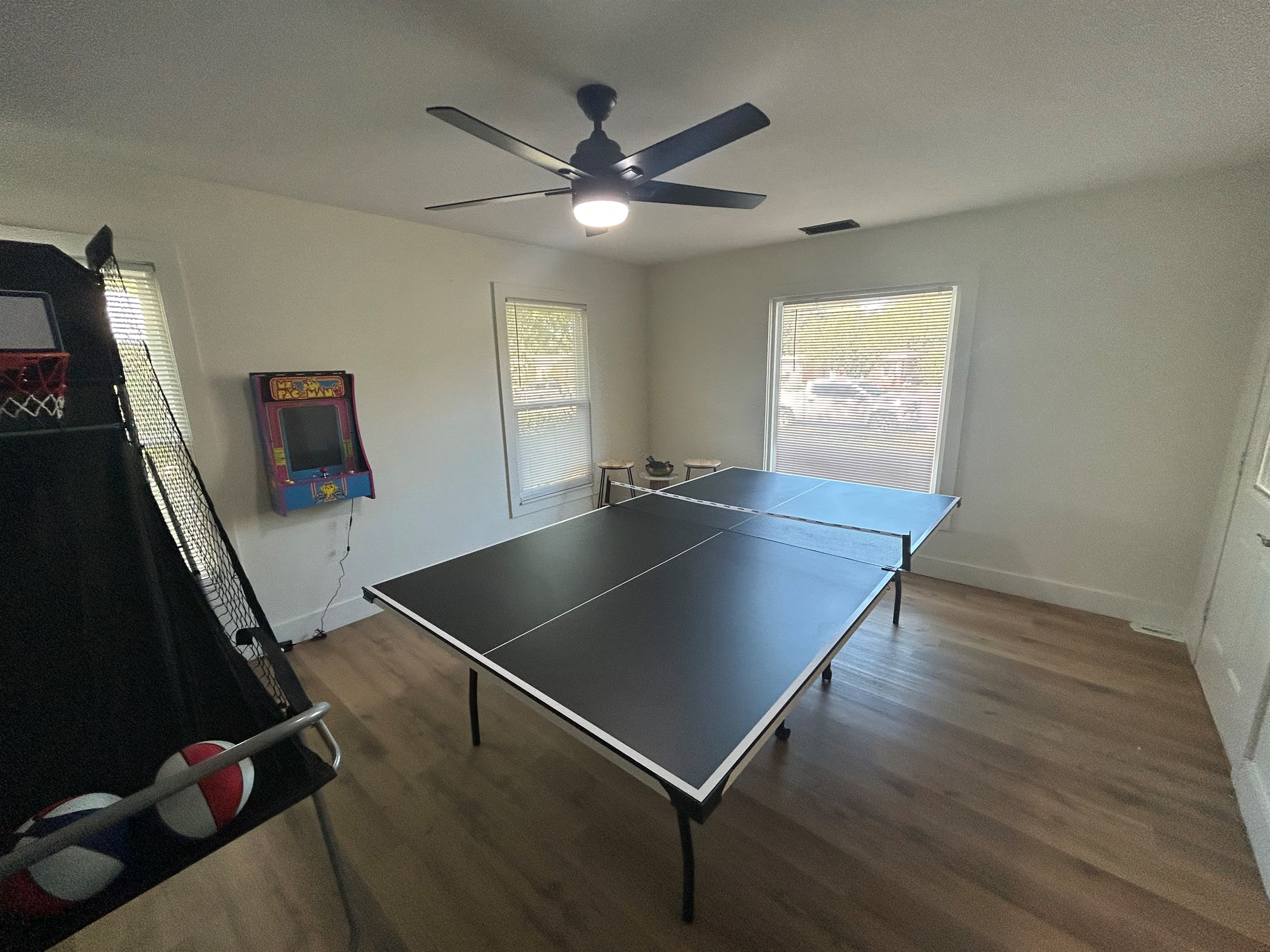 4 Bedrooms • 2 Bathrooms 2 Baths • Sleeps 4-8Discover the perfect home base just steps from Abilene Christian University! This completely renovated property combines modern comfort with unbeatable convenience, featuring gorgeous hardwood-style flooring throughout, a fully equipped kitchen with vintage flair, and unique entertainment amenities including a game room with ping pong, basketball arcade, and classic Ms. Pac-Man.