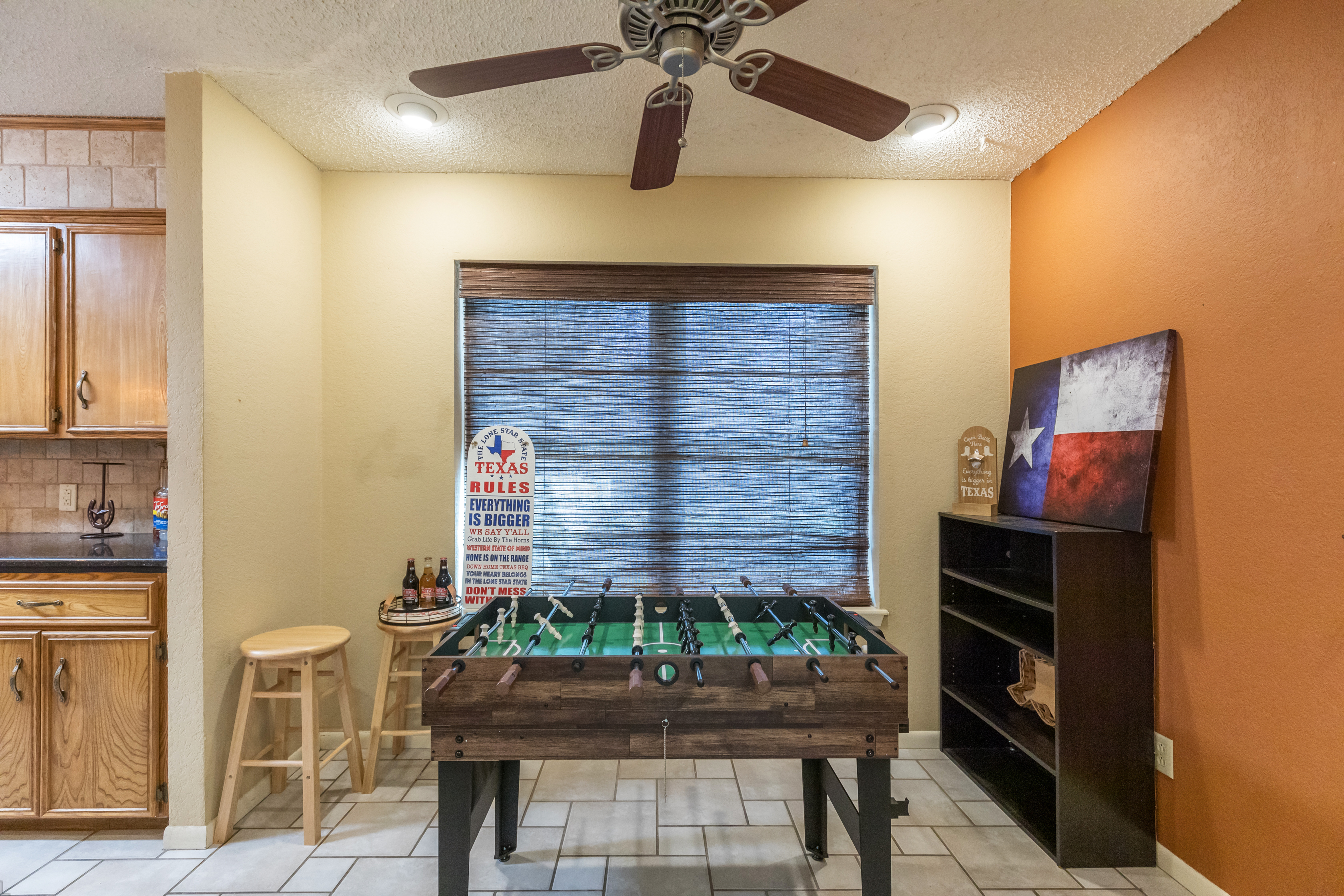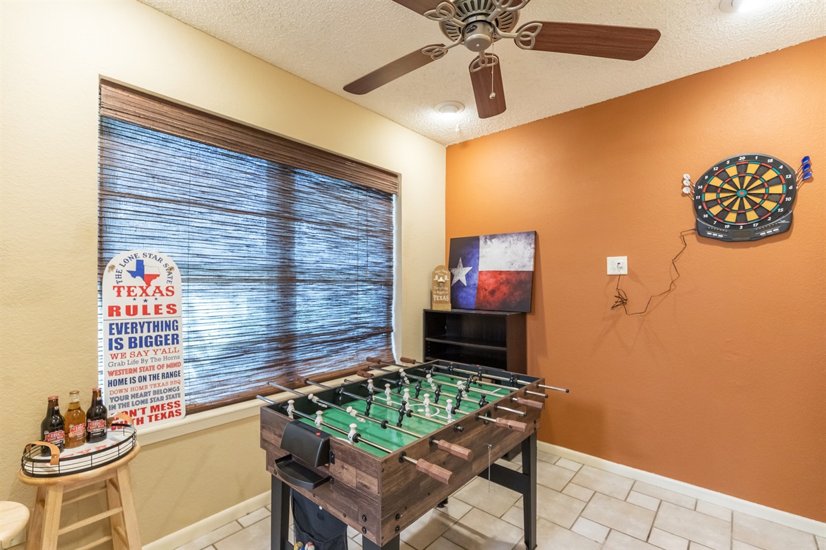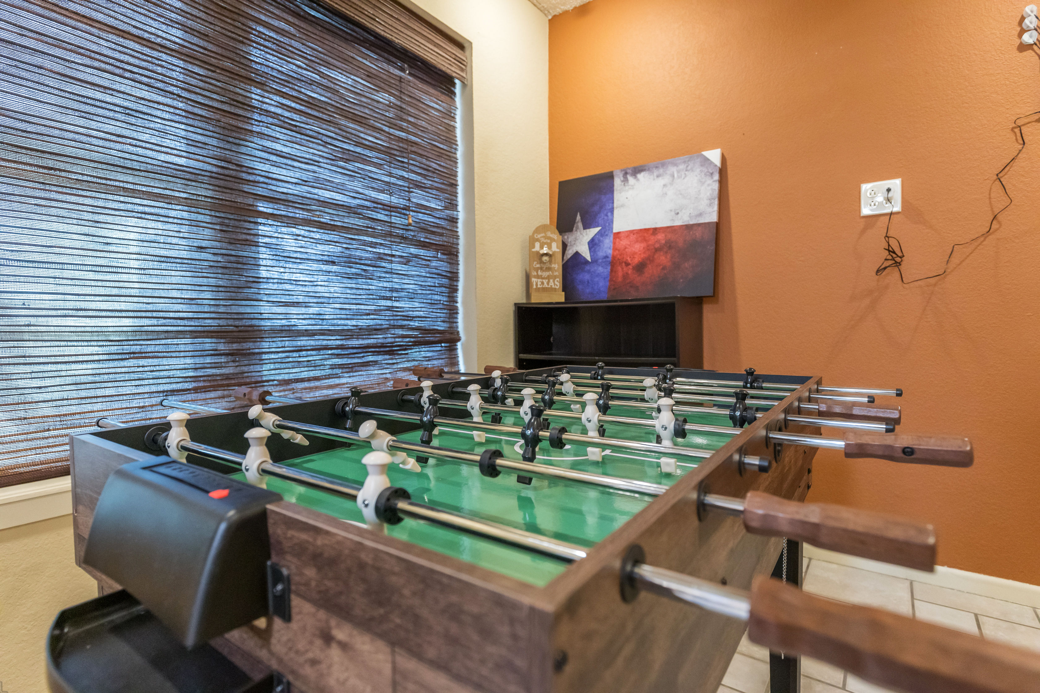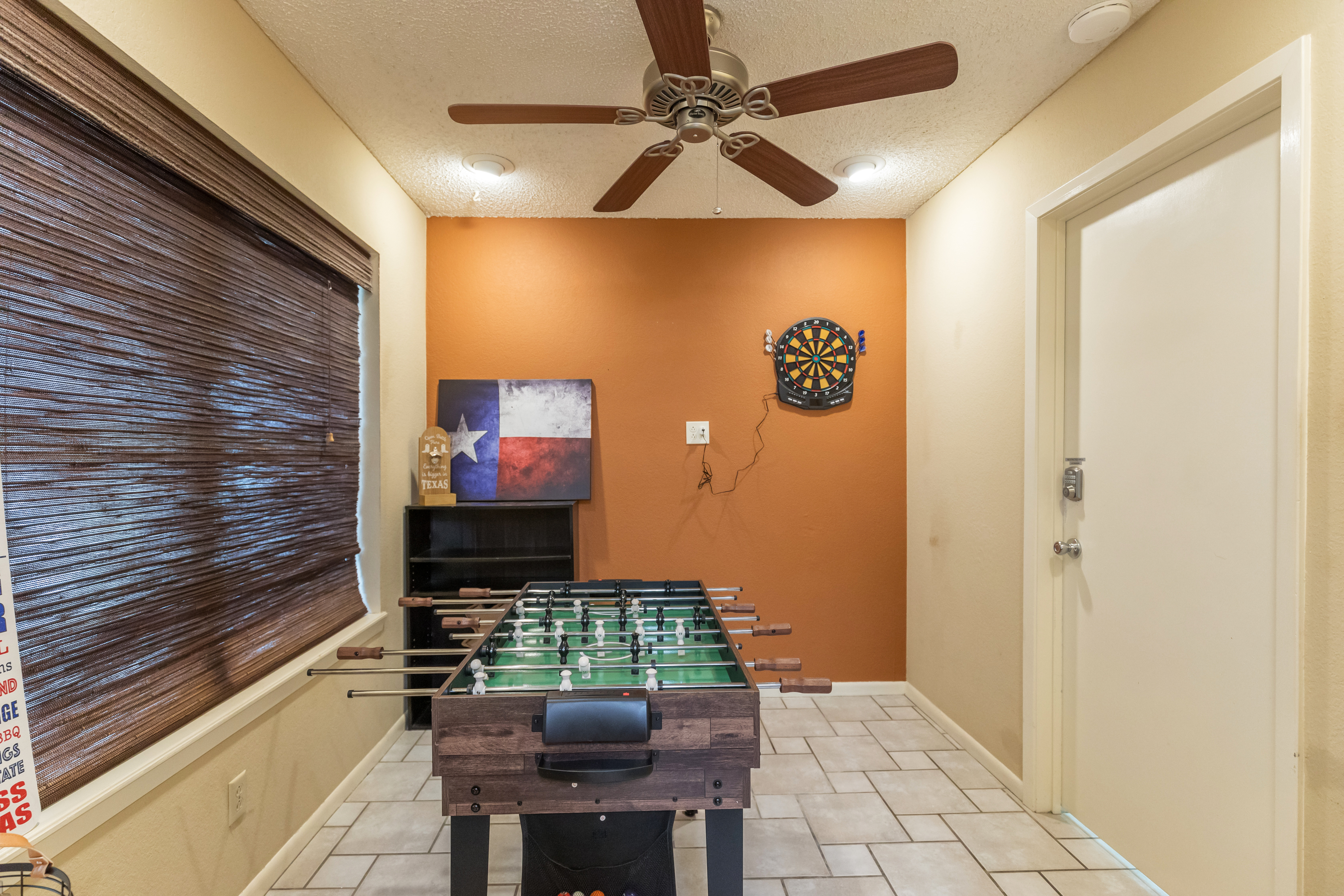 A dedicated game room with a full-size foosball table, electronic dart board (with two sets of darts!), and a Texas flag accent piece on the burnt-orange accent wall. Great for friendly competition at any hour.