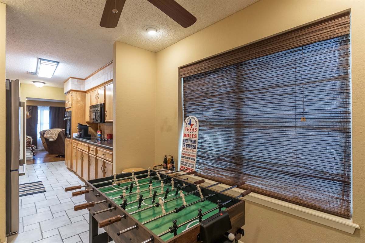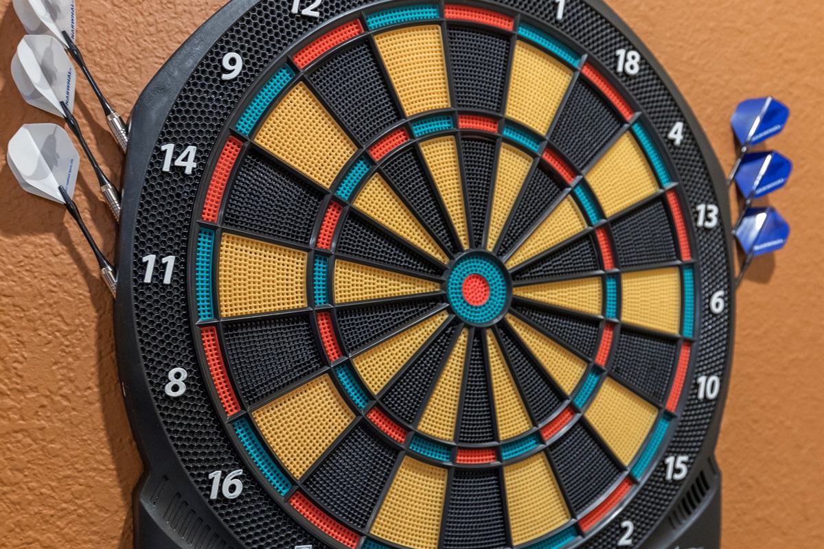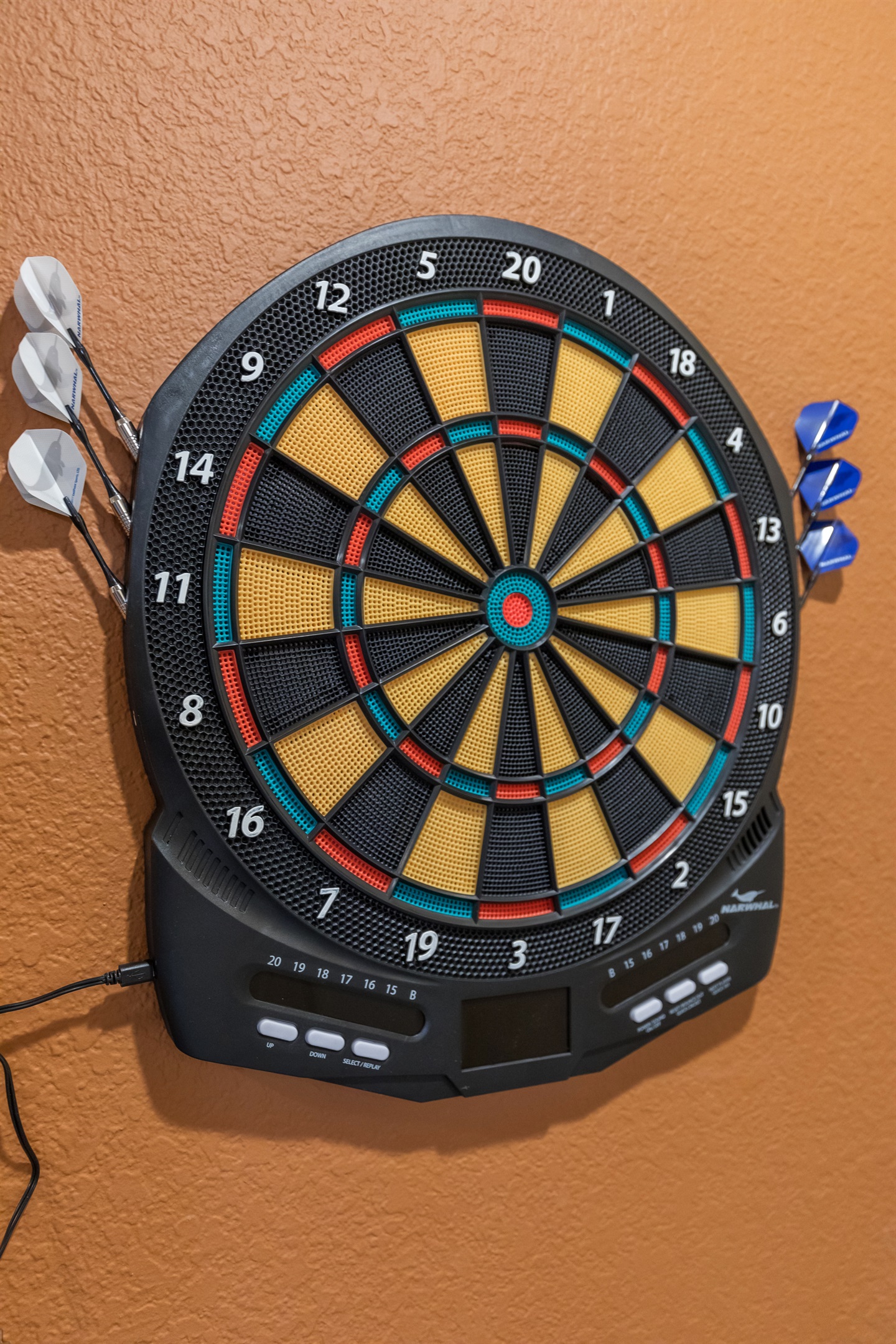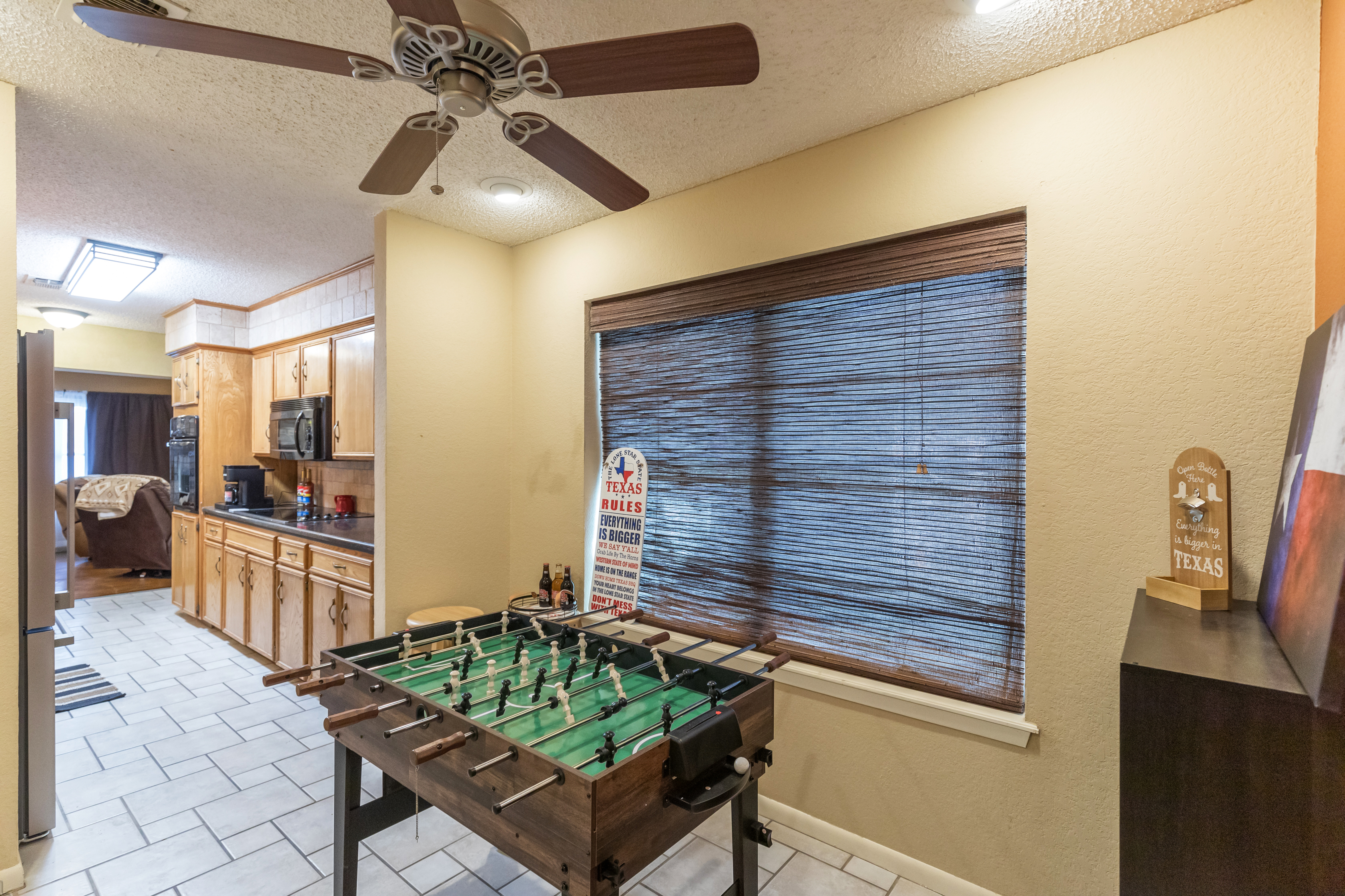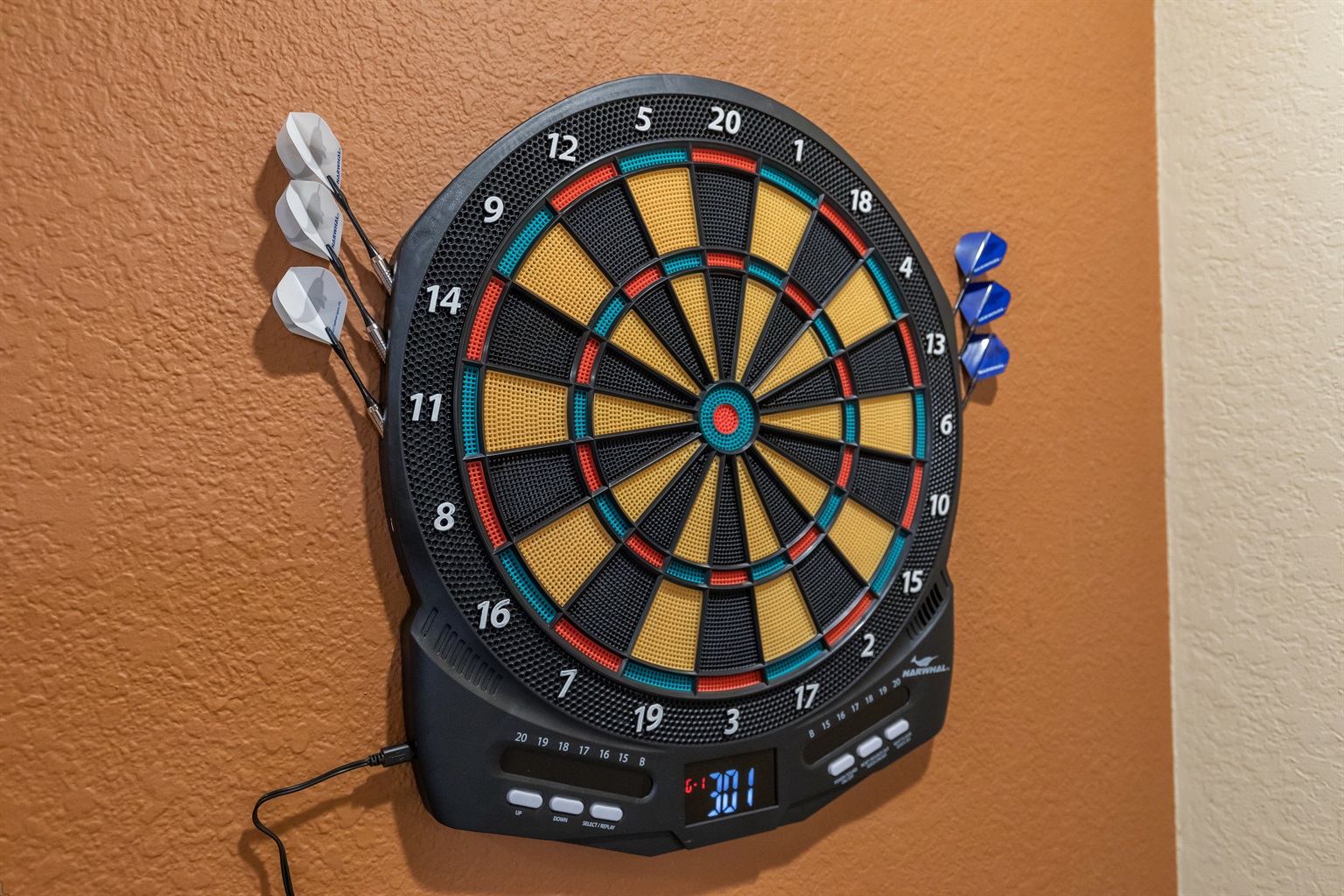 A dedicated game room with a full-size foosball table, electronic dart board (with two sets of darts!), and a Texas flag accent piece on the burnt-orange accent wall. Great for friendly competition at any hour.