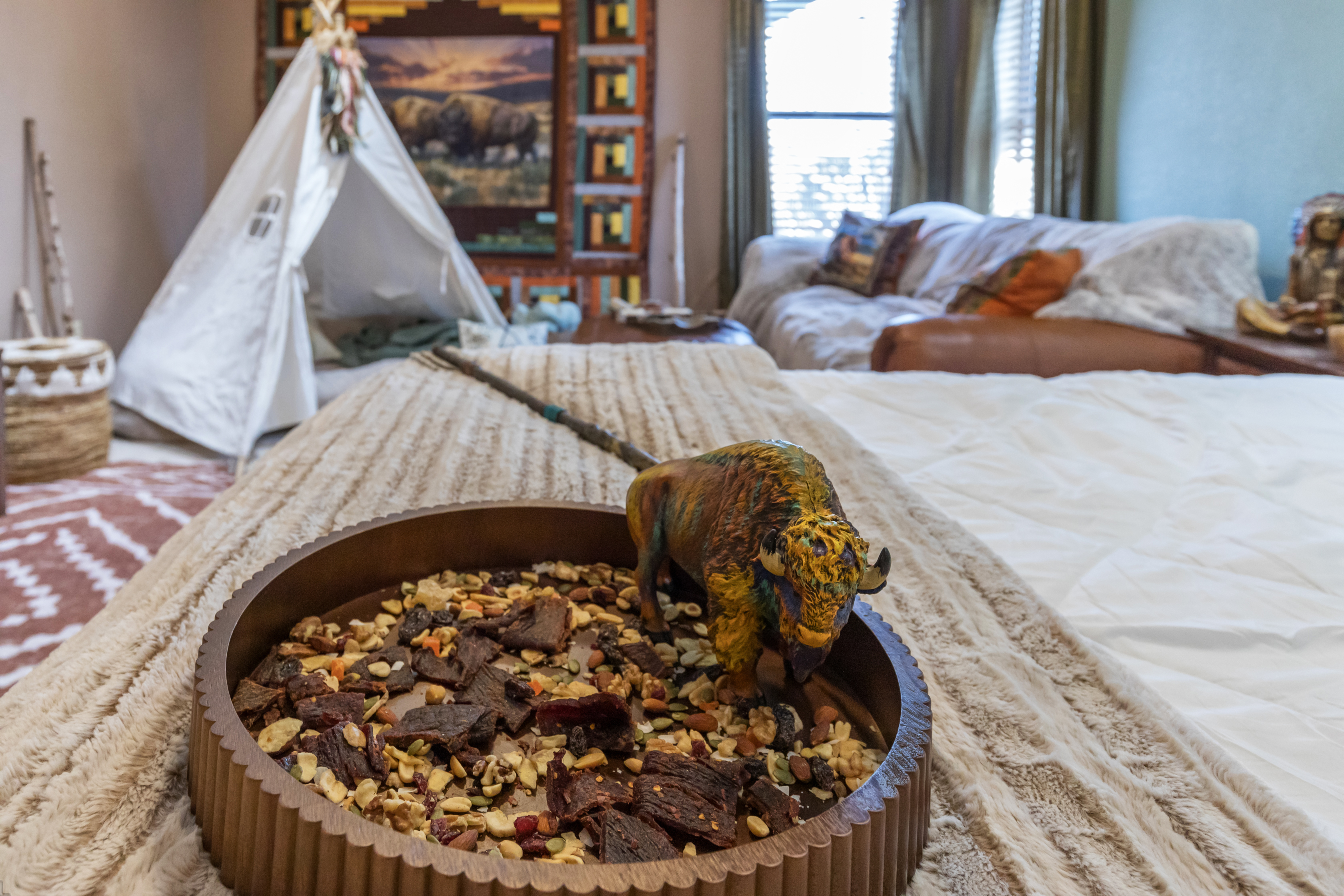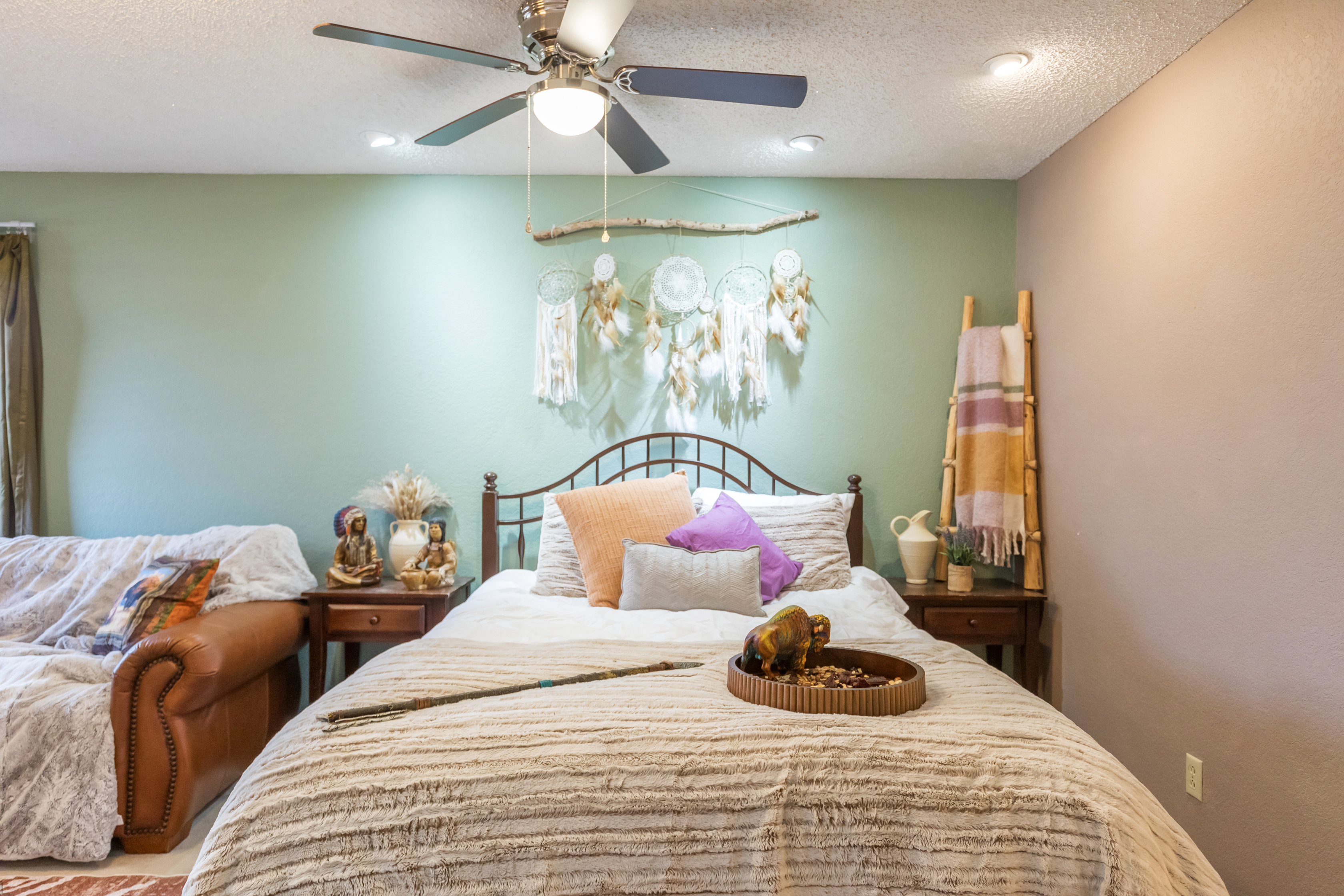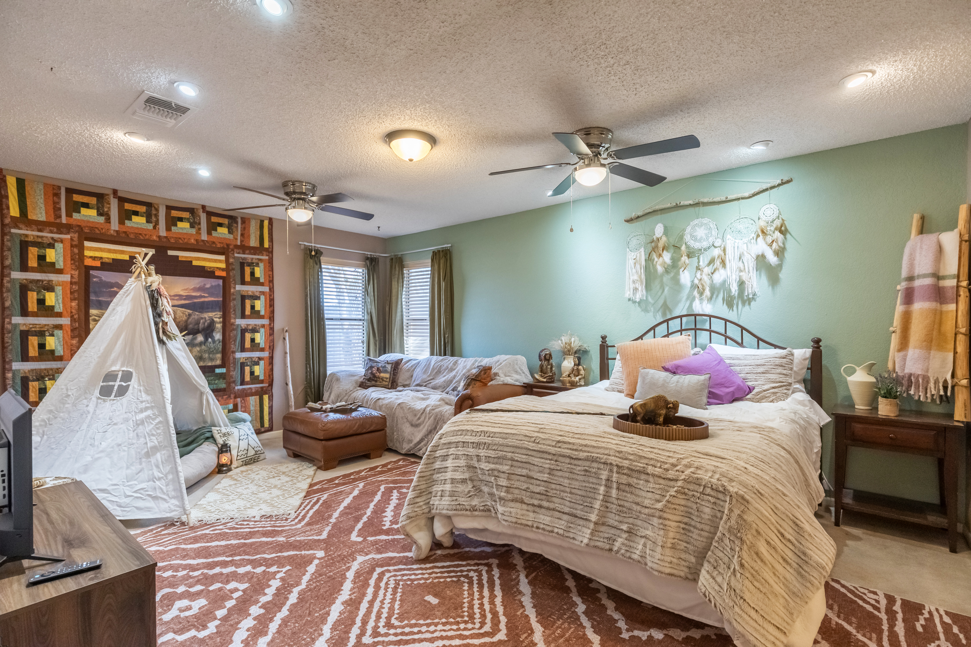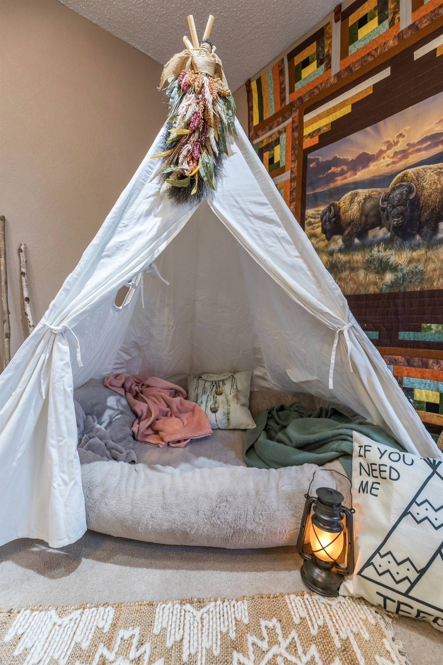 A spacious, boho-inspired master with a queen bed, full sofa chaise, Aztec rug, decorative teepee, and stunning dreamcatcher wall display. Handmade quilt wall art and a nature-painted accent wall create a peaceful, one-of-a-kind sanctuary. Private en-suite. Sleeps 2.
