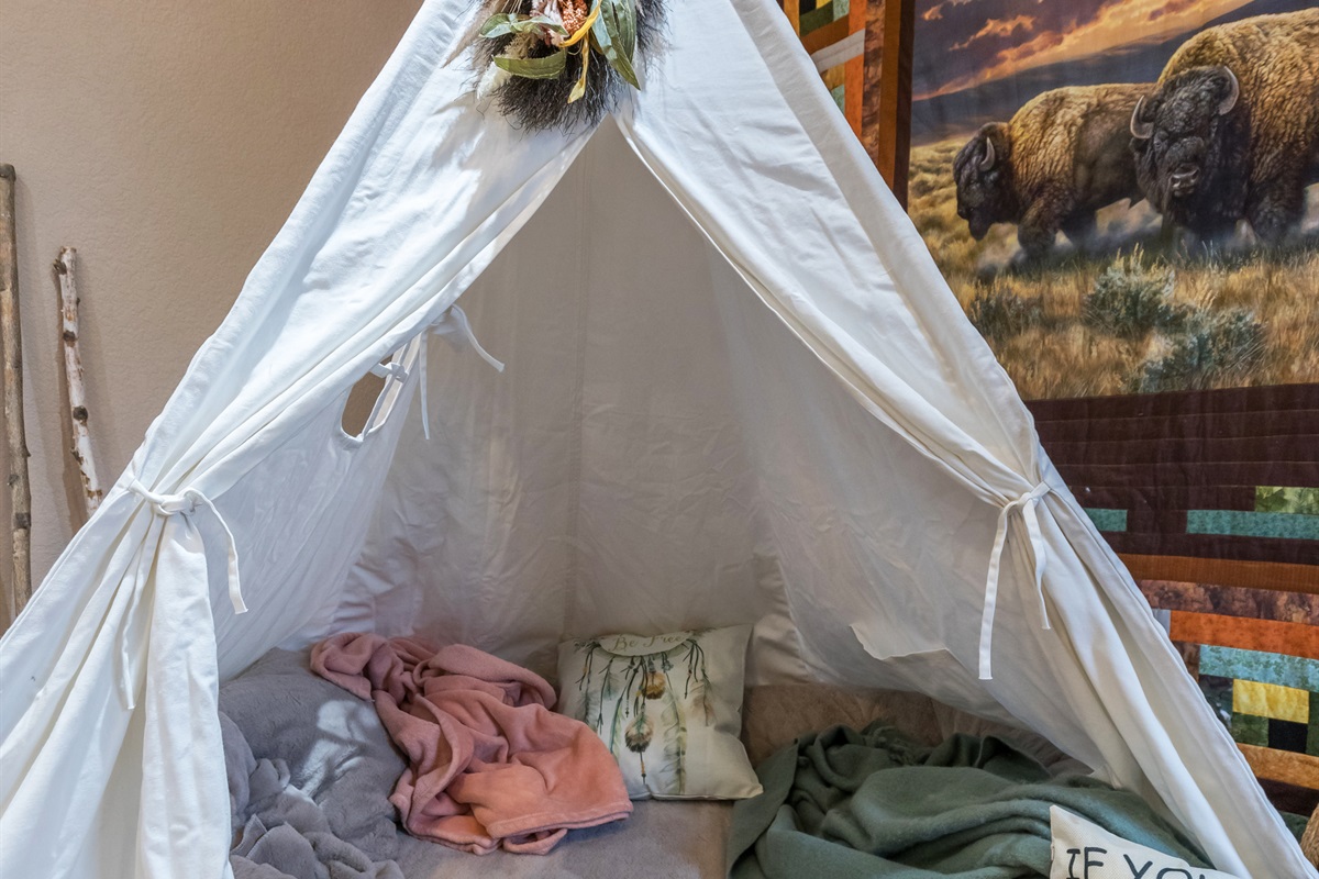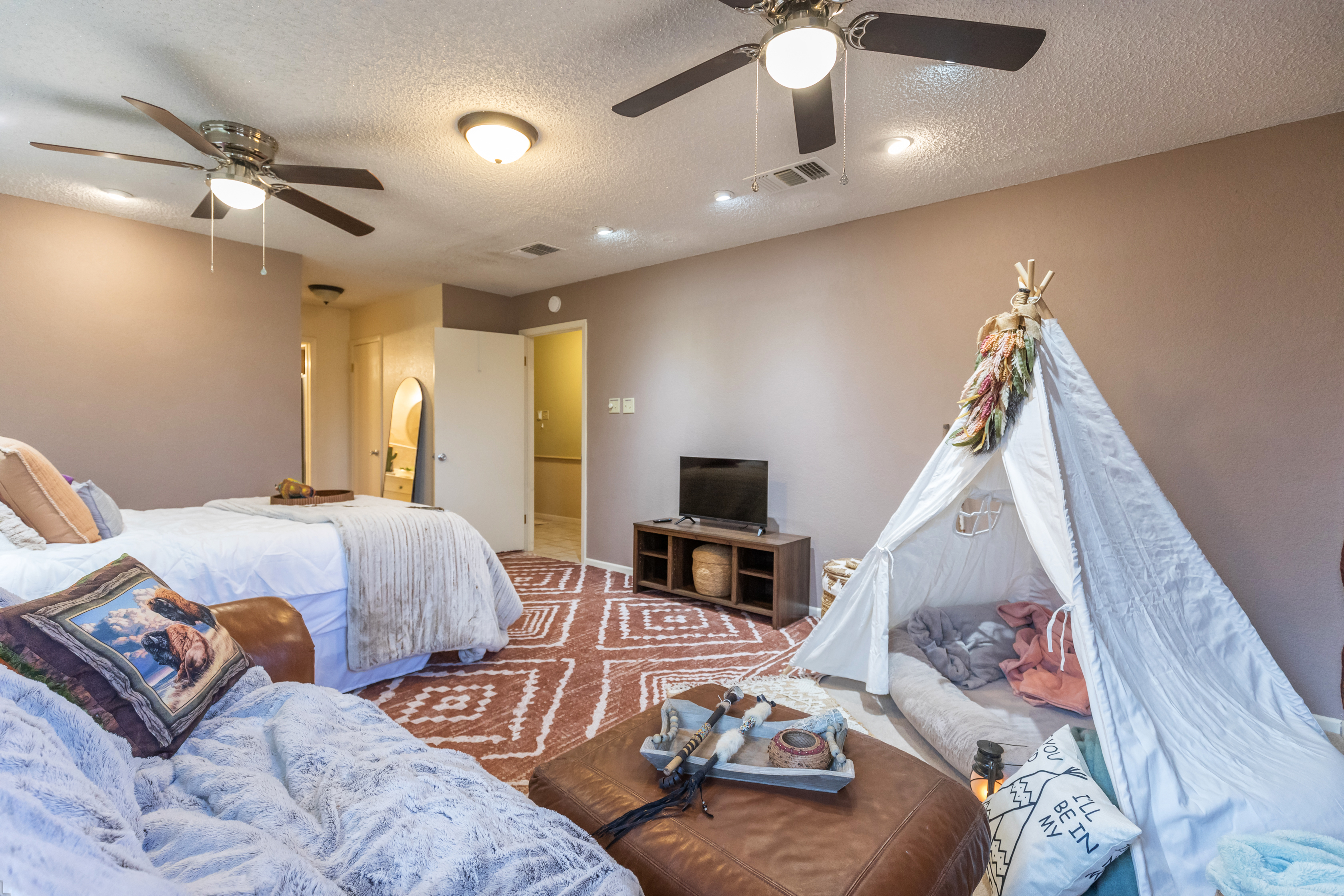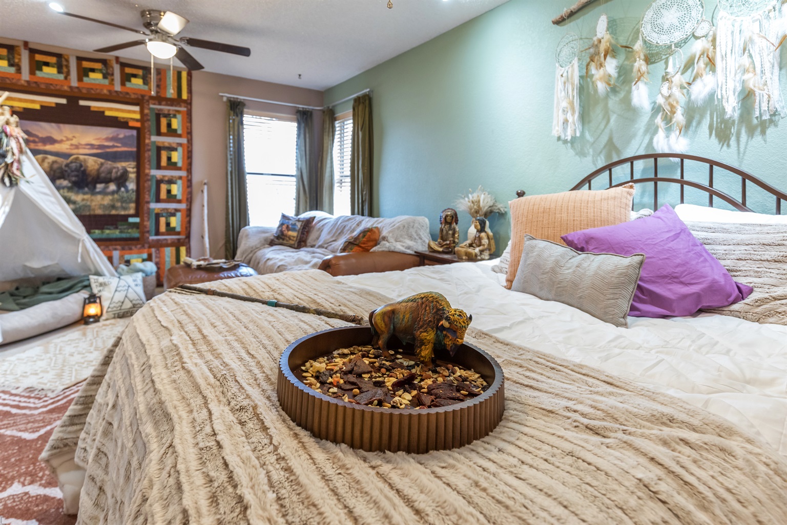 A spacious, boho-inspired master with a queen bed, full sofa chaise, Aztec rug, decorative teepee, and stunning dreamcatcher wall display. Handmade quilt wall art and a nature-painted accent wall create a peaceful, one-of-a-kind sanctuary. Private en-suite. Sleeps 2.