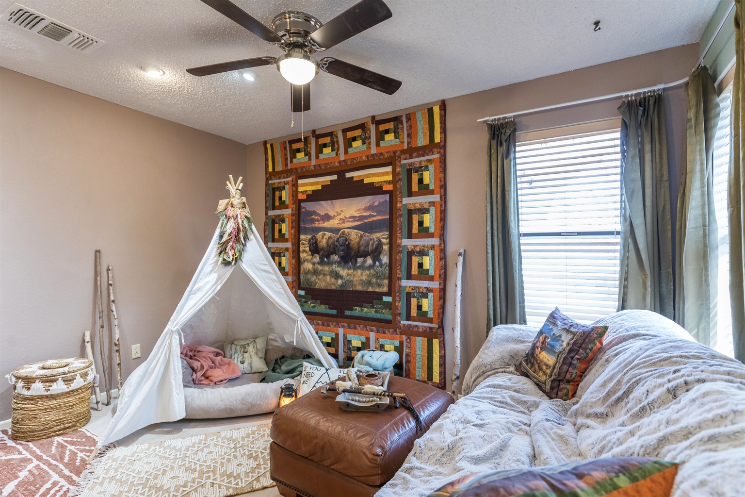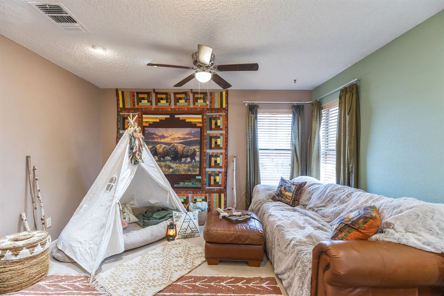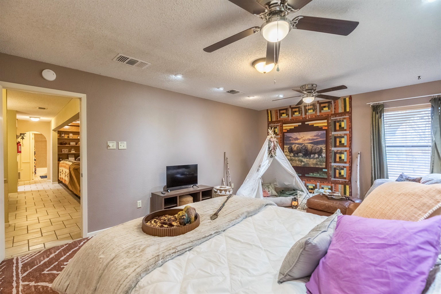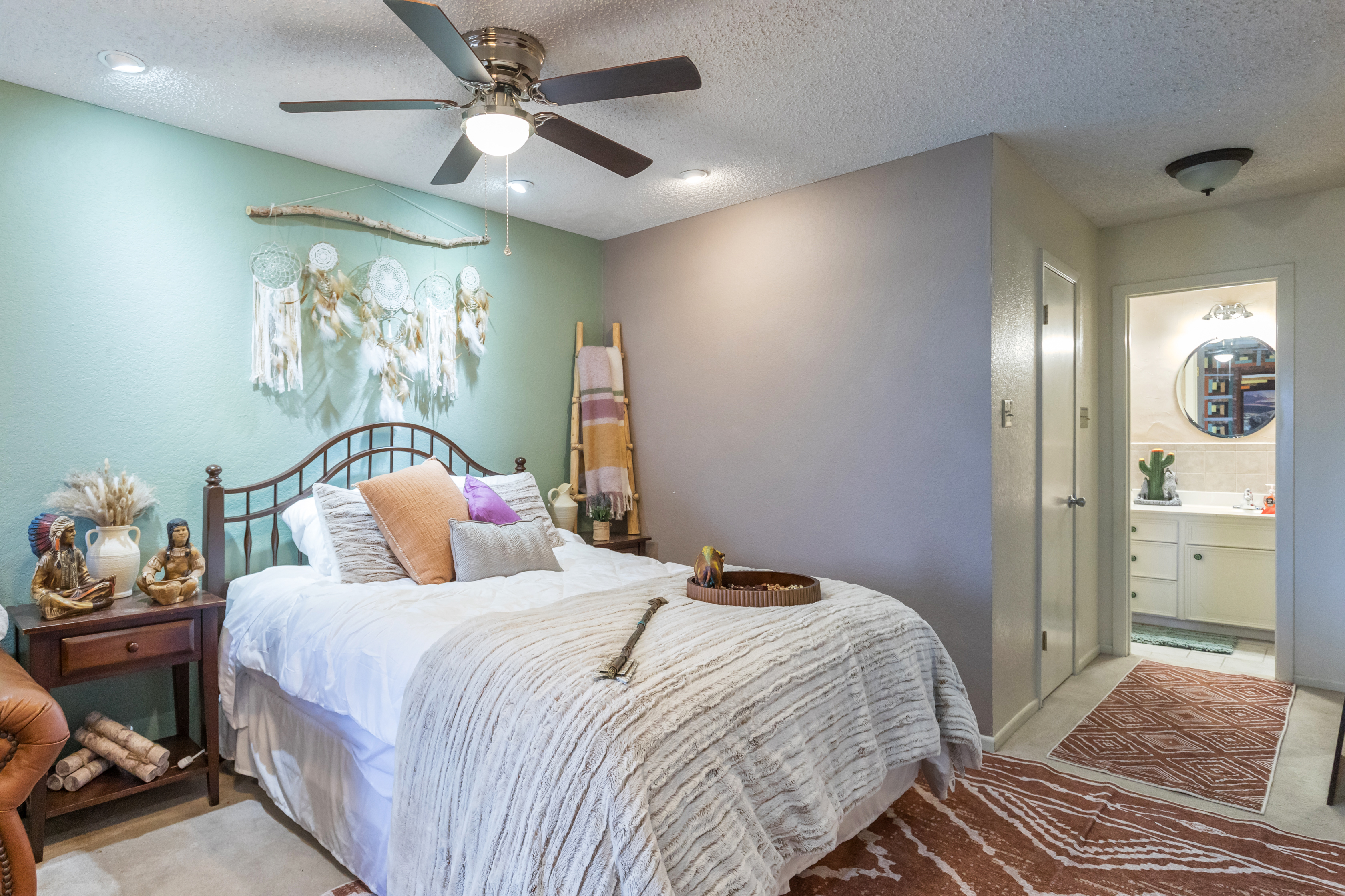 A spacious, boho-inspired master with a queen bed, full sofa chaise, Aztec rug, decorative teepee, and stunning dreamcatcher wall display. Handmade quilt wall art and a nature-painted accent wall create a peaceful, one-of-a-kind sanctuary. Private en-suite. Sleeps 2.