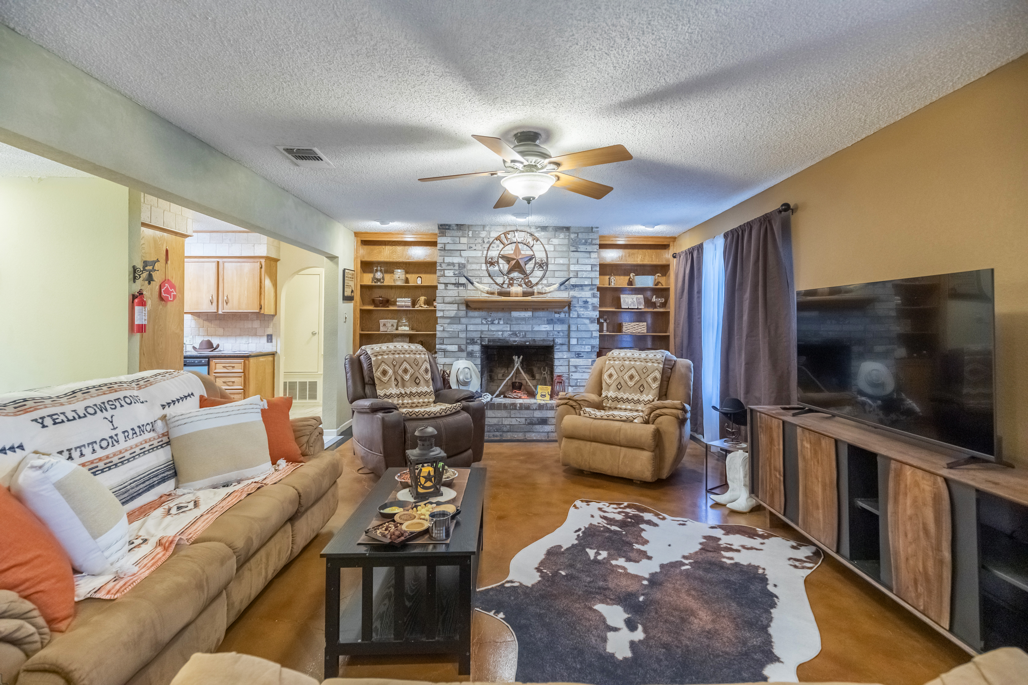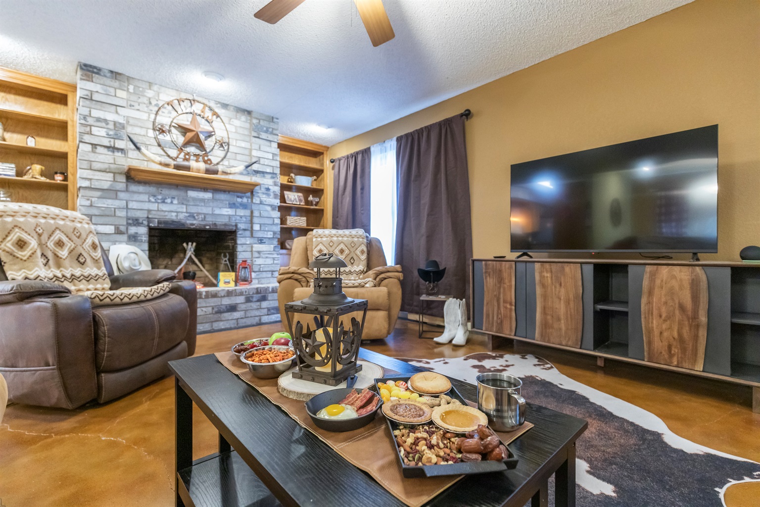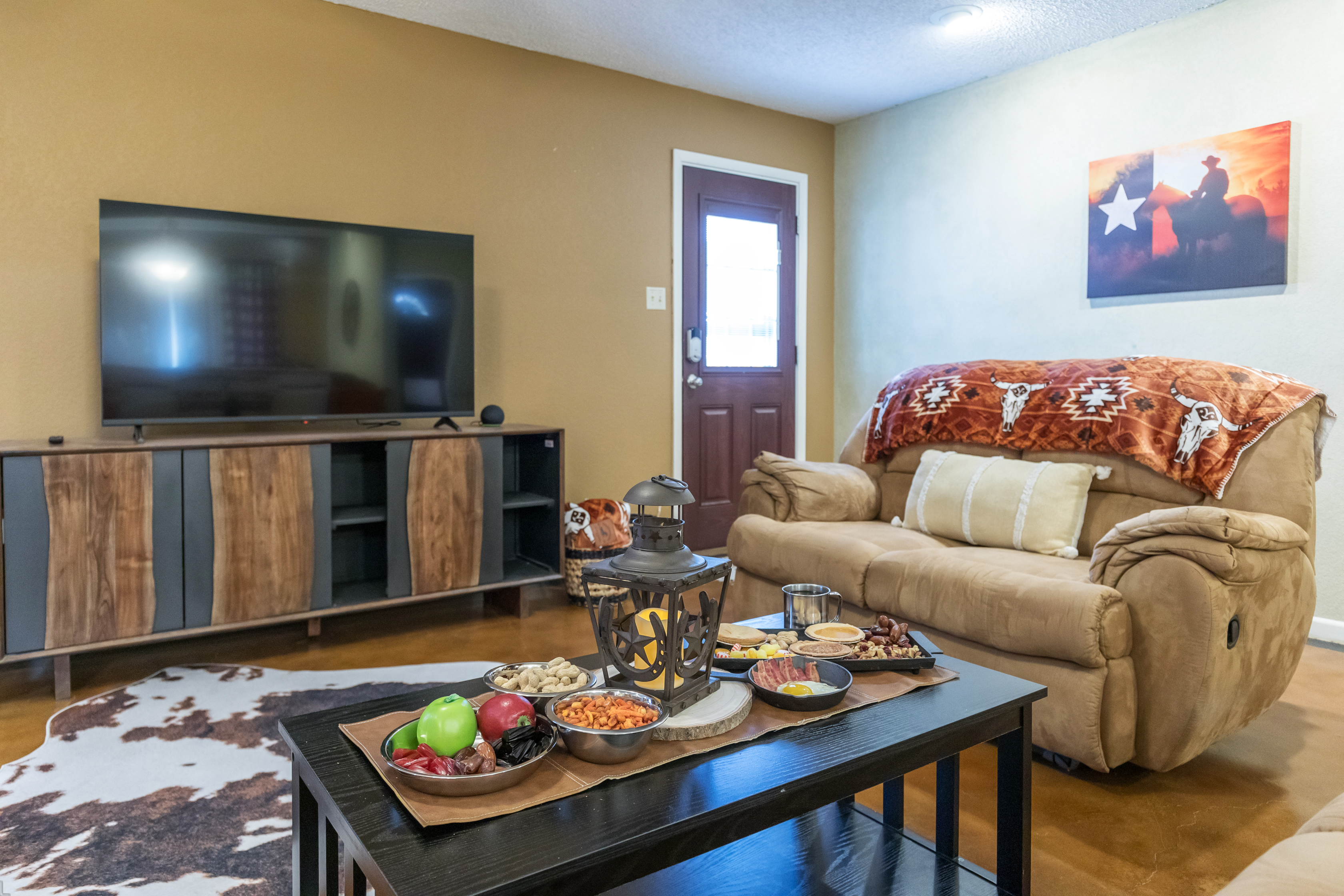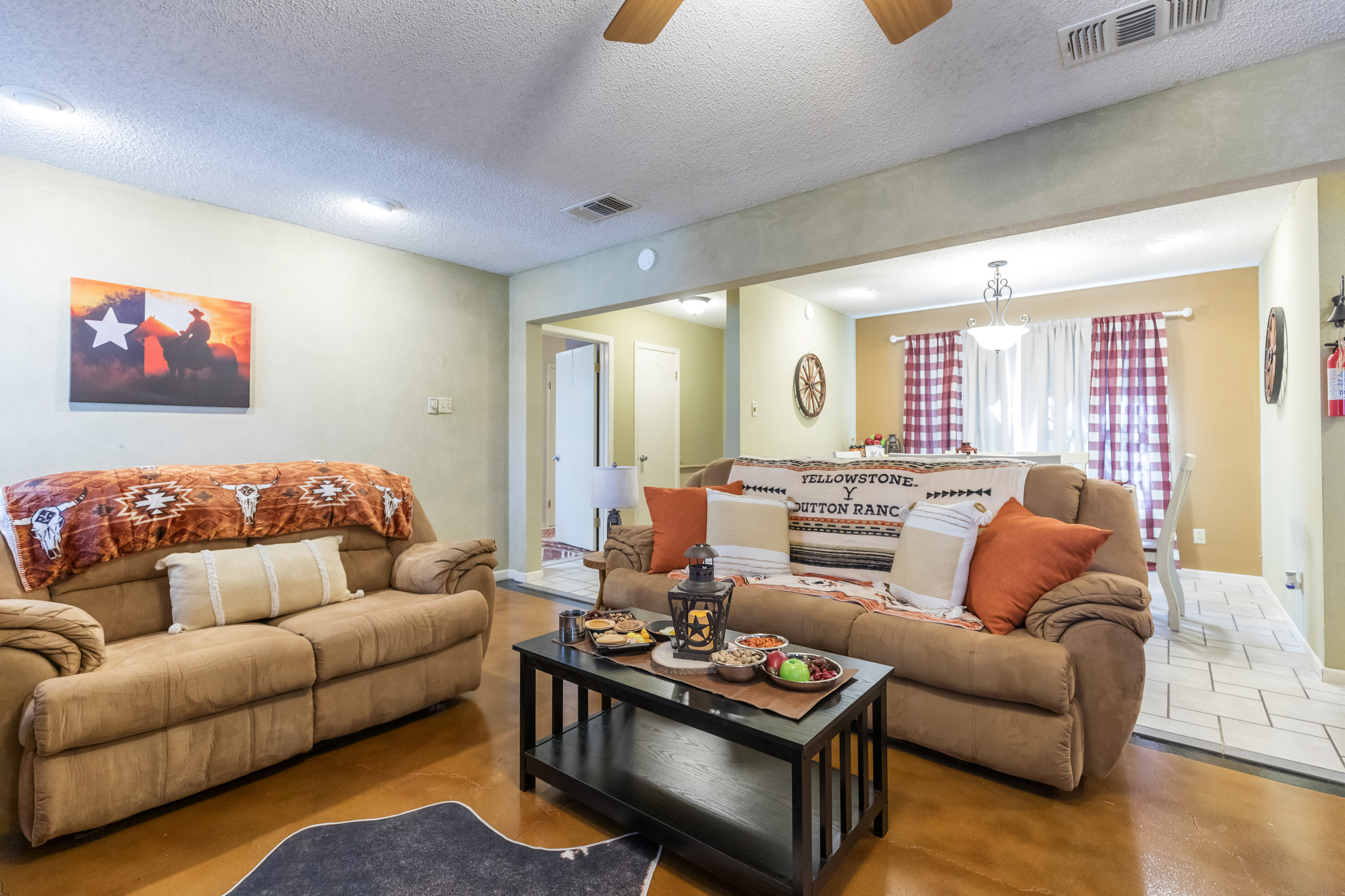 Open to the dining area, the living room features a cozy sectional and recliner, a large flat-screen TV, and Southwestern throw blankets. A Texas star medallion anchors the mantel. Perfect for movie nights or lazy afternoons.