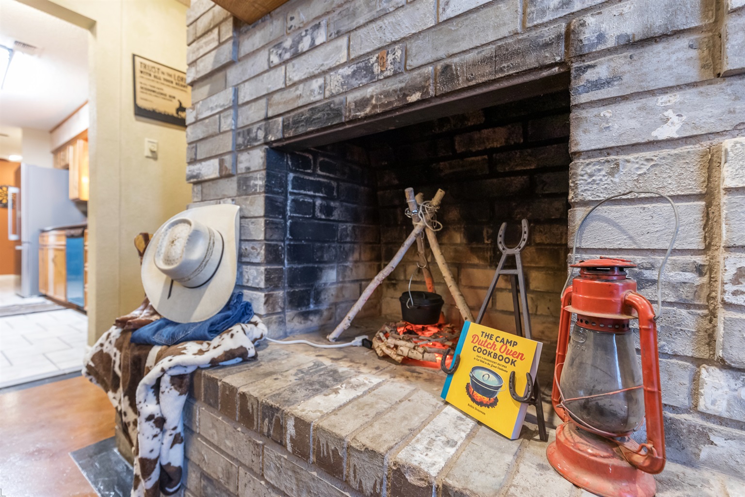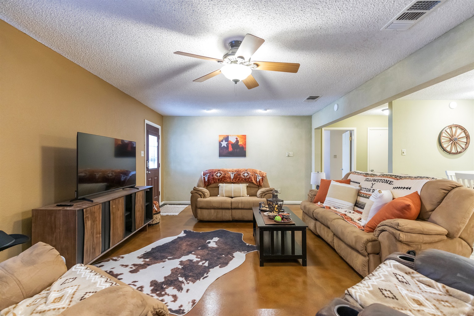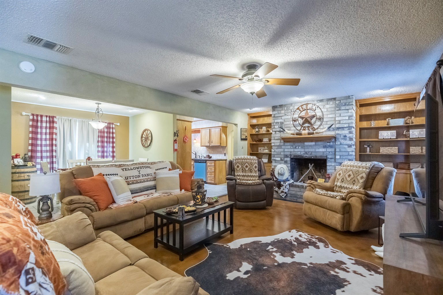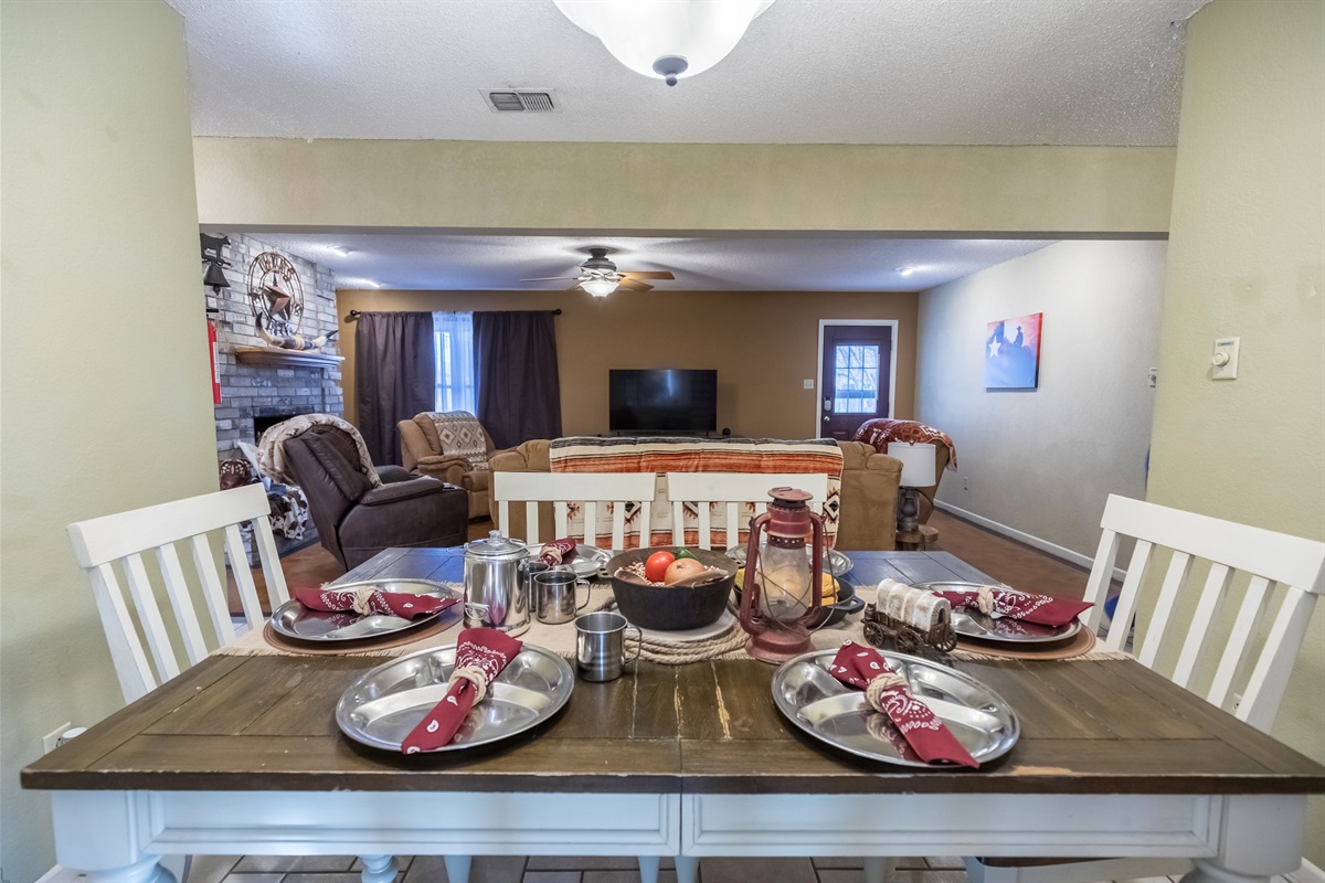 Open to the dining area, the living room features a cozy sectional and recliner, a large flat-screen TV, and Southwestern throw blankets. A Texas star medallion anchors the mantel. Perfect for movie nights or lazy afternoons.