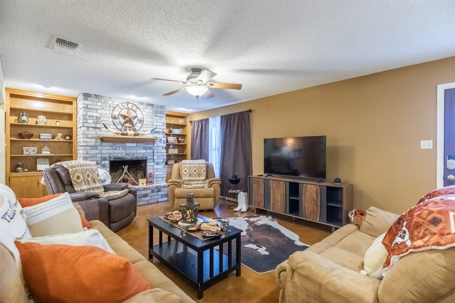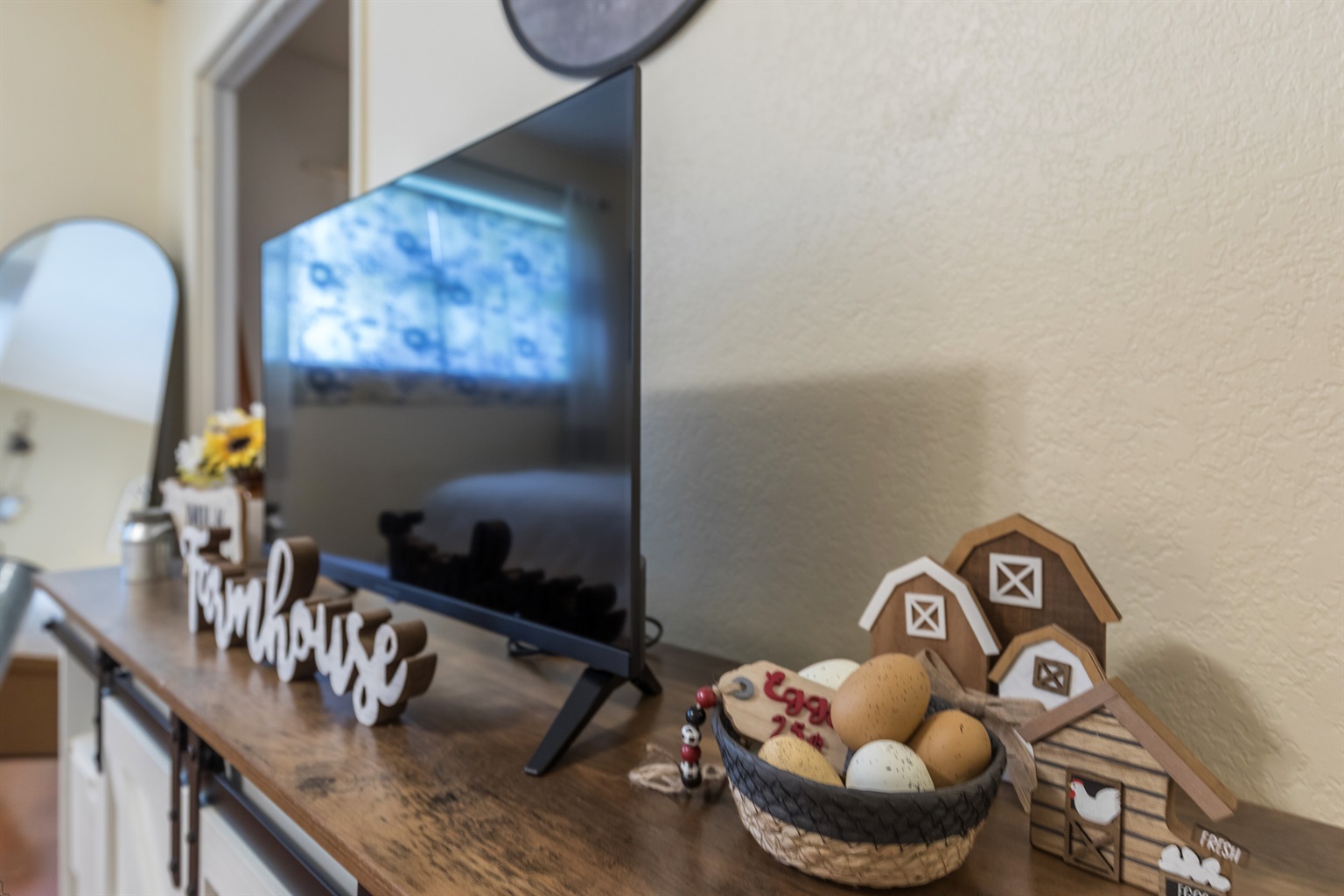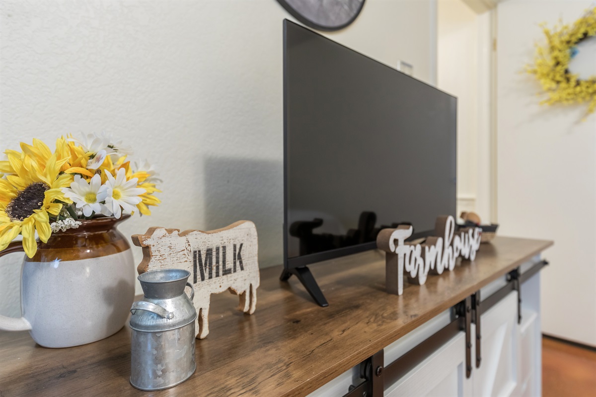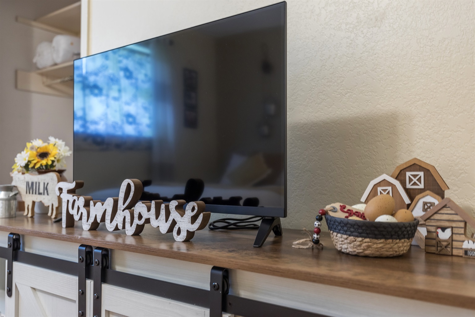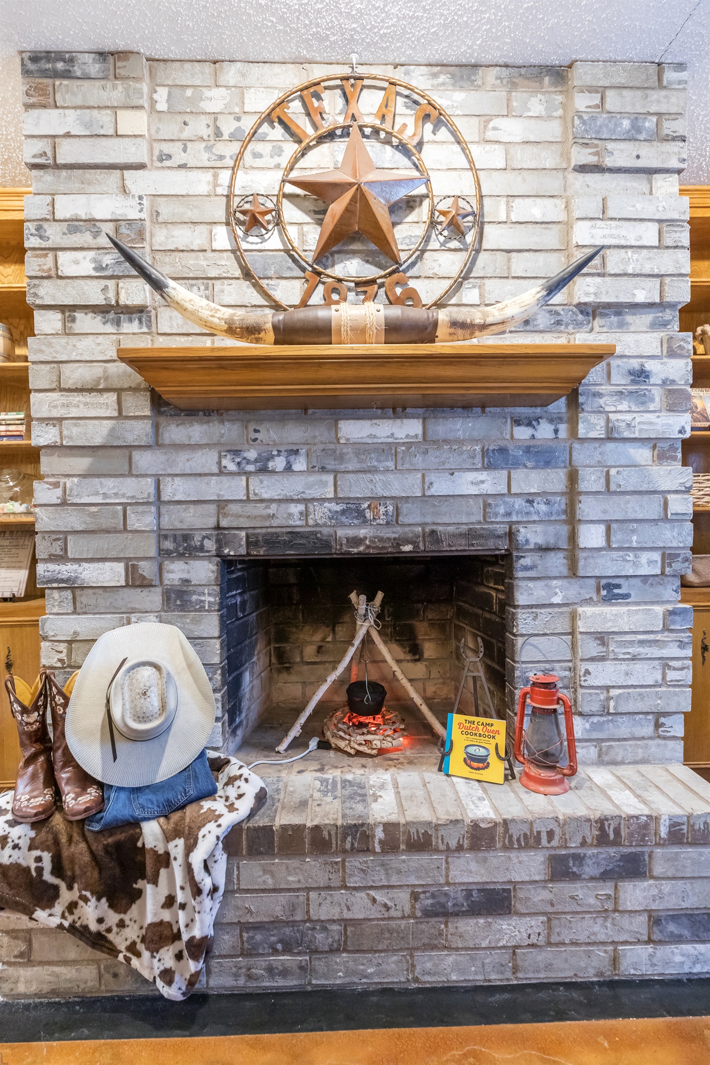 Open to the dining area, the living room features a cozy sectional and recliner, a large flat-screen TV, and Southwestern throw blankets. A Texas star medallion anchors the mantel. Perfect for movie nights or lazy afternoons.