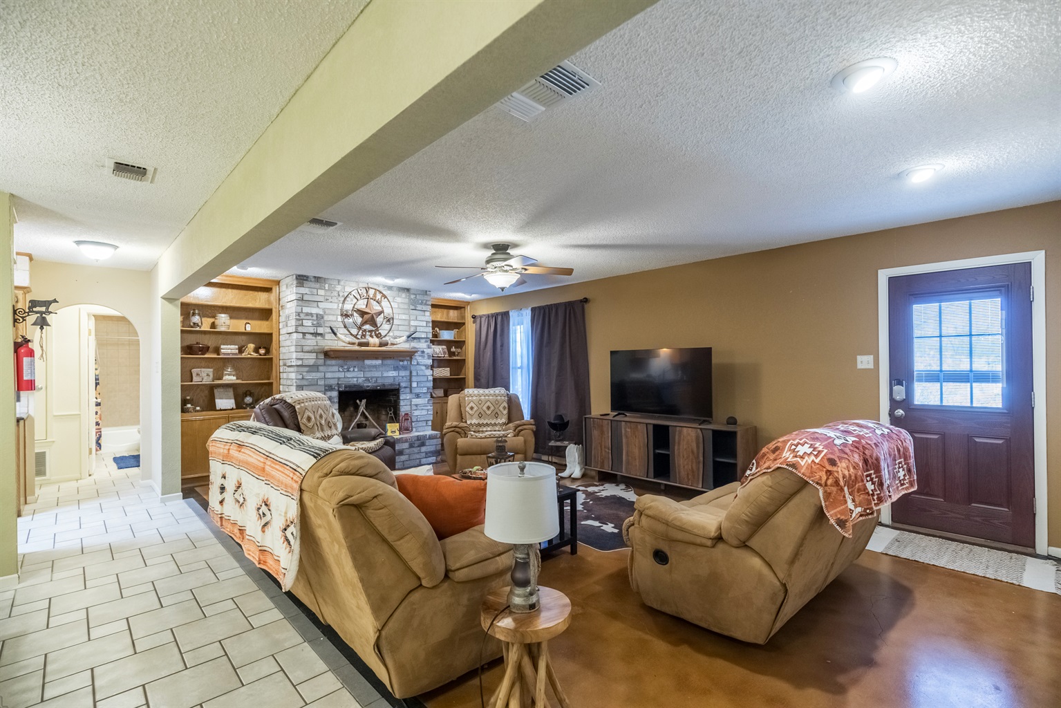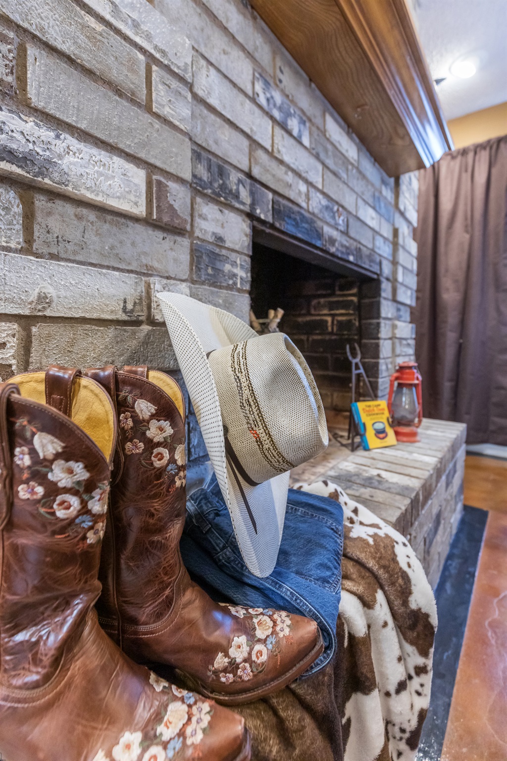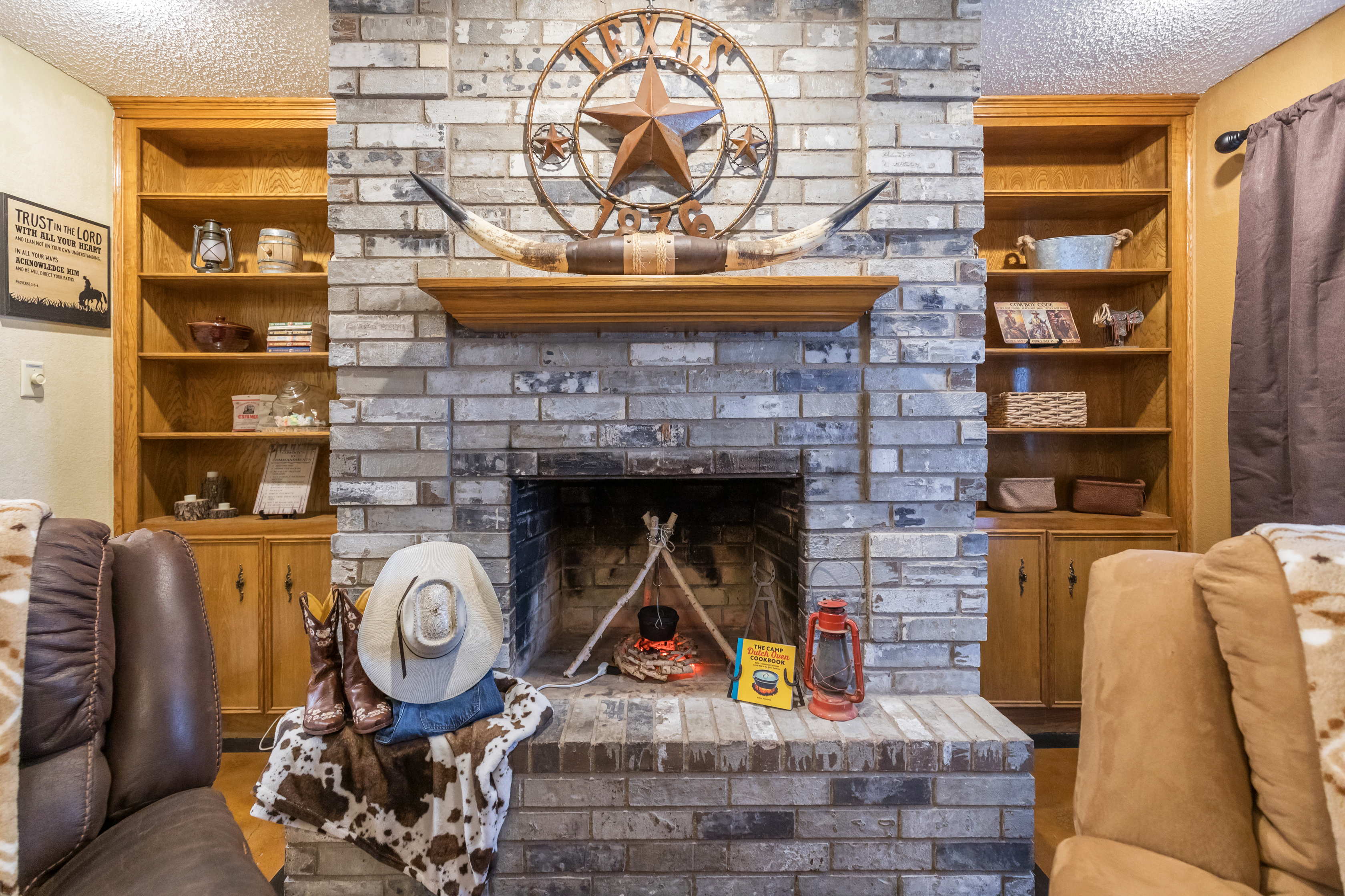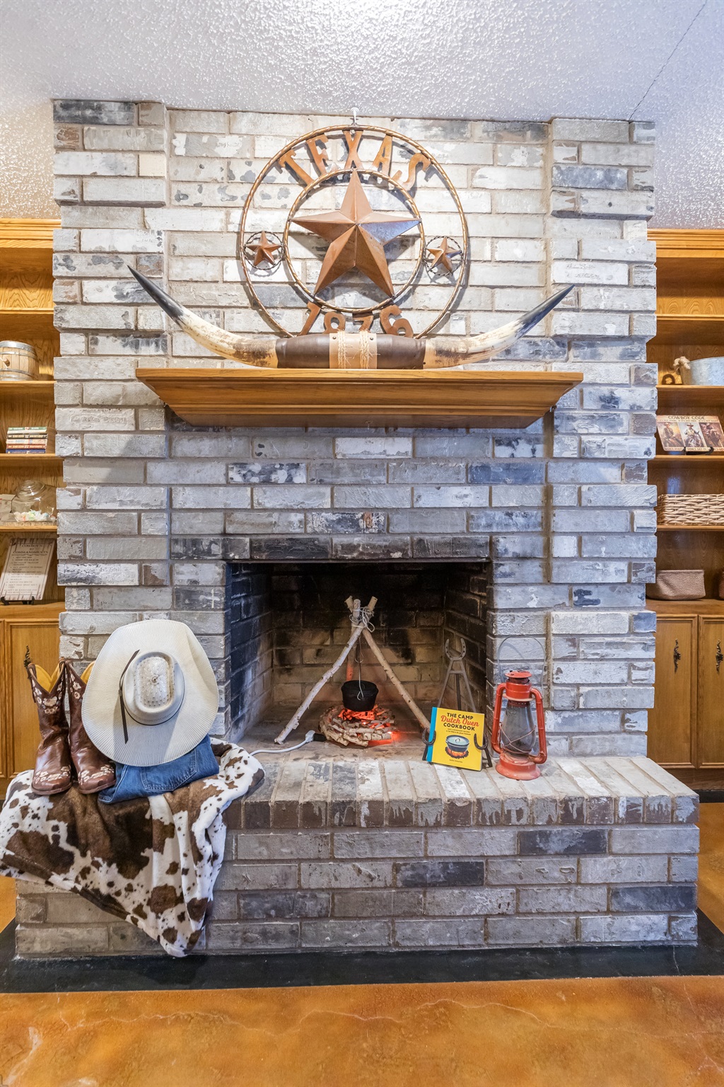 Open to the dining area, the living room features a cozy sectional and recliner, a large flat-screen TV, and Southwestern throw blankets. A Texas star medallion anchors the mantel. Perfect for movie nights or lazy afternoons.