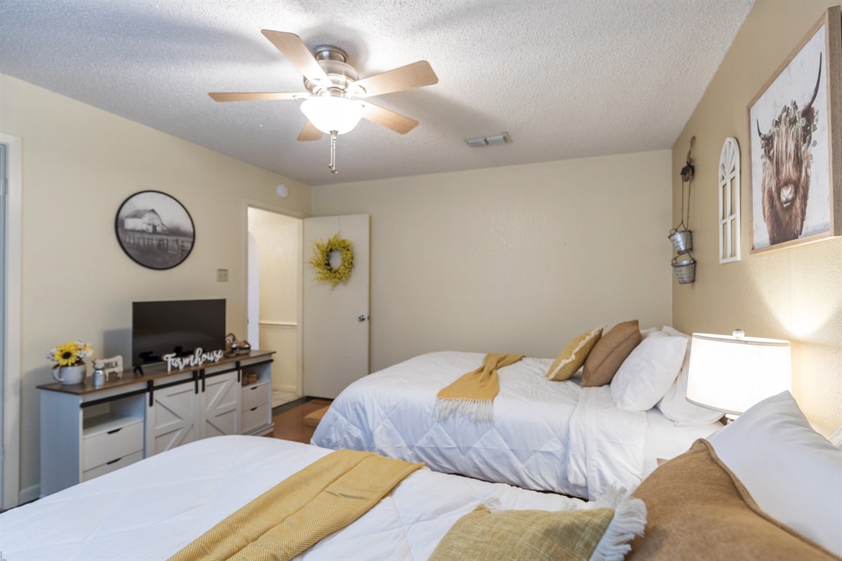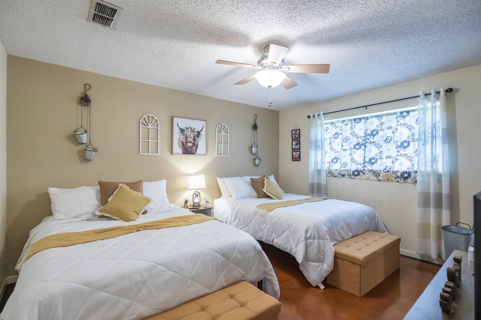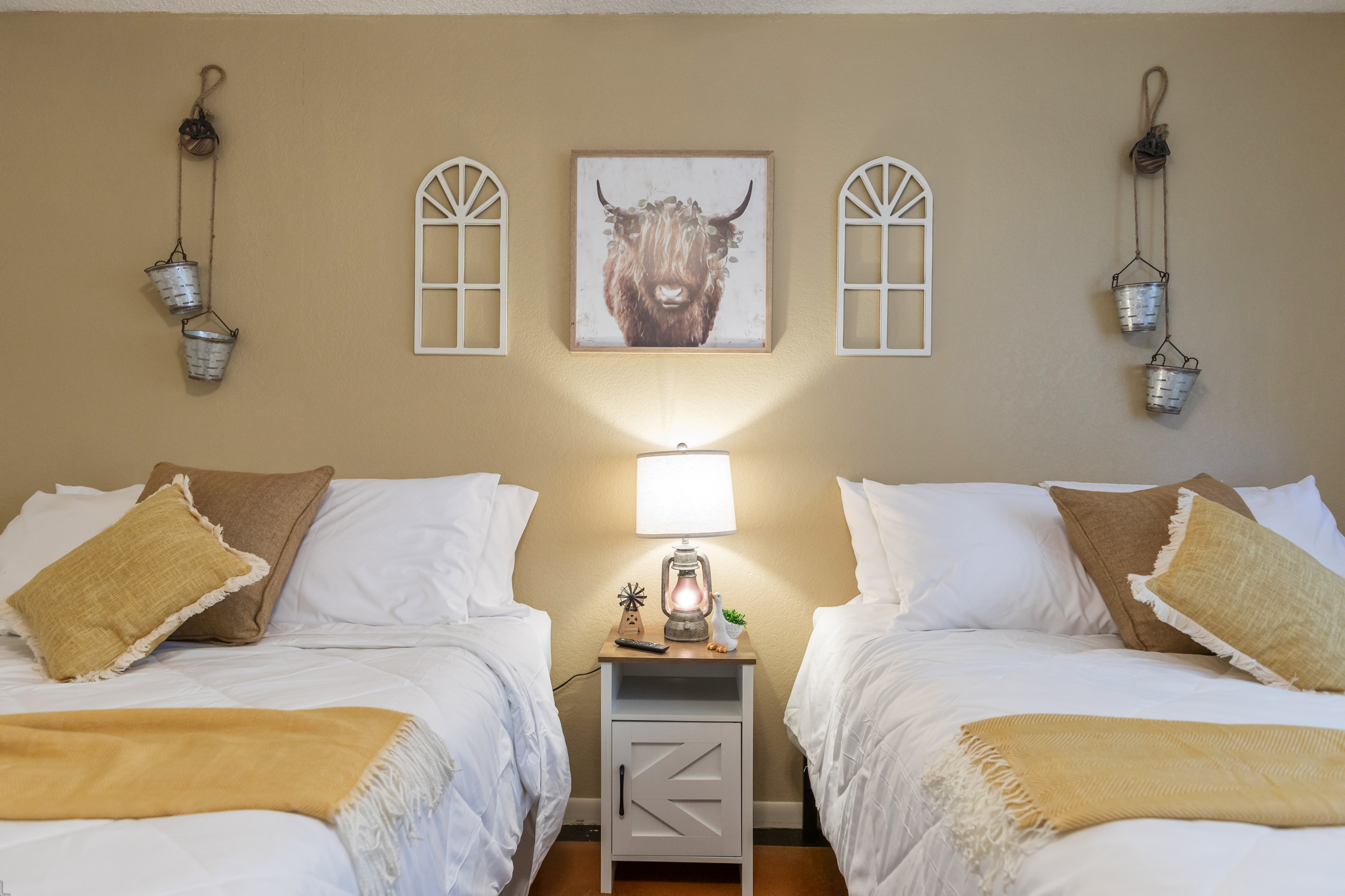 Two plush full beds dressed in crisp white linens with mustard-gold throws. Adorned with a framed Highland cow print, arched window wall décor, and hanging galvanized bucket accents. Cozy farmhouse lantern nightstand between the beds. Sleeps 4.