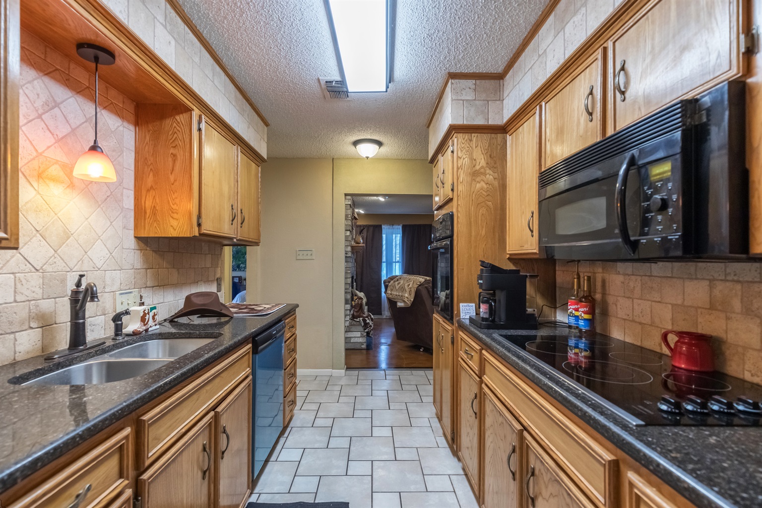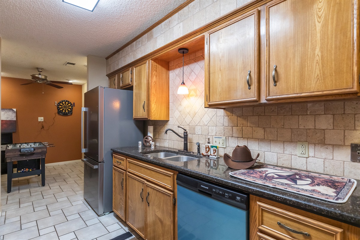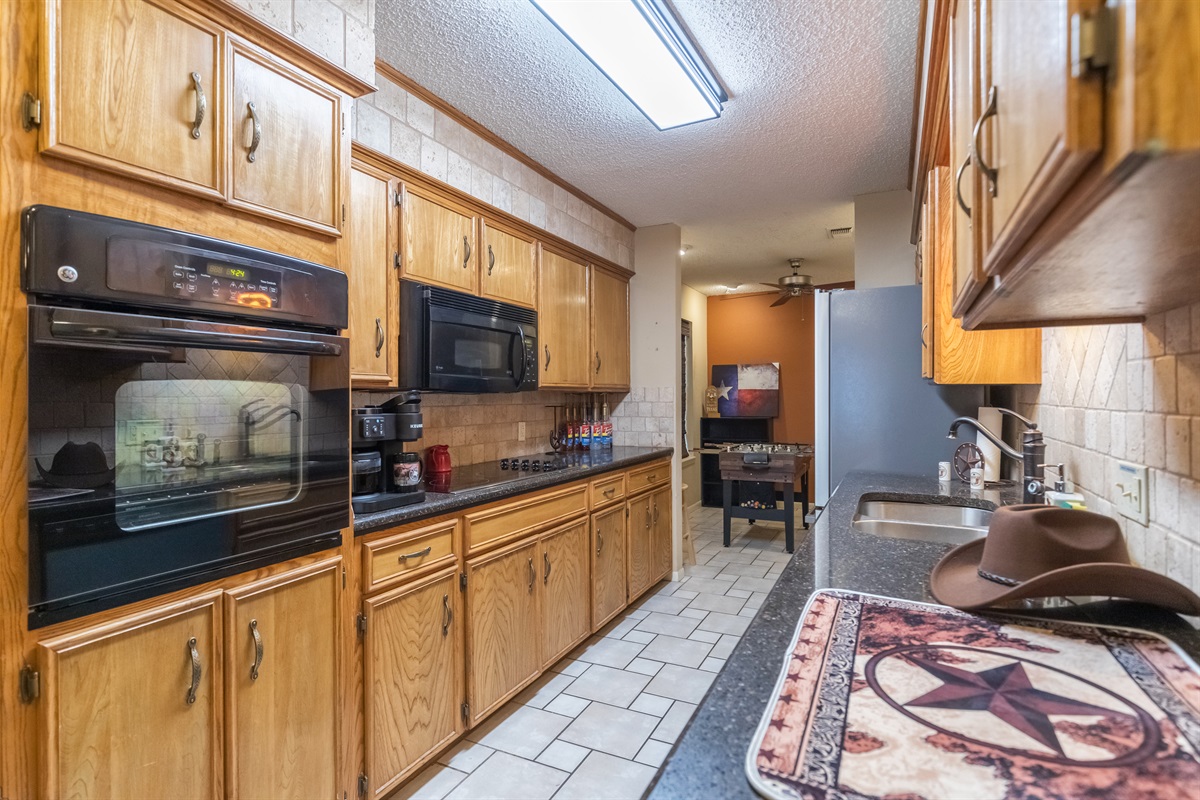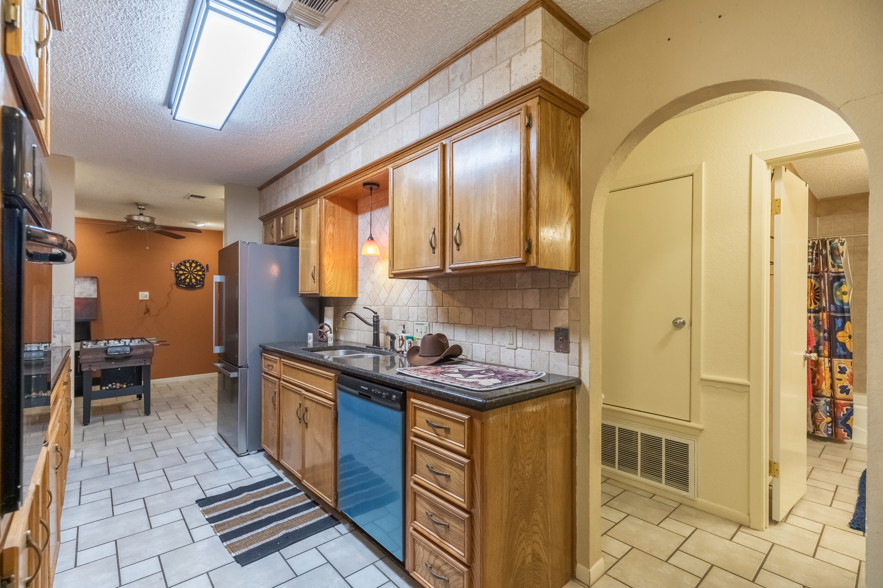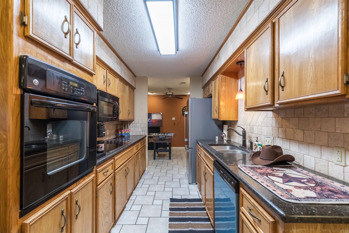 A full galley kitchen loaded with everything a home cook needs — wall oven, microwave, dishwasher, full-size stainless refrigerator, and dark granite countertops. Wood cabinetry with ample storage, tile backsplash, and that perfect touch of Texas personality (yes, there's a cowboy hat above the sink). Fully stocked with cookware, dishes, and utensils.