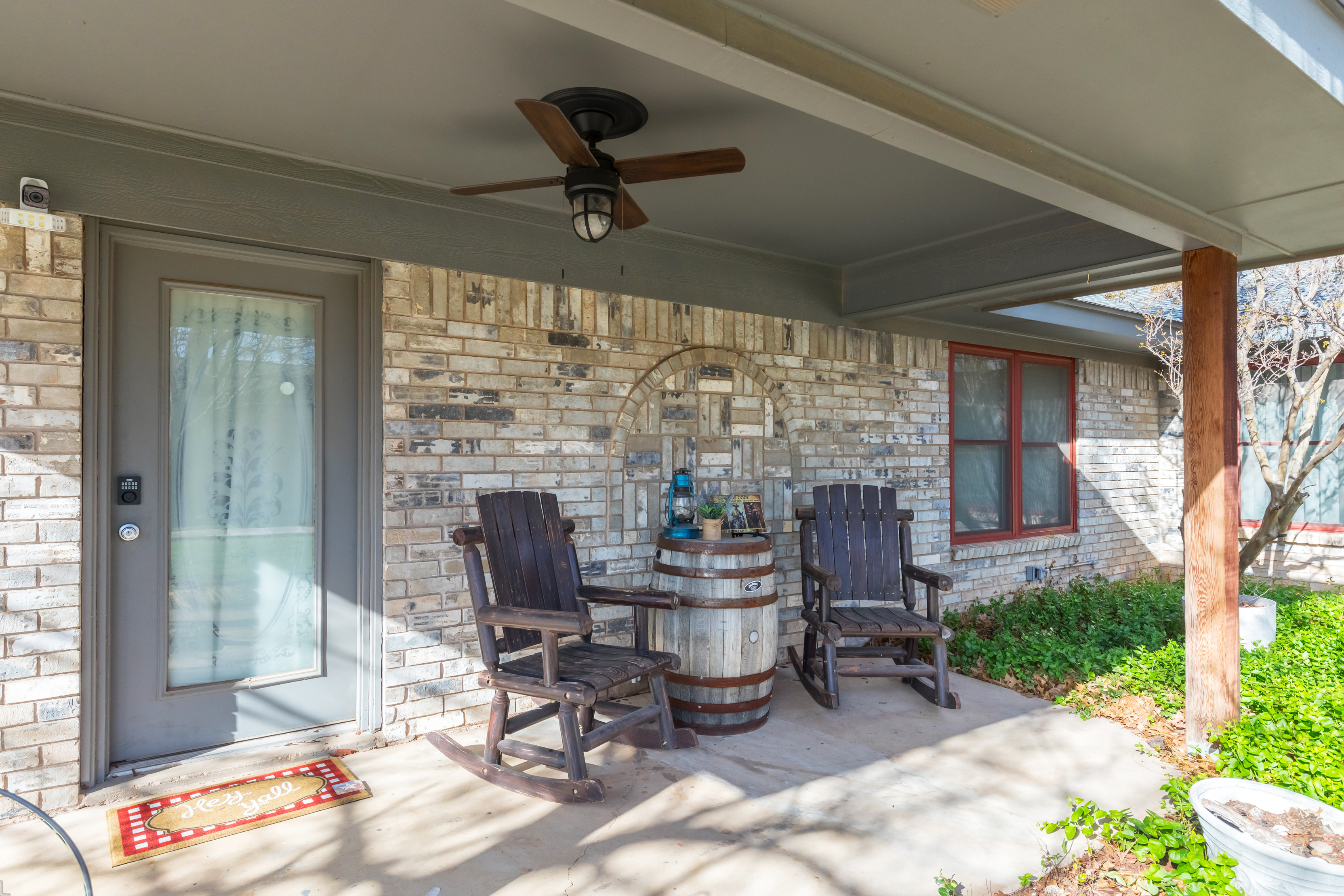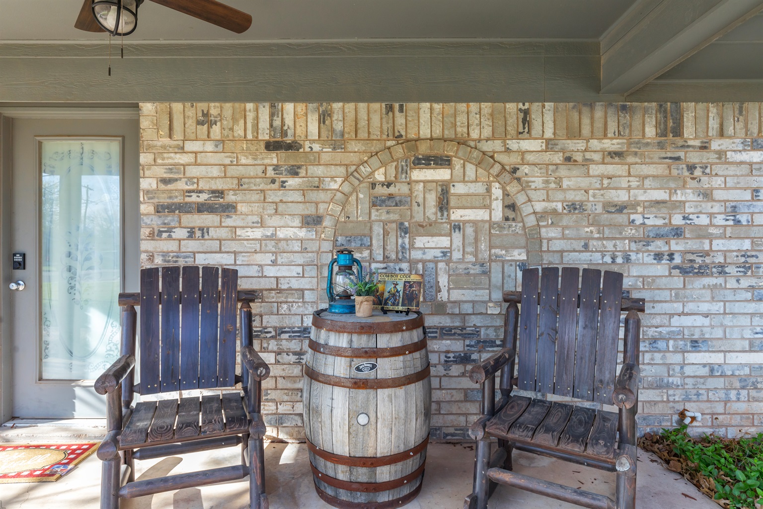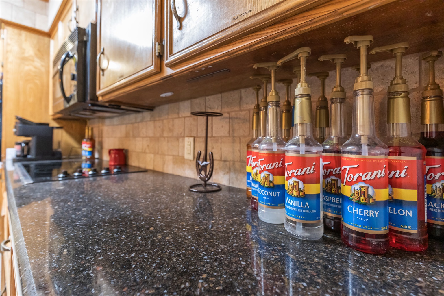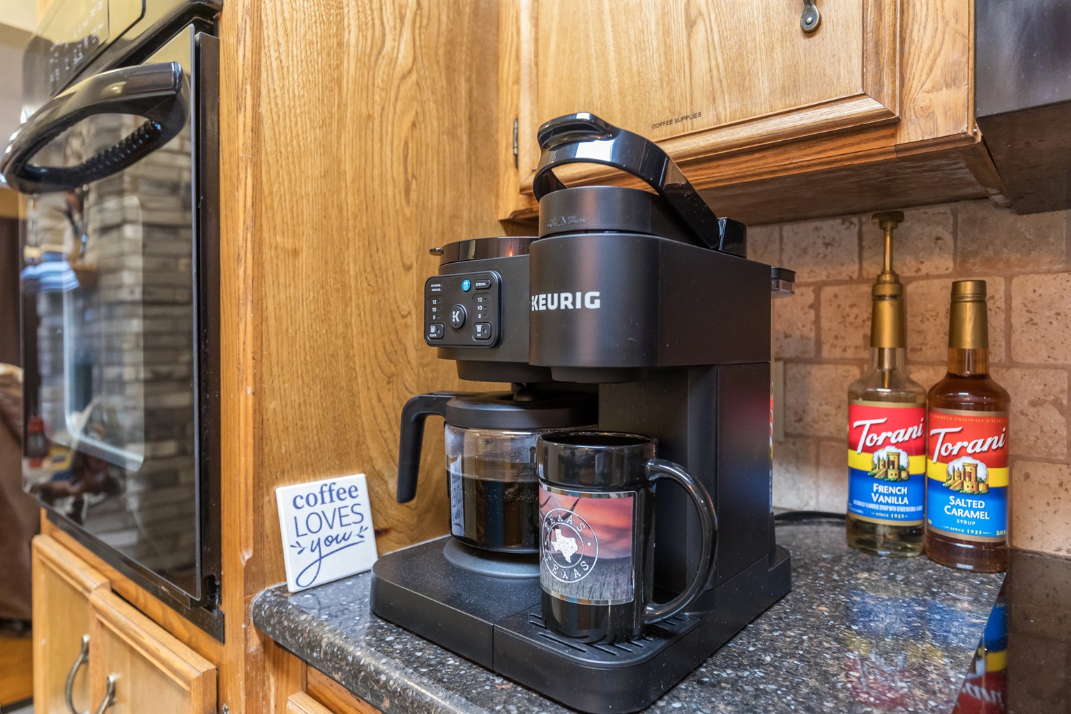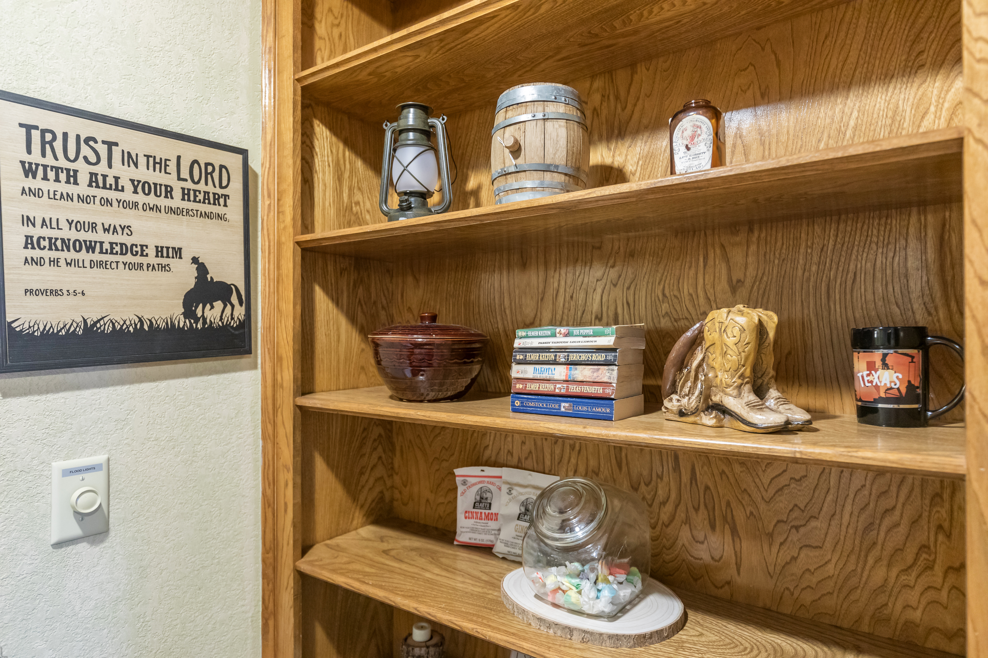 A full galley kitchen loaded with everything a home cook needs — wall oven, microwave, dishwasher, full-size stainless refrigerator, and dark granite countertops. Wood cabinetry with ample storage, tile backsplash, and that perfect touch of Texas personality (yes, there's a cowboy hat above the sink). Fully stocked with cookware, dishes, and utensils.