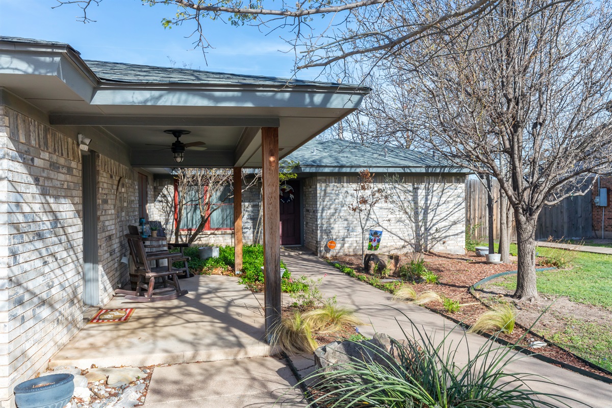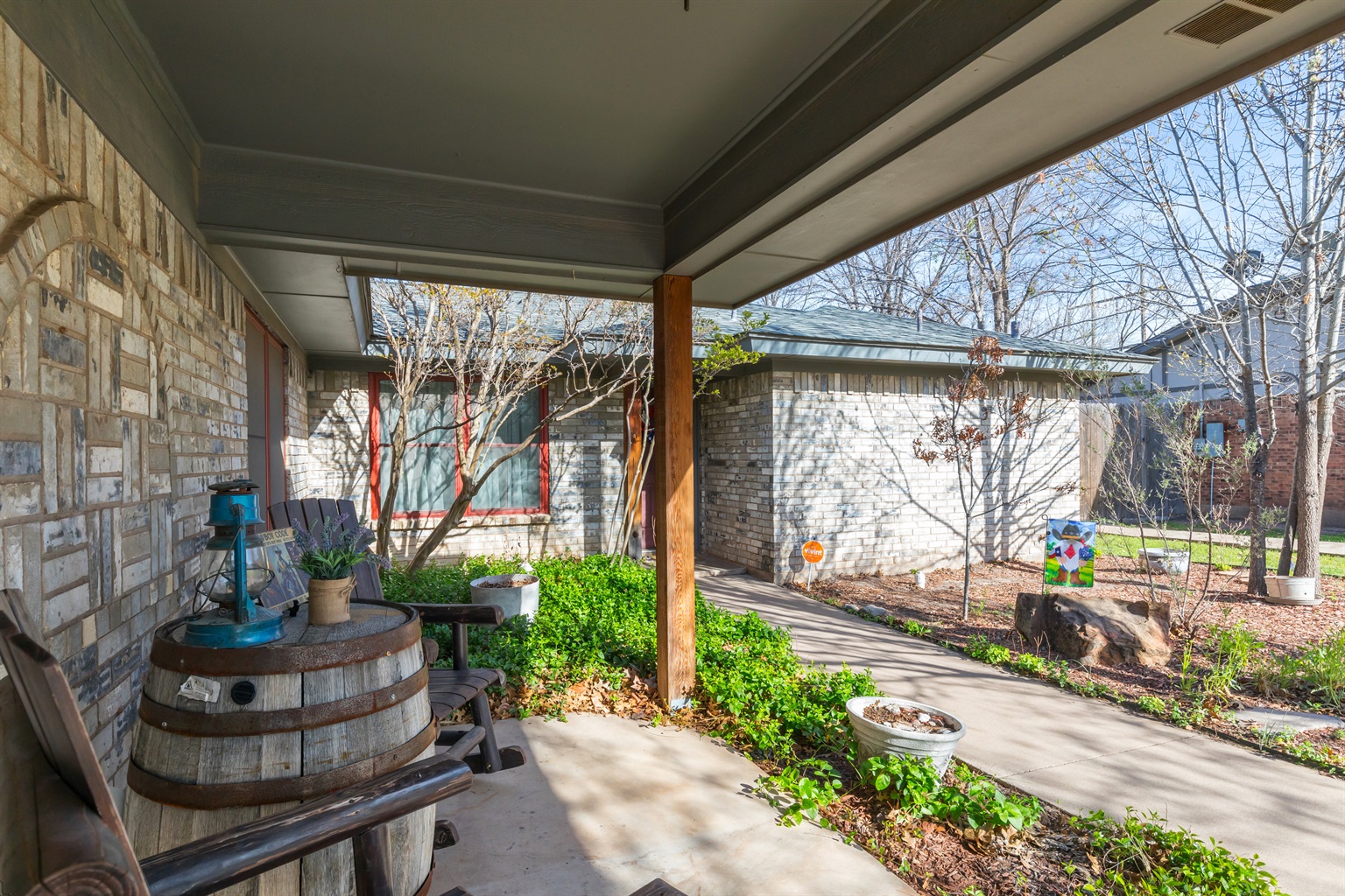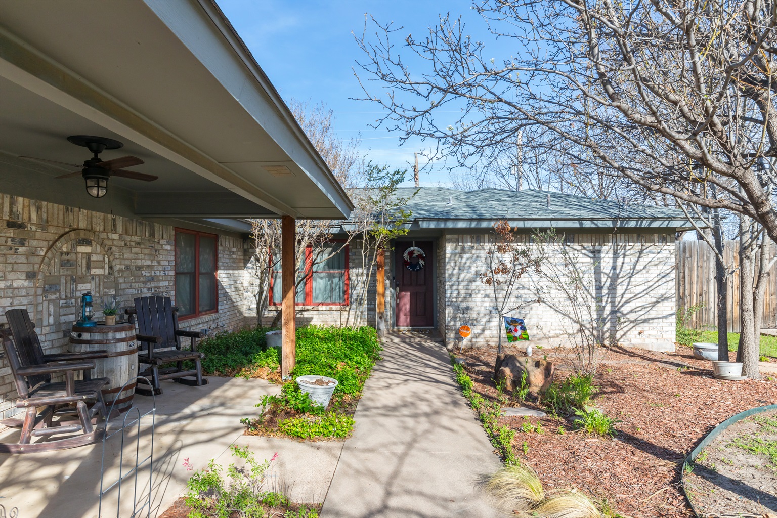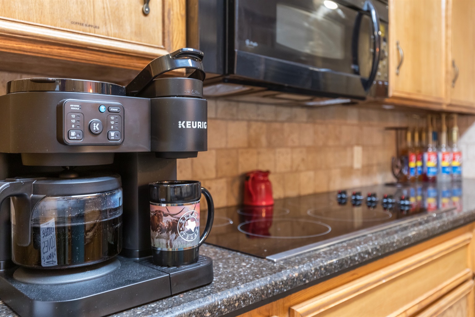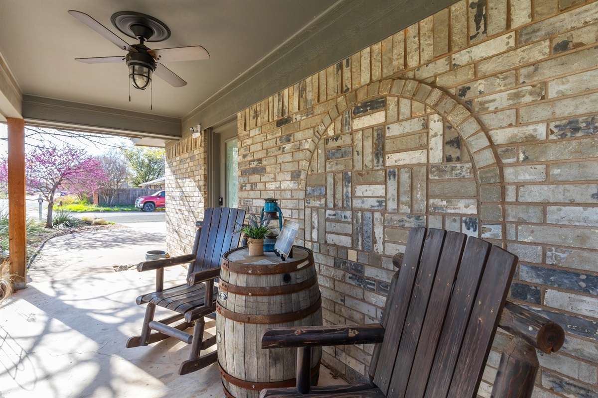 A full galley kitchen loaded with everything a home cook needs — wall oven, microwave, dishwasher, full-size stainless refrigerator, and dark granite countertops. Wood cabinetry with ample storage, tile backsplash, and that perfect touch of Texas personality (yes, there's a cowboy hat above the sink). Fully stocked with cookware, dishes, and utensils.