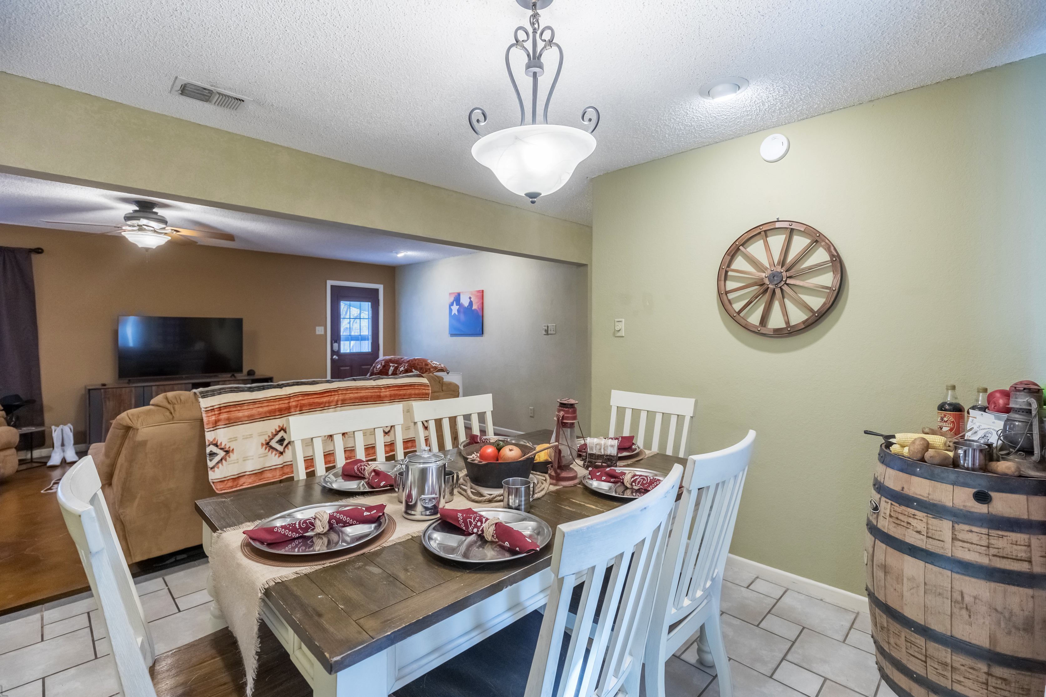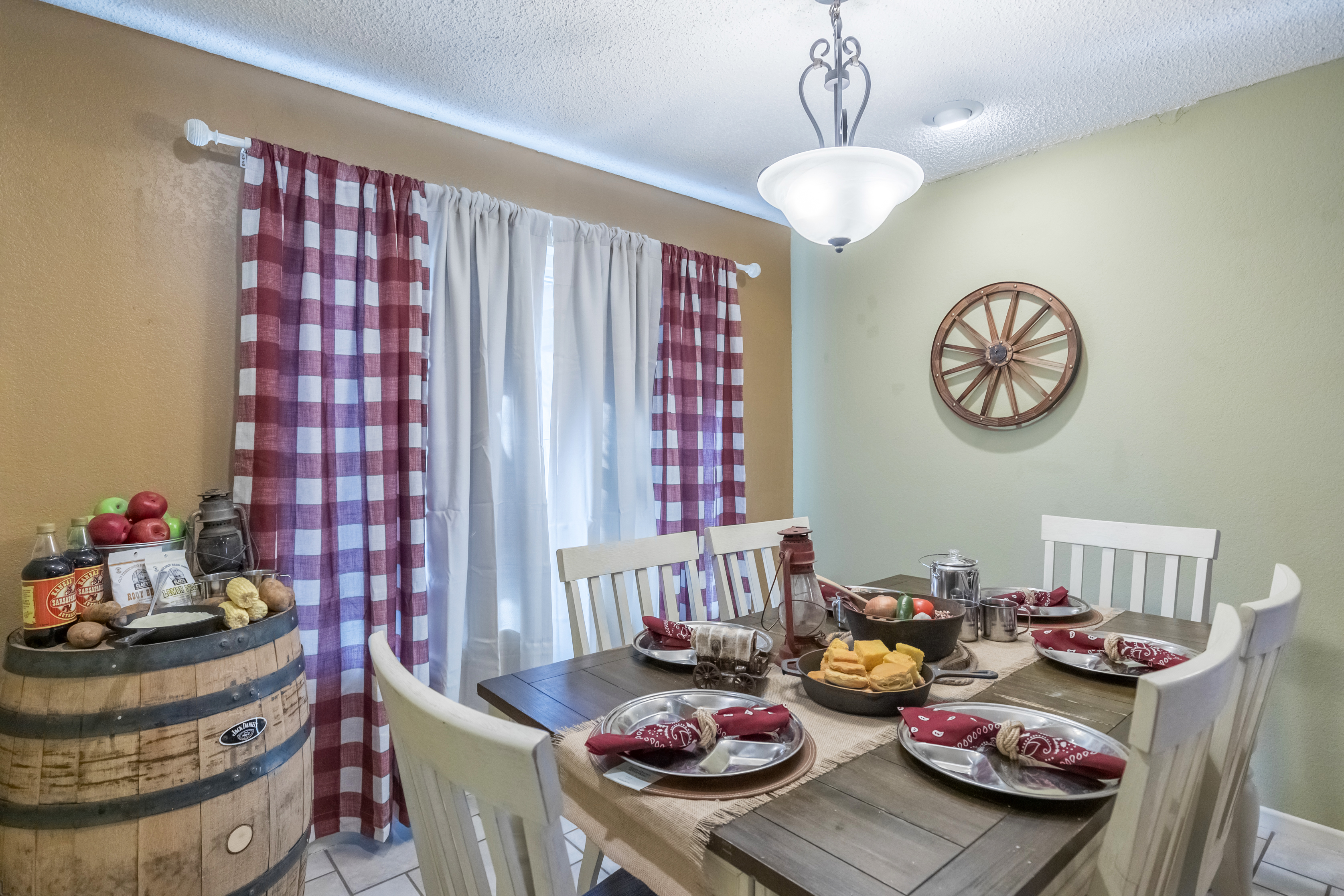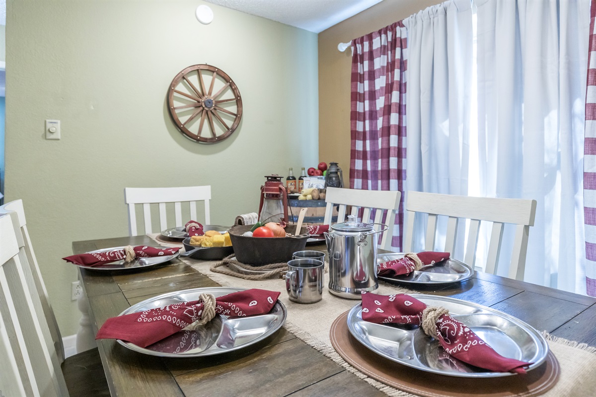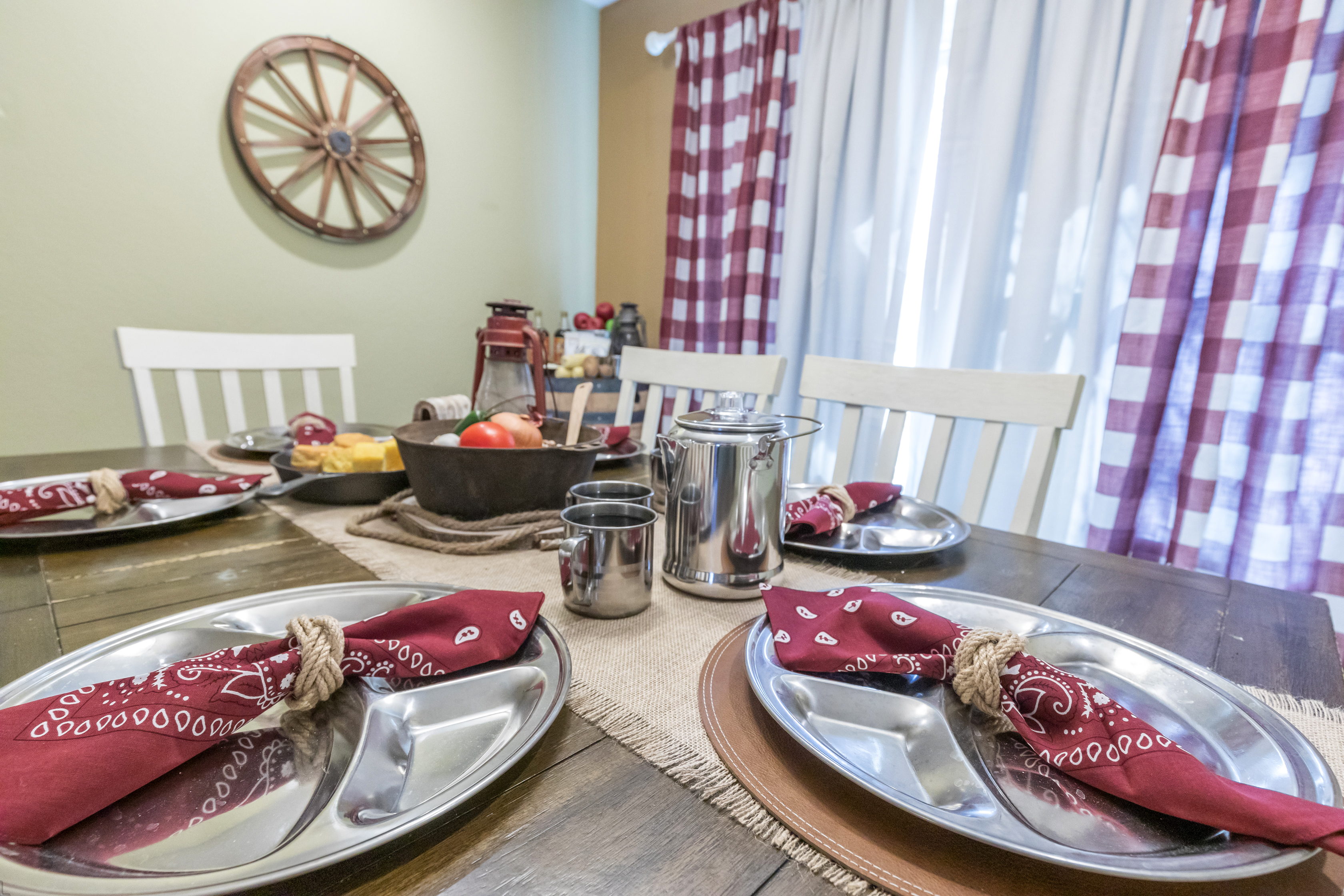 Seats 6 comfortably at a farmhouse-style dark wood table with white shaker chairs. Wagon wheel wall décor, buffalo check drapes, and a wrought-iron chandelier set the scene for a real Texas supper. We've even set the table cowboy style — tin plates, bandana napkins, and a cast-iron skillet centerpiece.