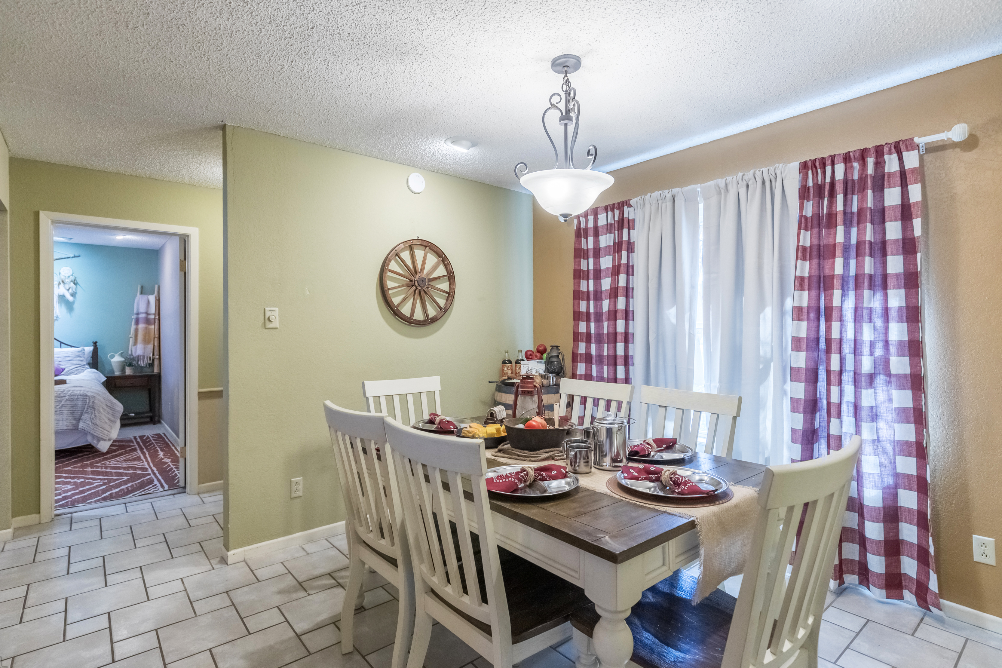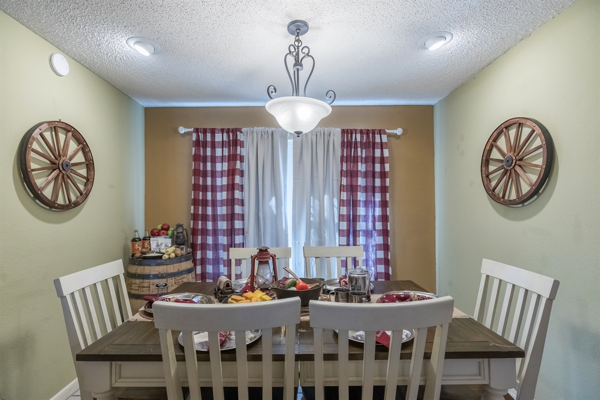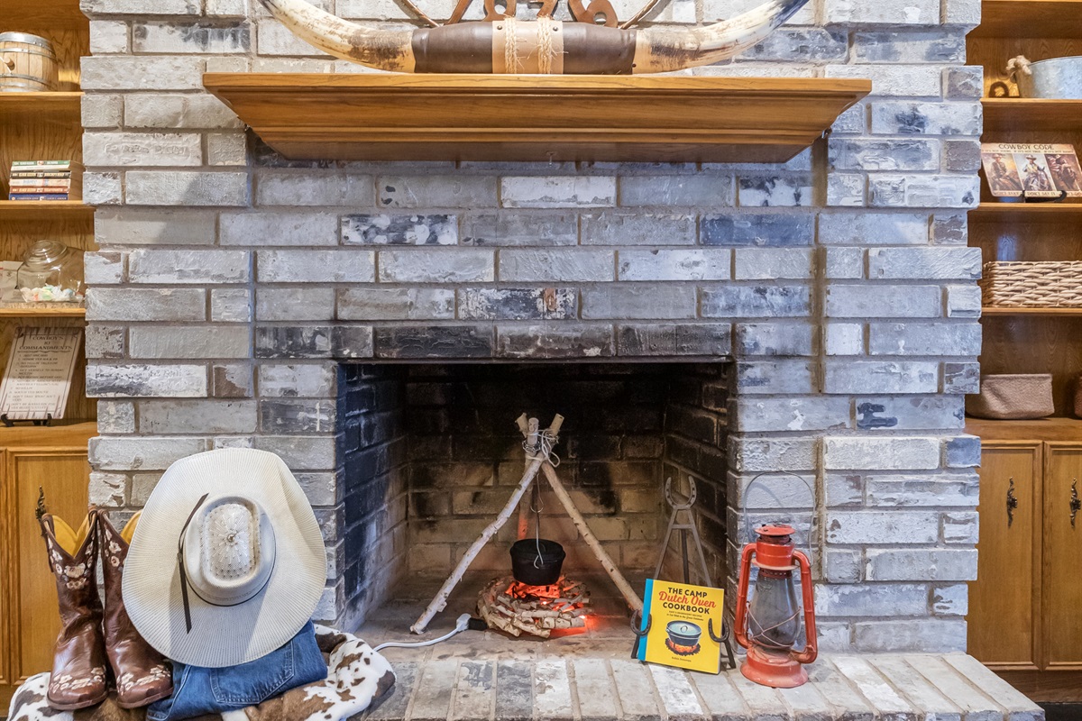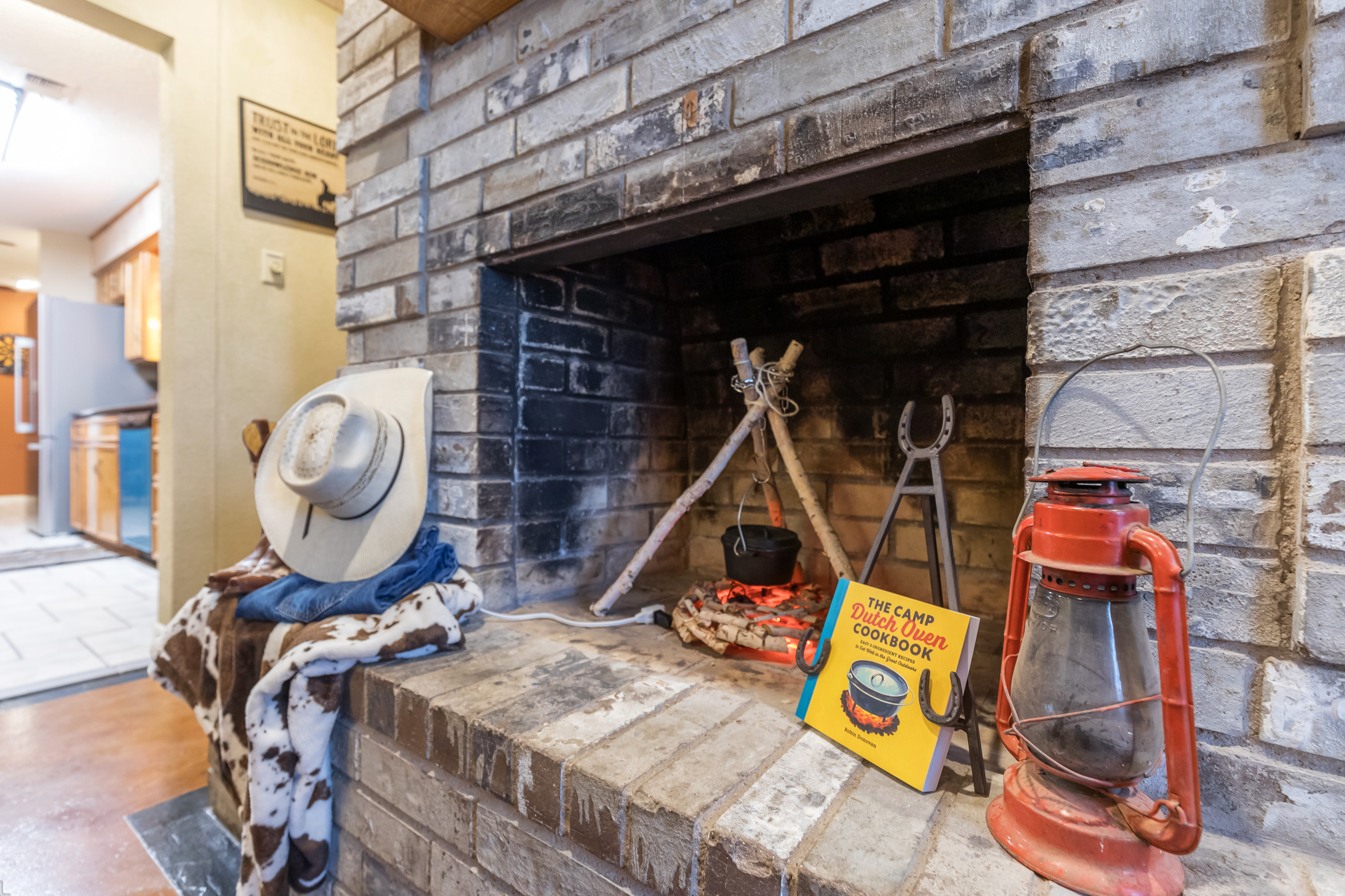 Seats 6 comfortably at a farmhouse-style dark wood table with white shaker chairs. Wagon wheel wall décor, buffalo check drapes, and a wrought-iron chandelier set the scene for a real Texas supper. We've even set the table cowboy style — tin plates, bandana napkins, and a cast-iron skillet centerpiece.