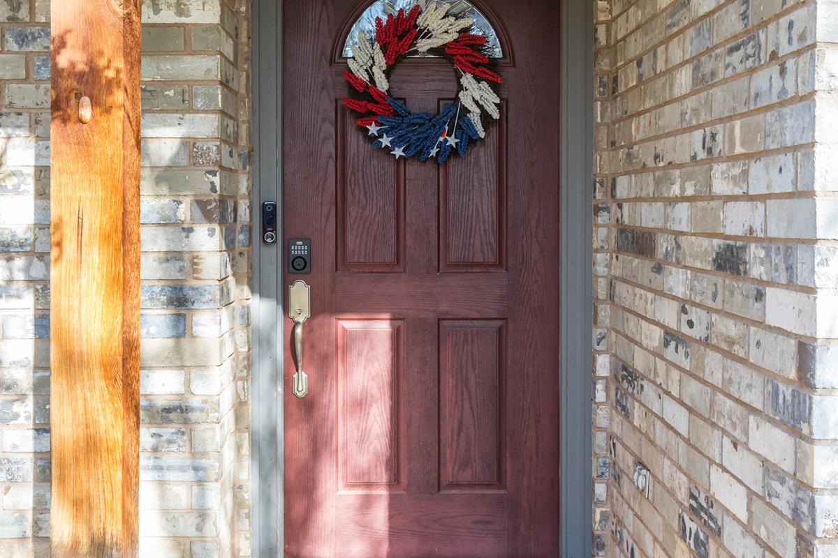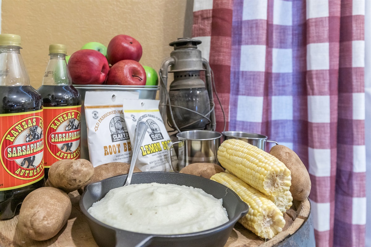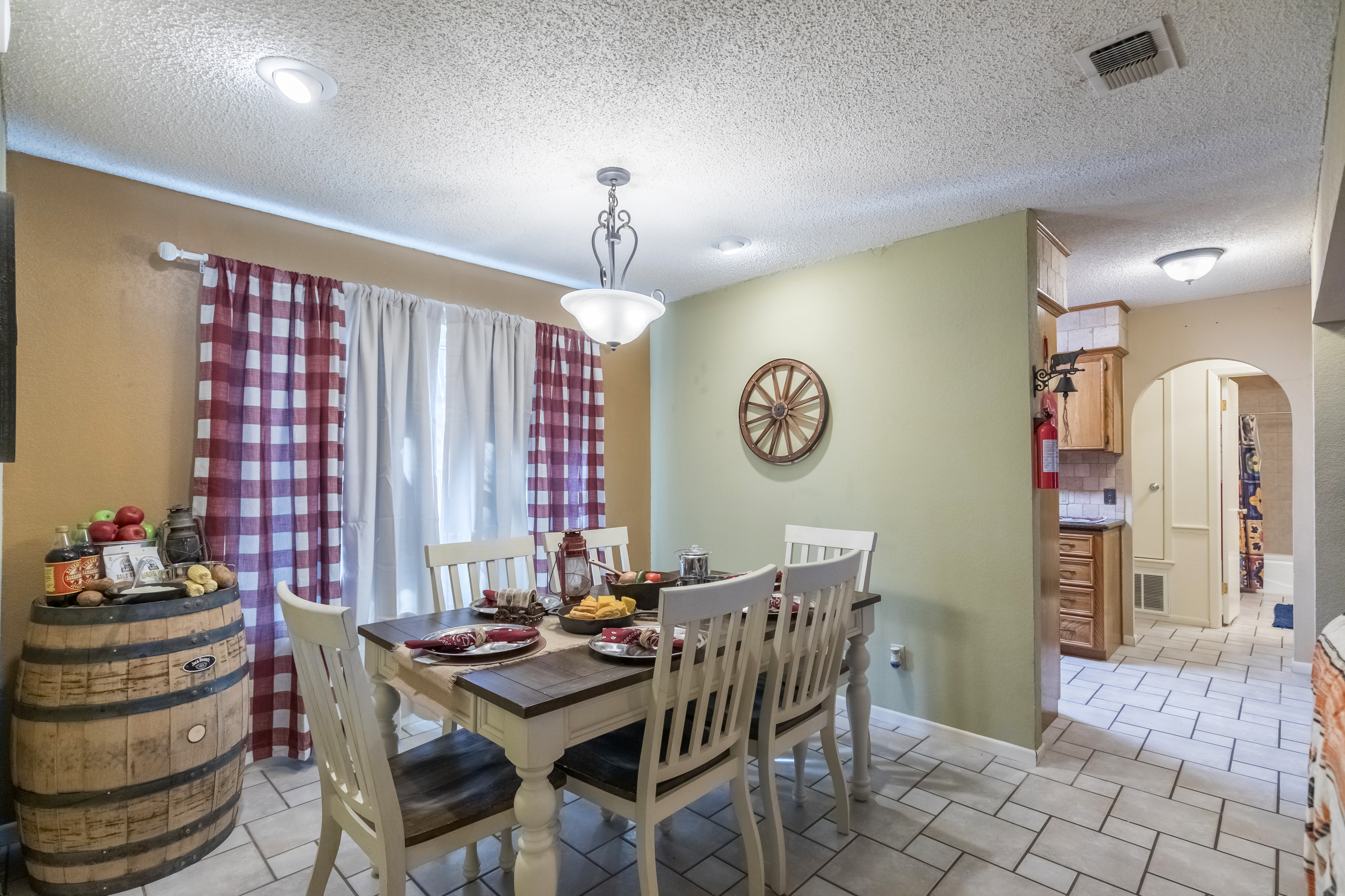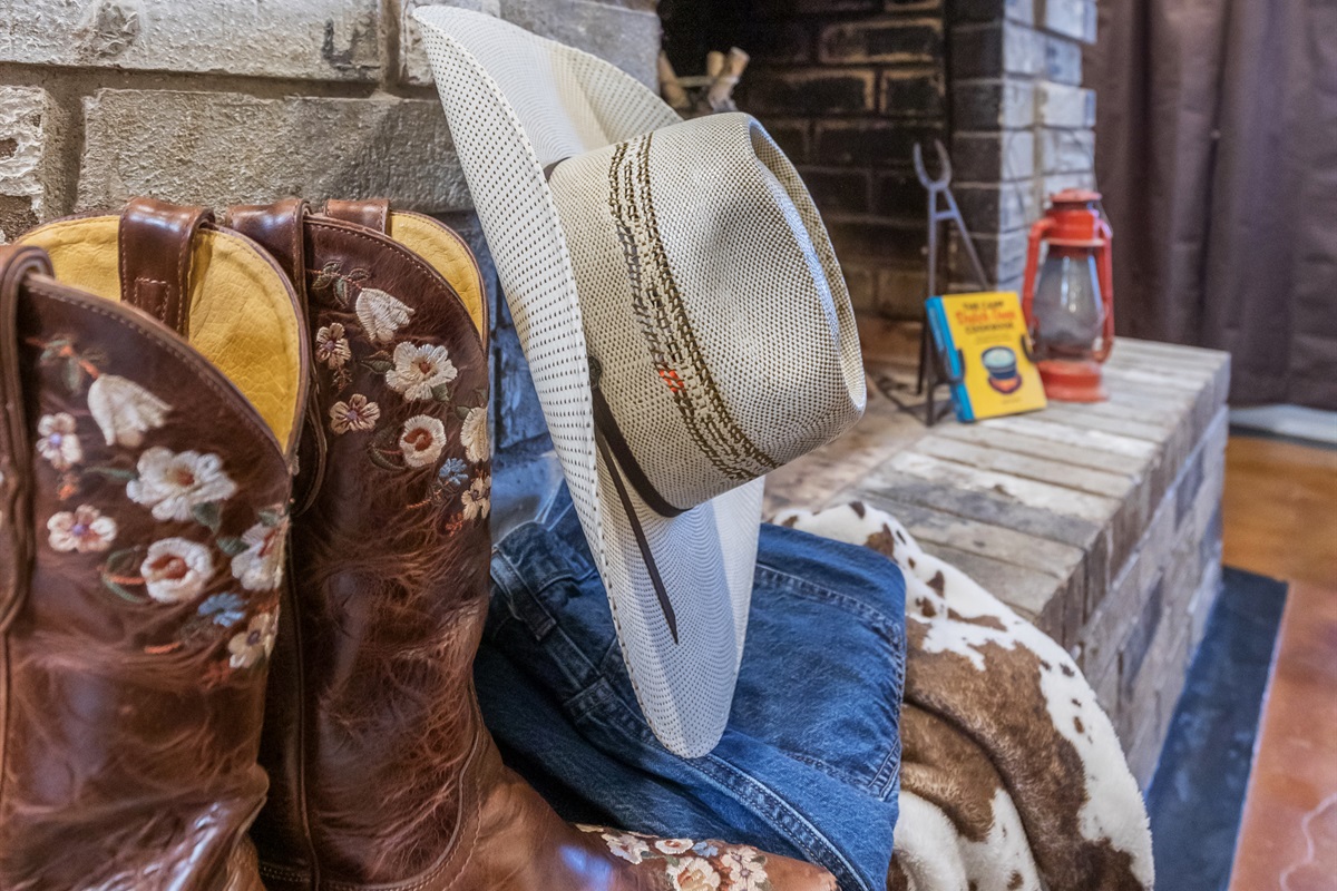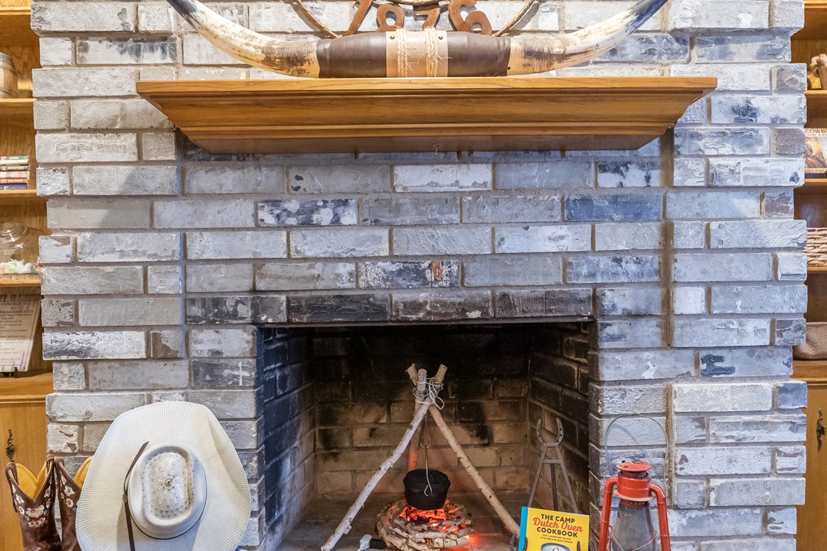 Seats 6 comfortably at a farmhouse-style dark wood table with white shaker chairs. Wagon wheel wall décor, buffalo check drapes, and a wrought-iron chandelier set the scene for a real Texas supper. We've even set the table cowboy style — tin plates, bandana napkins, and a cast-iron skillet centerpiece.