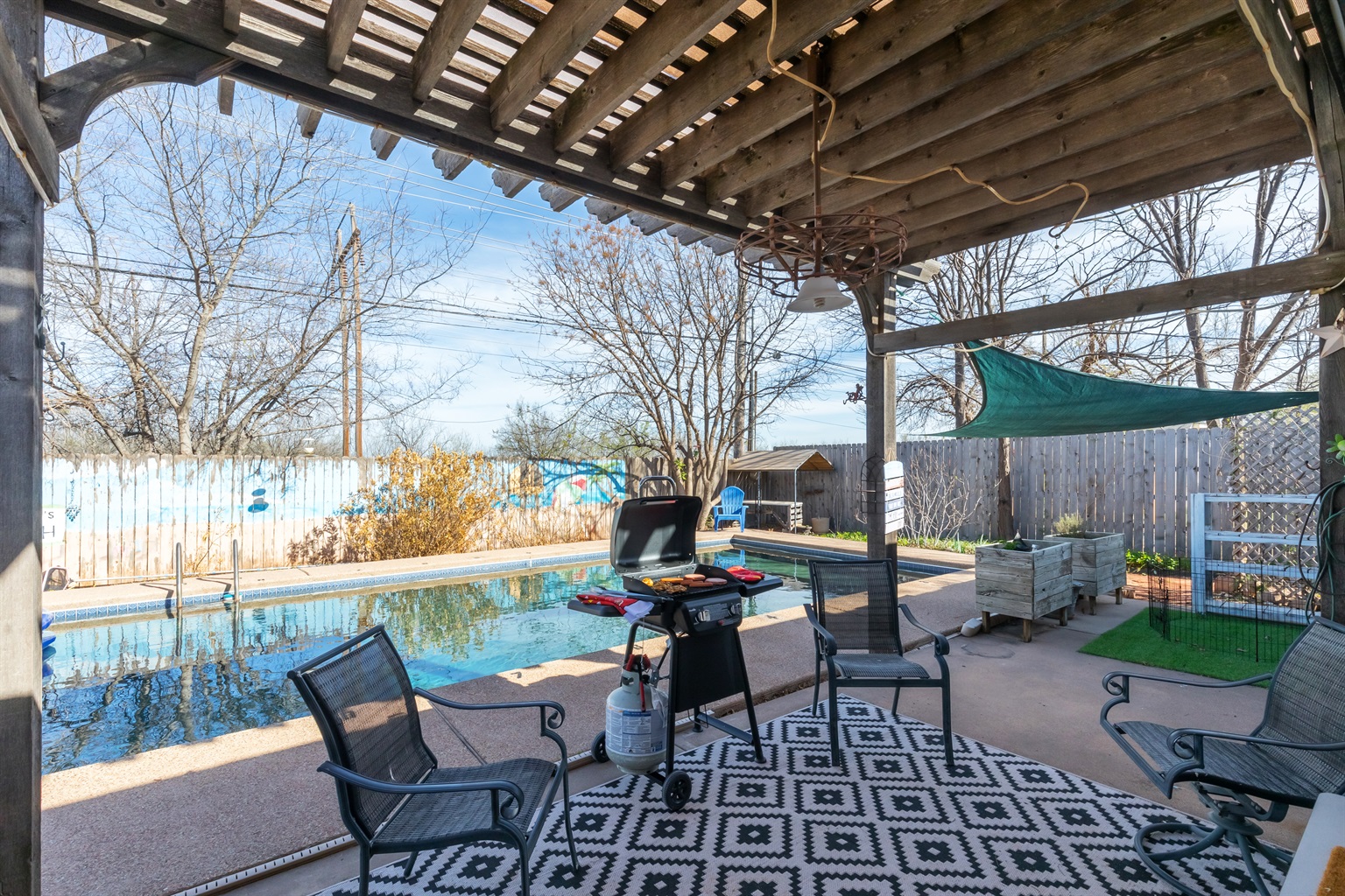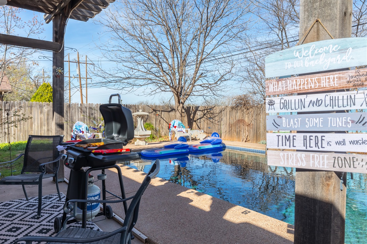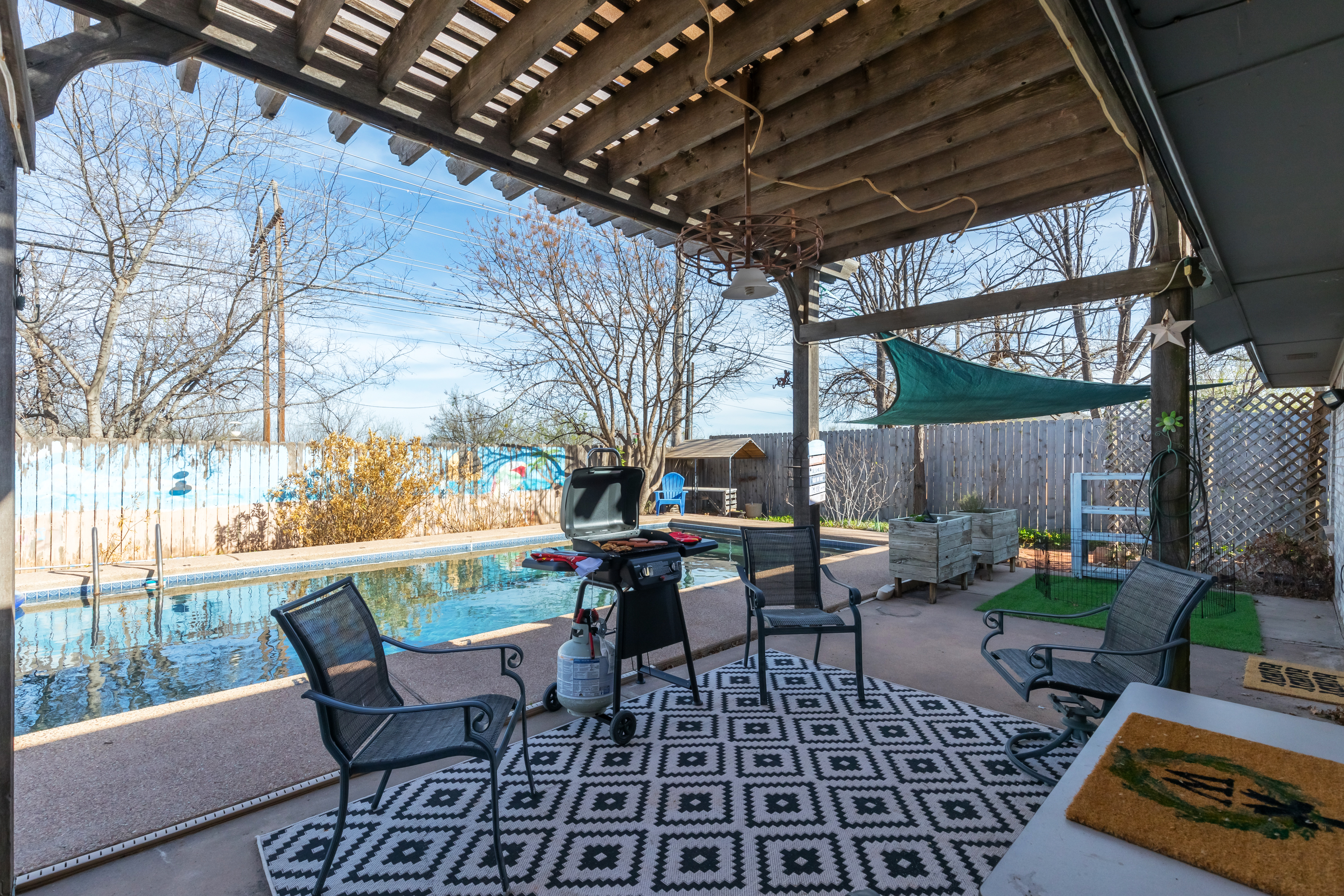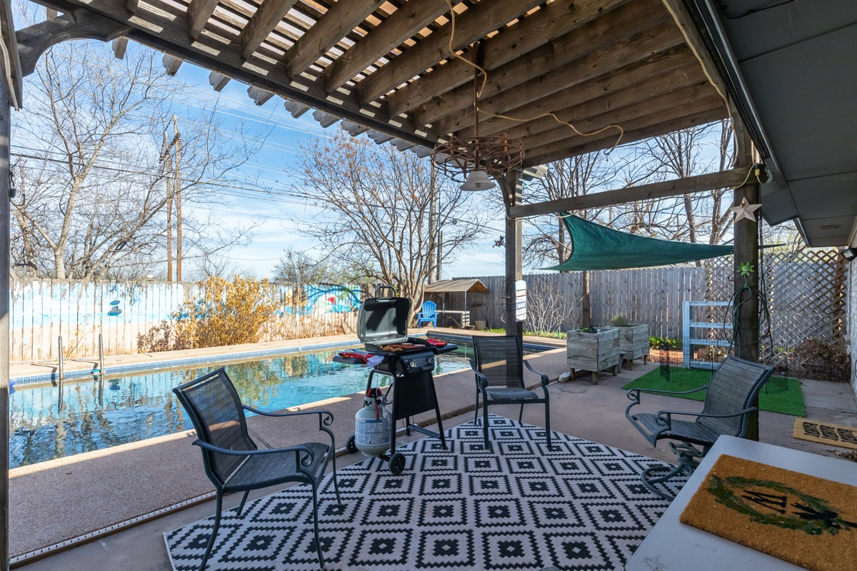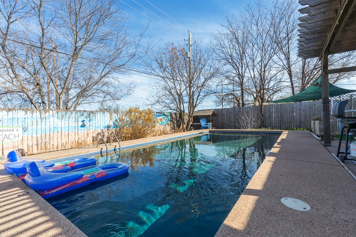 Step outside to your own private oasis: a beautiful in-ground pool with sun shelf and pool floats, a pergola-covered patio with a charcoal grill and outdoor dining, plus raised garden beds along the fence. Fully fenced yard for privacy. Towels provided.