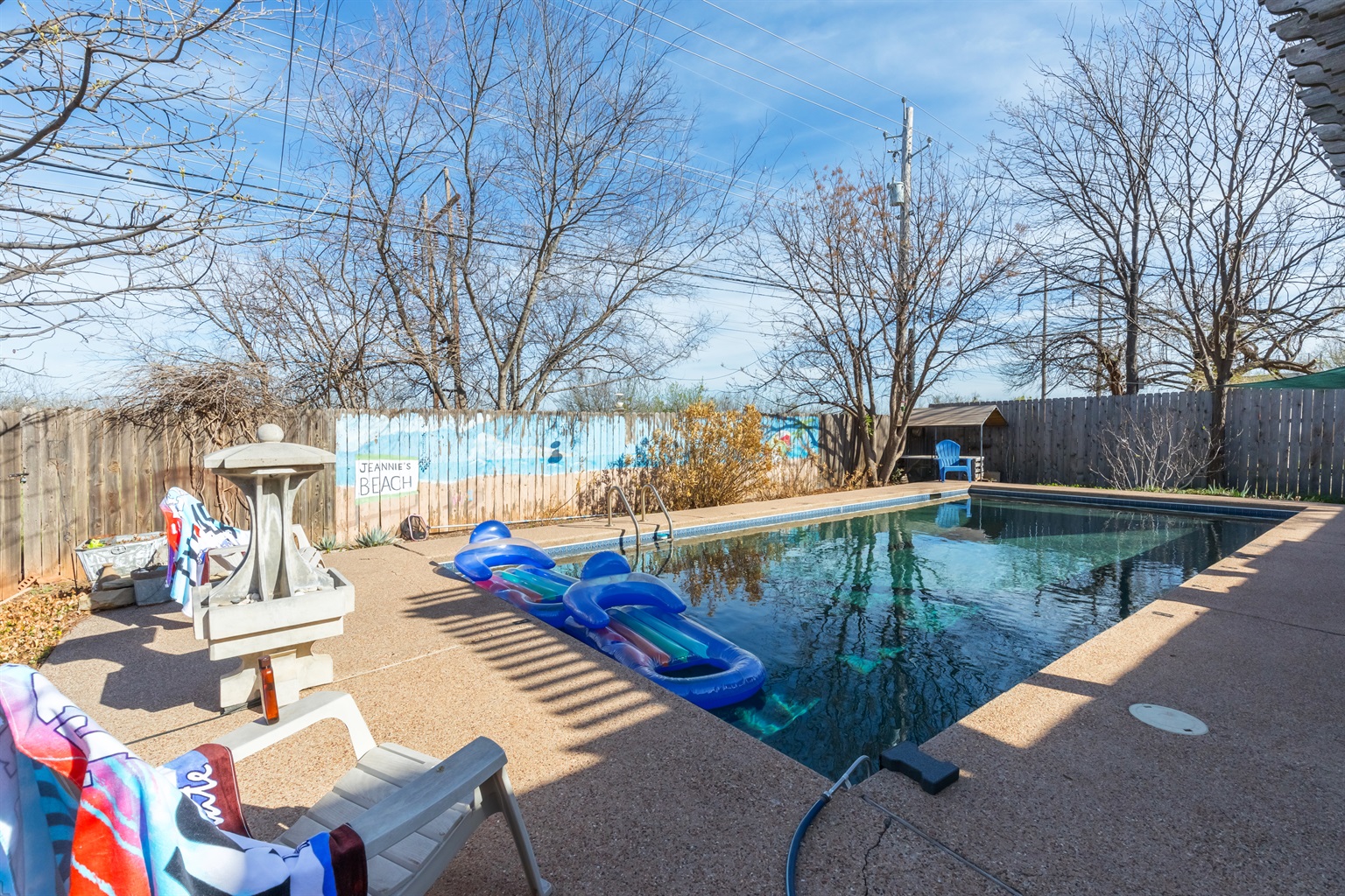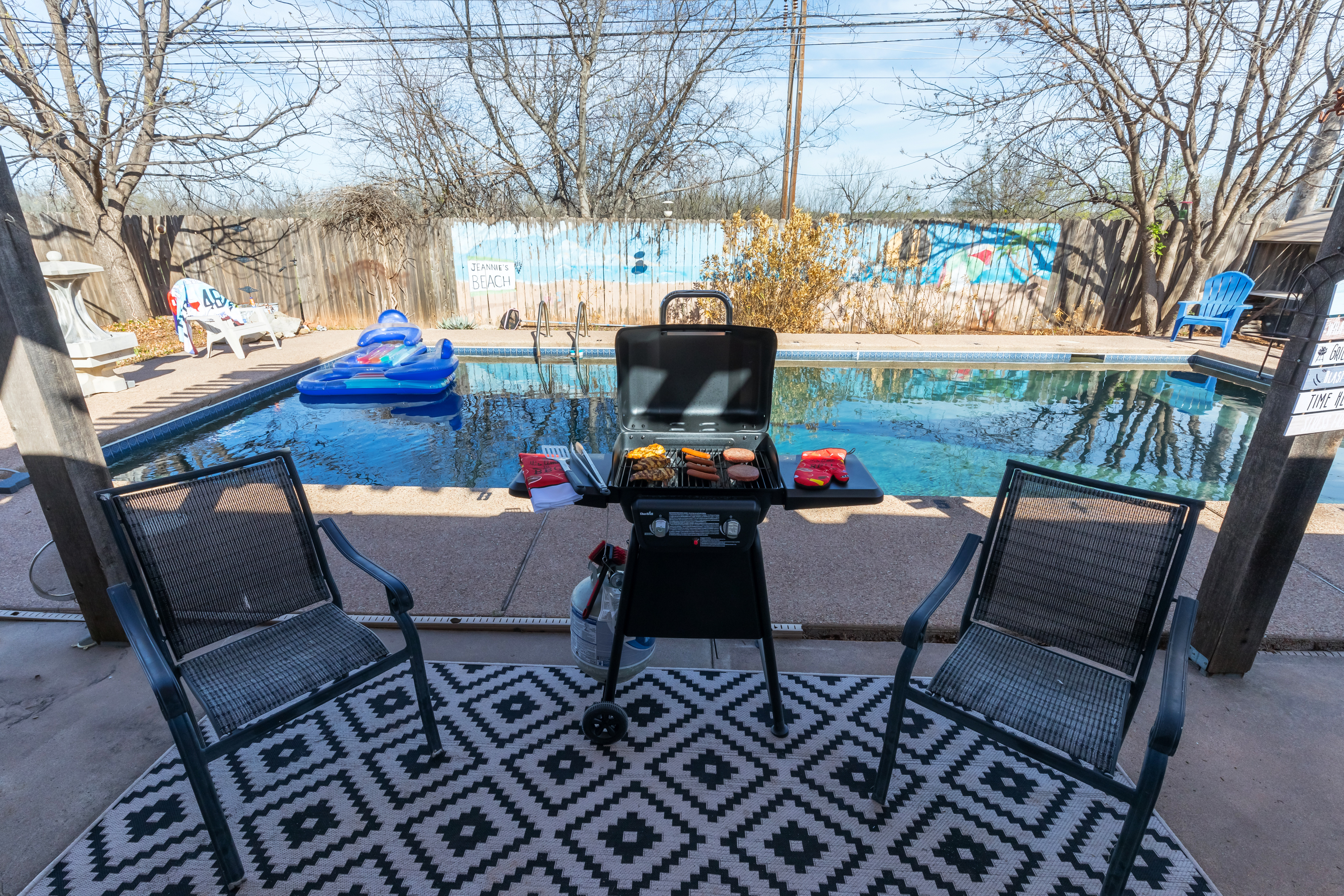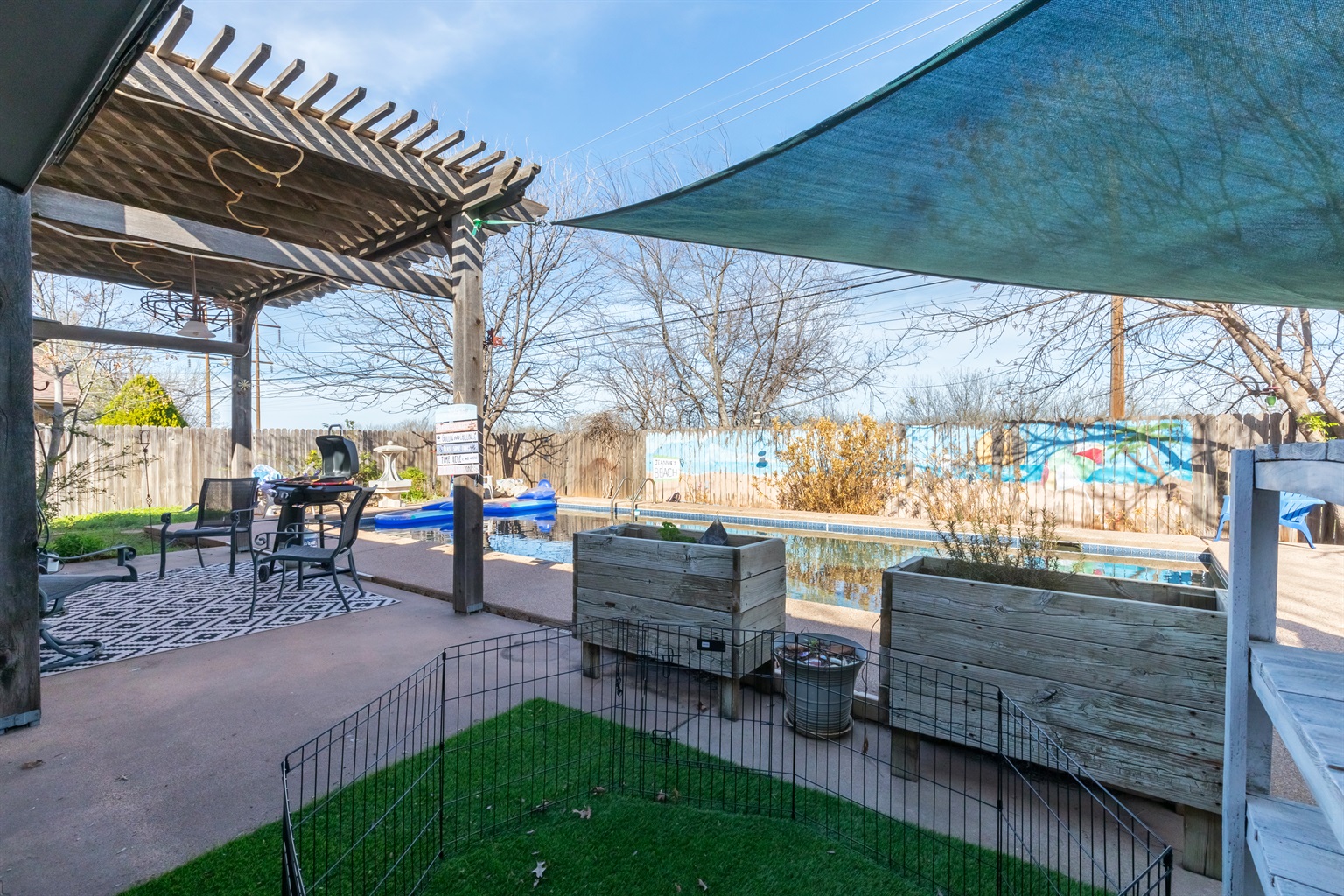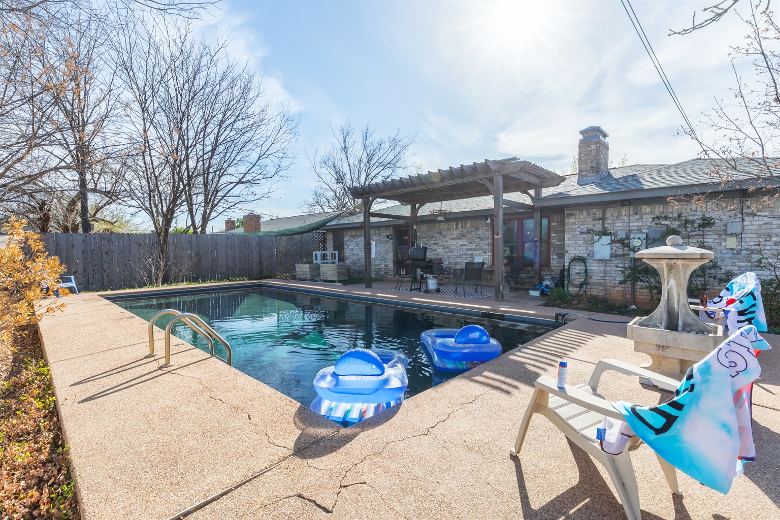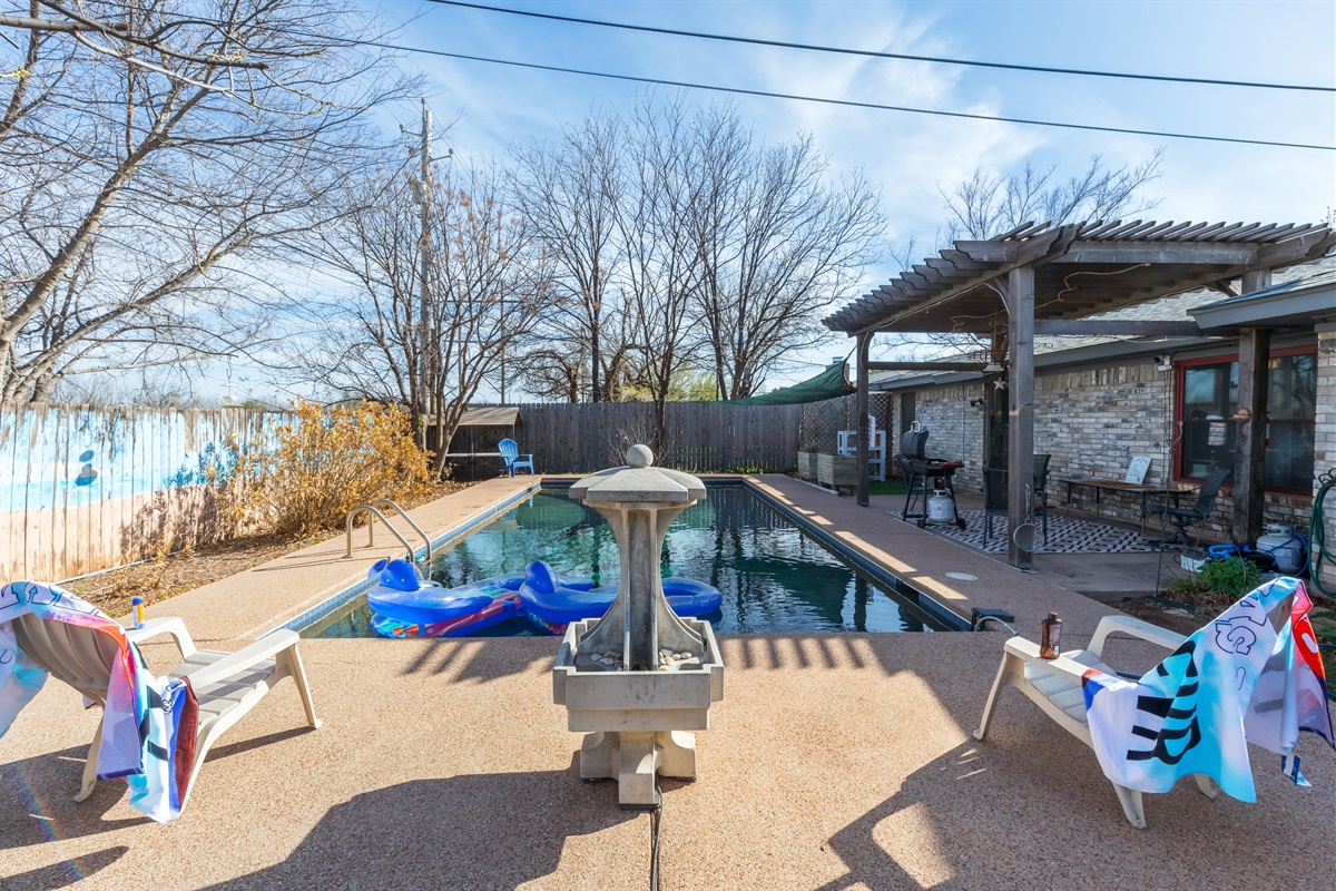 Step outside to your own private oasis: a beautiful in-ground pool with sun shelf and pool floats, a pergola-covered patio with a charcoal grill and outdoor dining, plus raised garden beds along the fence. Fully fenced yard for privacy. Towels provided.