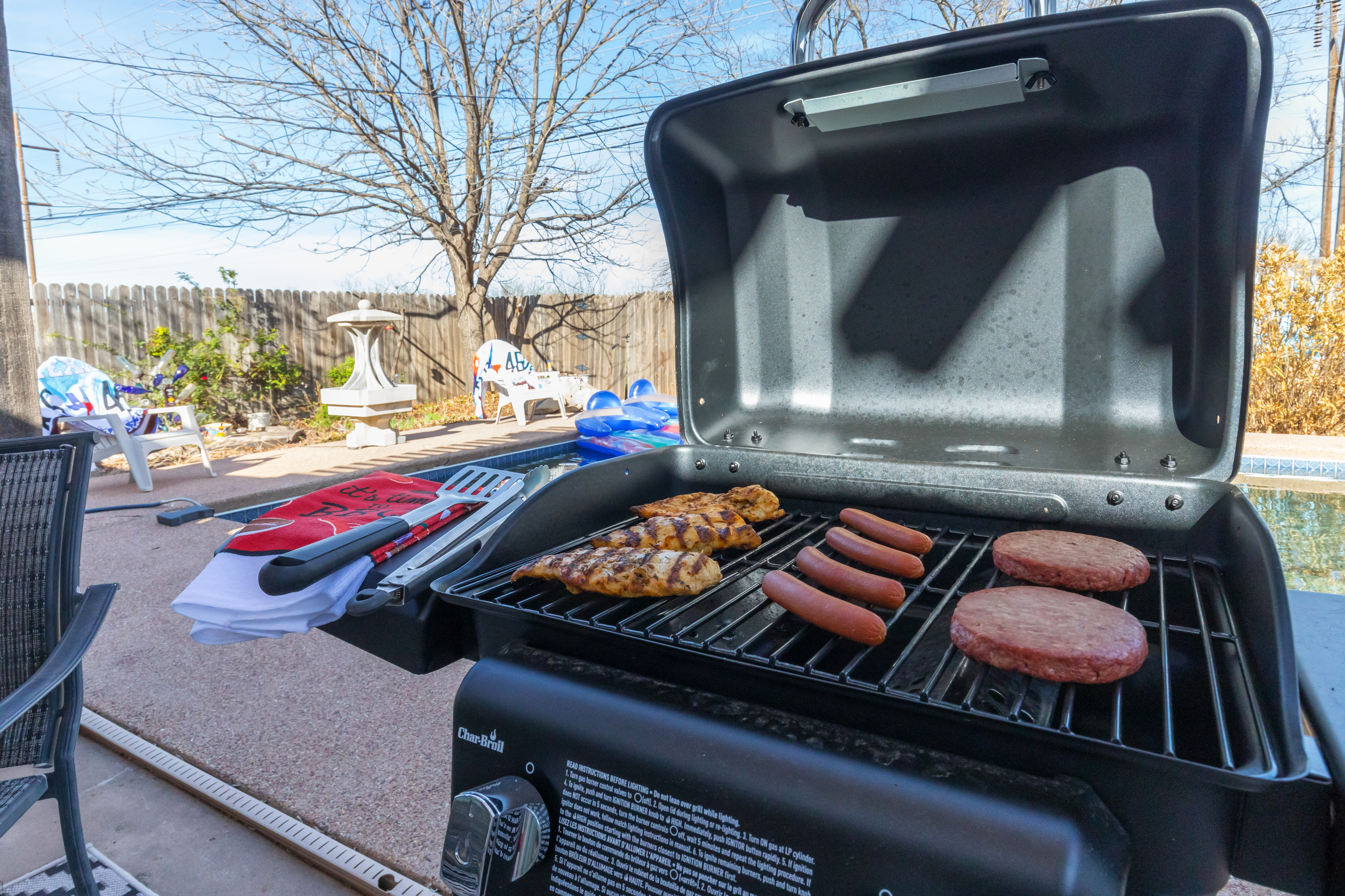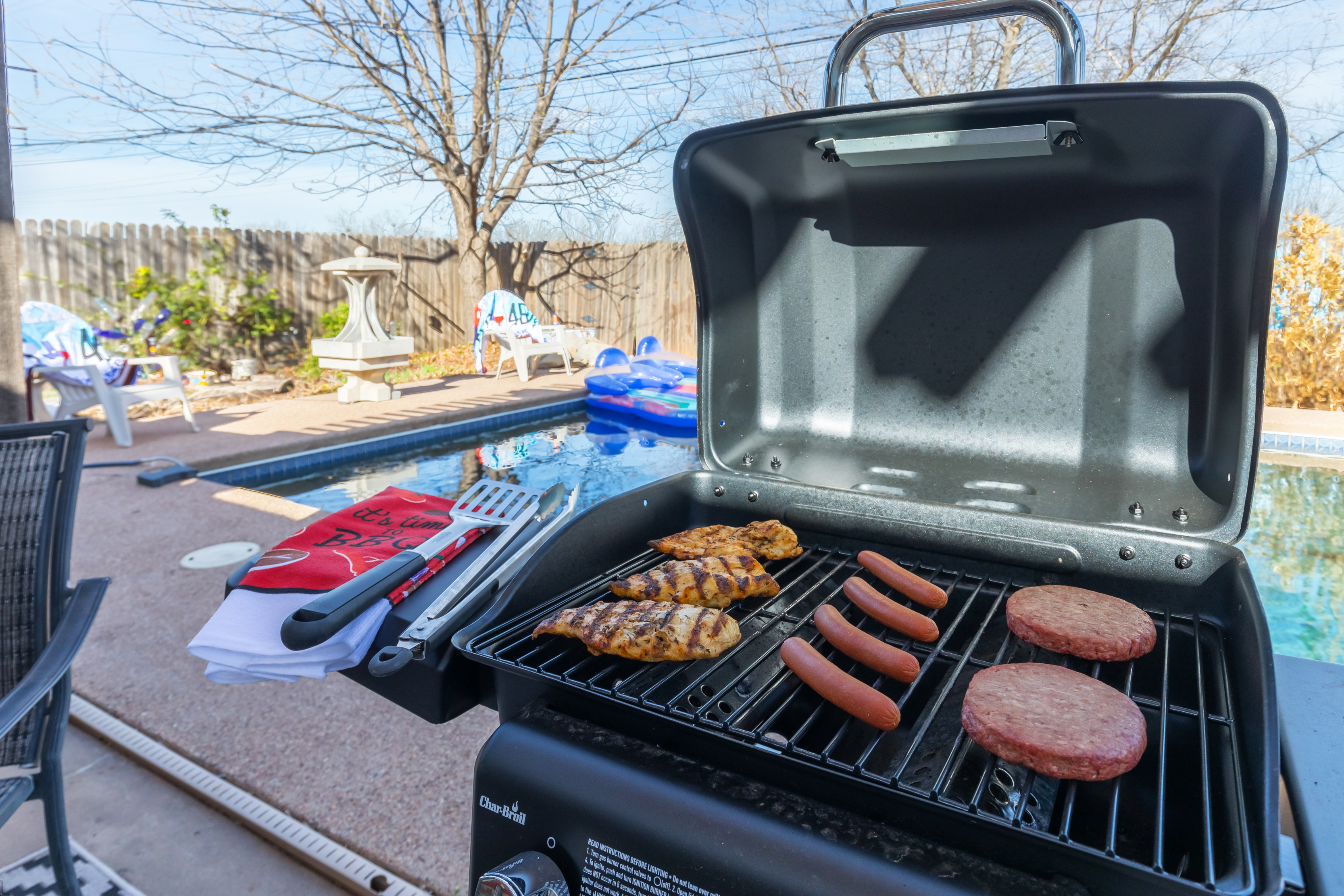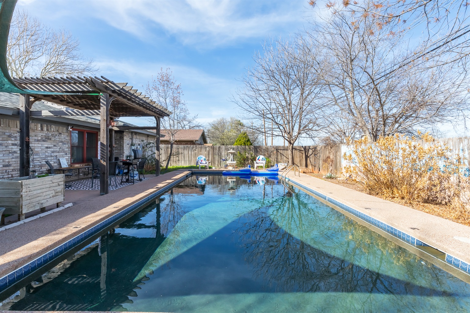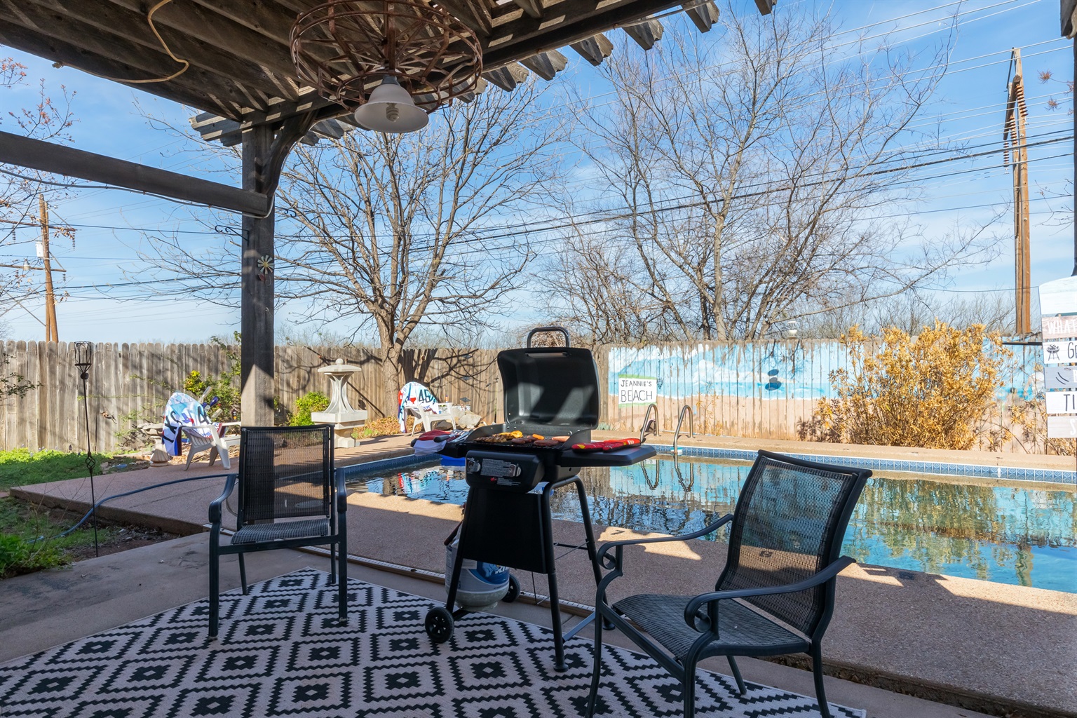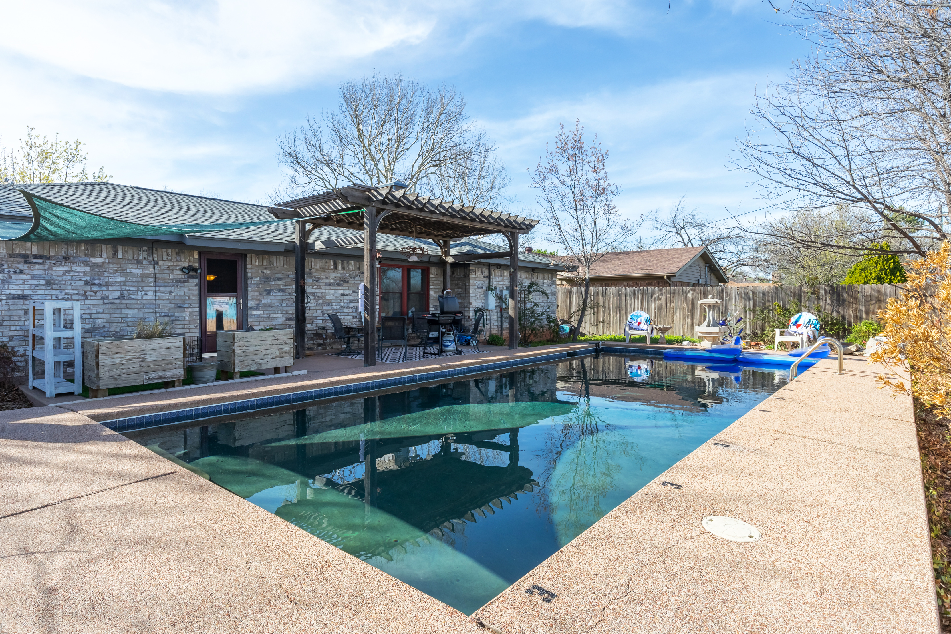 Step outside to your own private oasis: a beautiful in-ground pool with sun shelf and pool floats, a pergola-covered patio with a charcoal grill and outdoor dining, plus raised garden beds along the fence. Fully fenced yard for privacy. Towels provided.