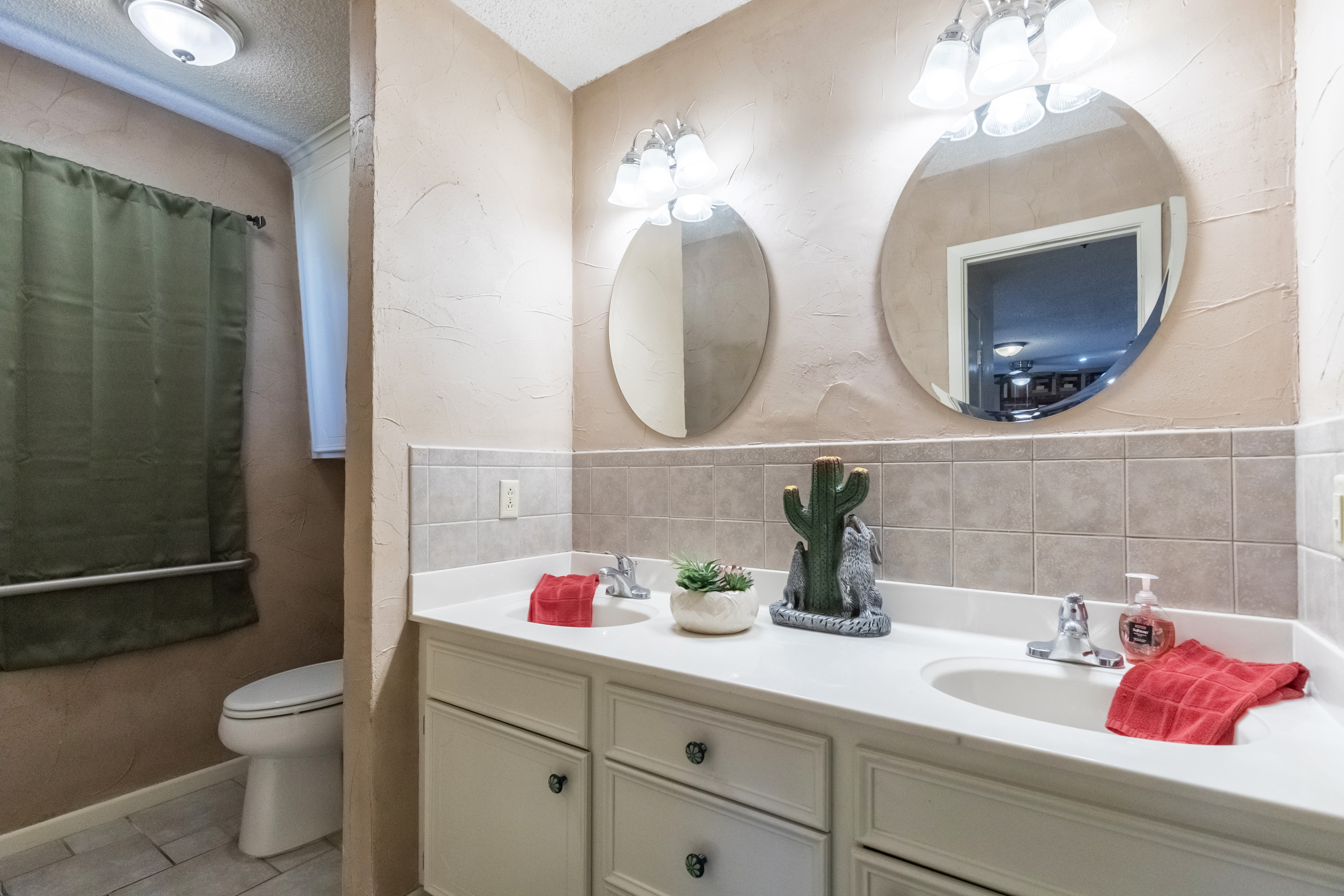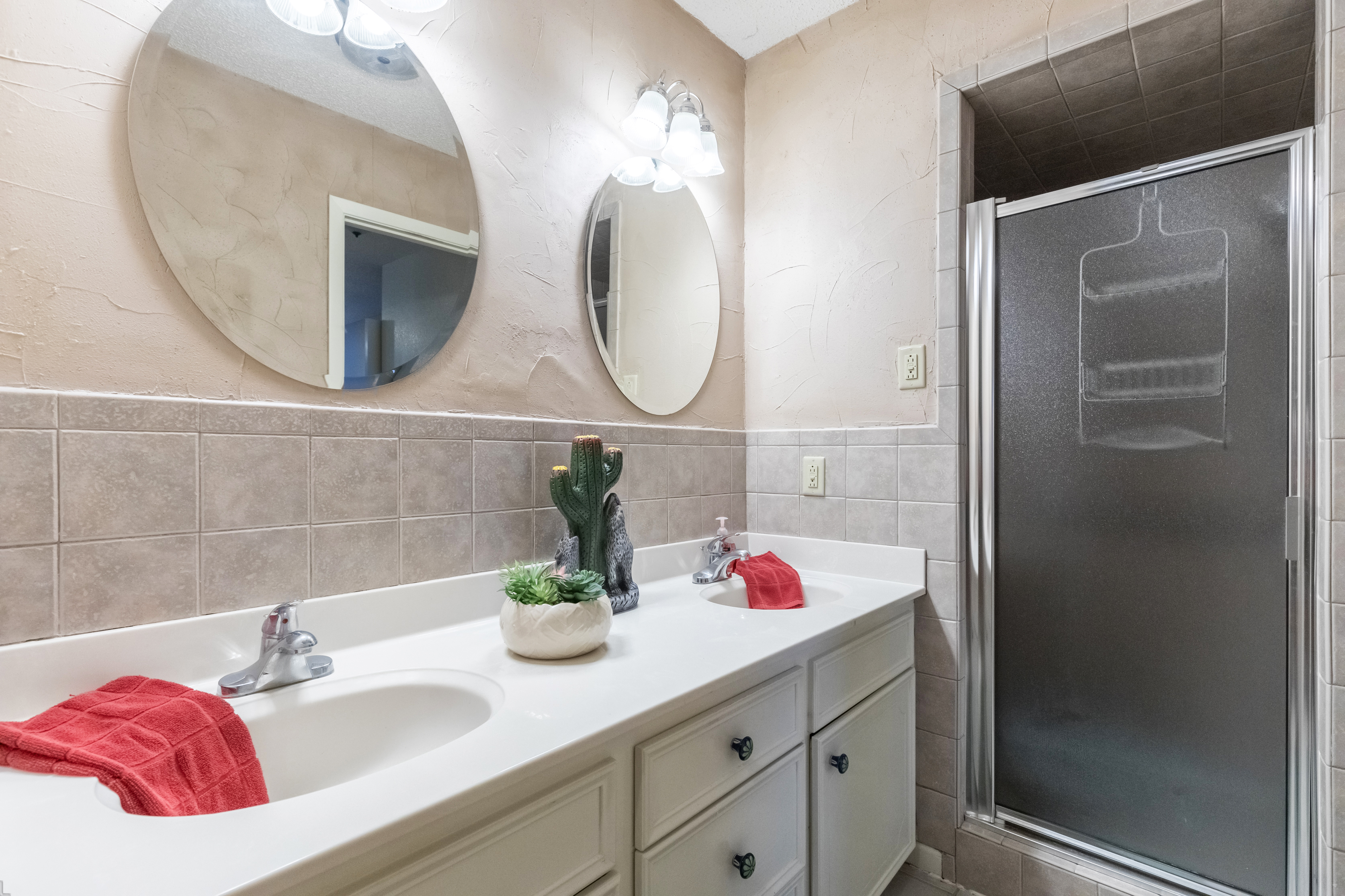 Bathroom 2 (Master En-Suite): Double-sink vanity with dual round mirrors, a walk-in tiled shower with glass door, and cactus-themed accents. No waiting — this suite is all yours.